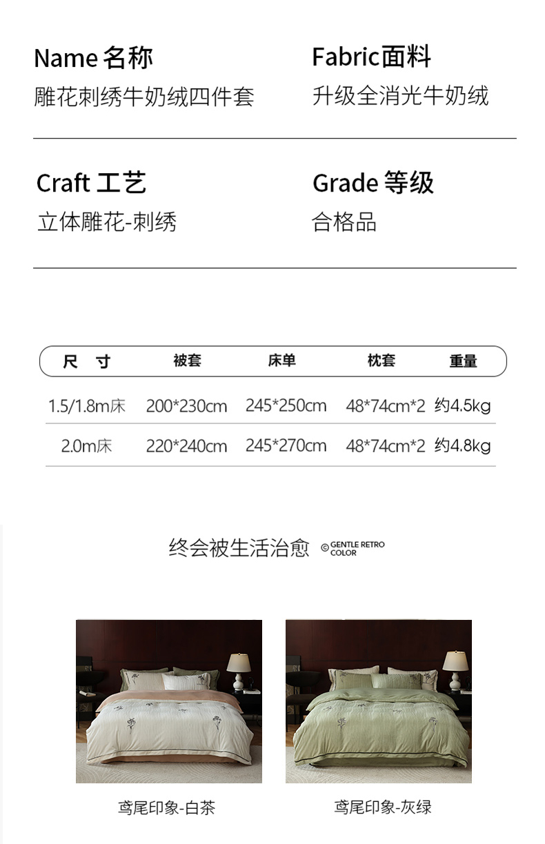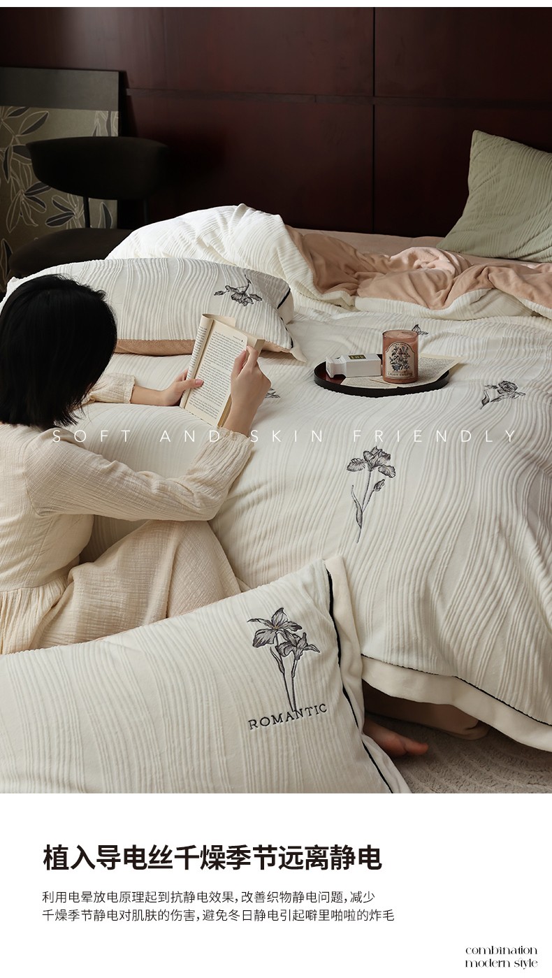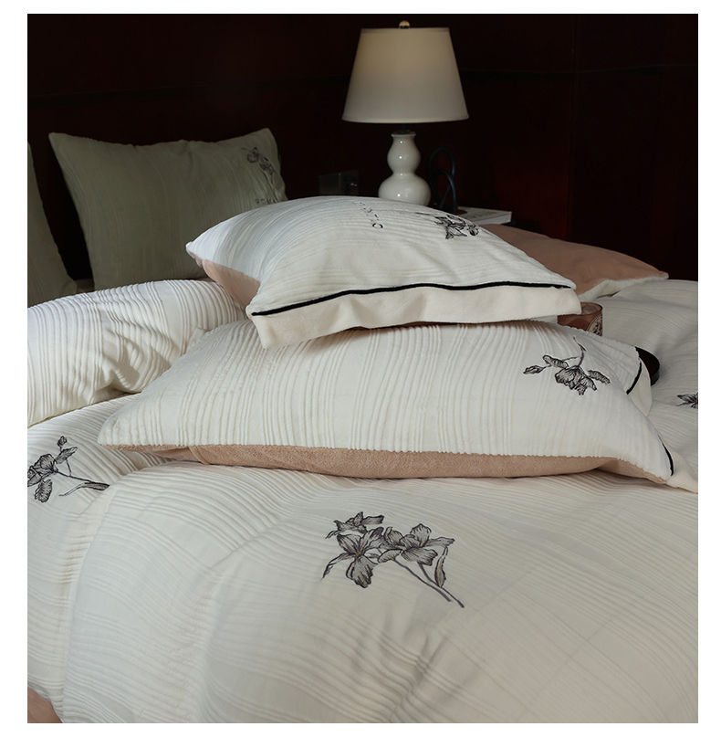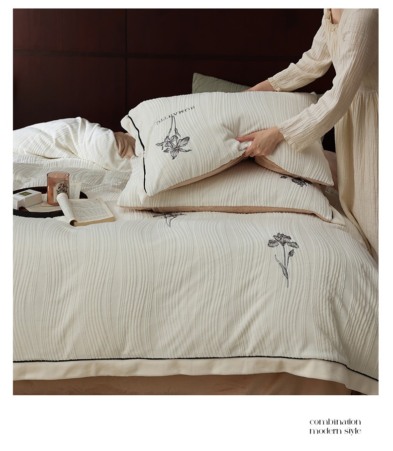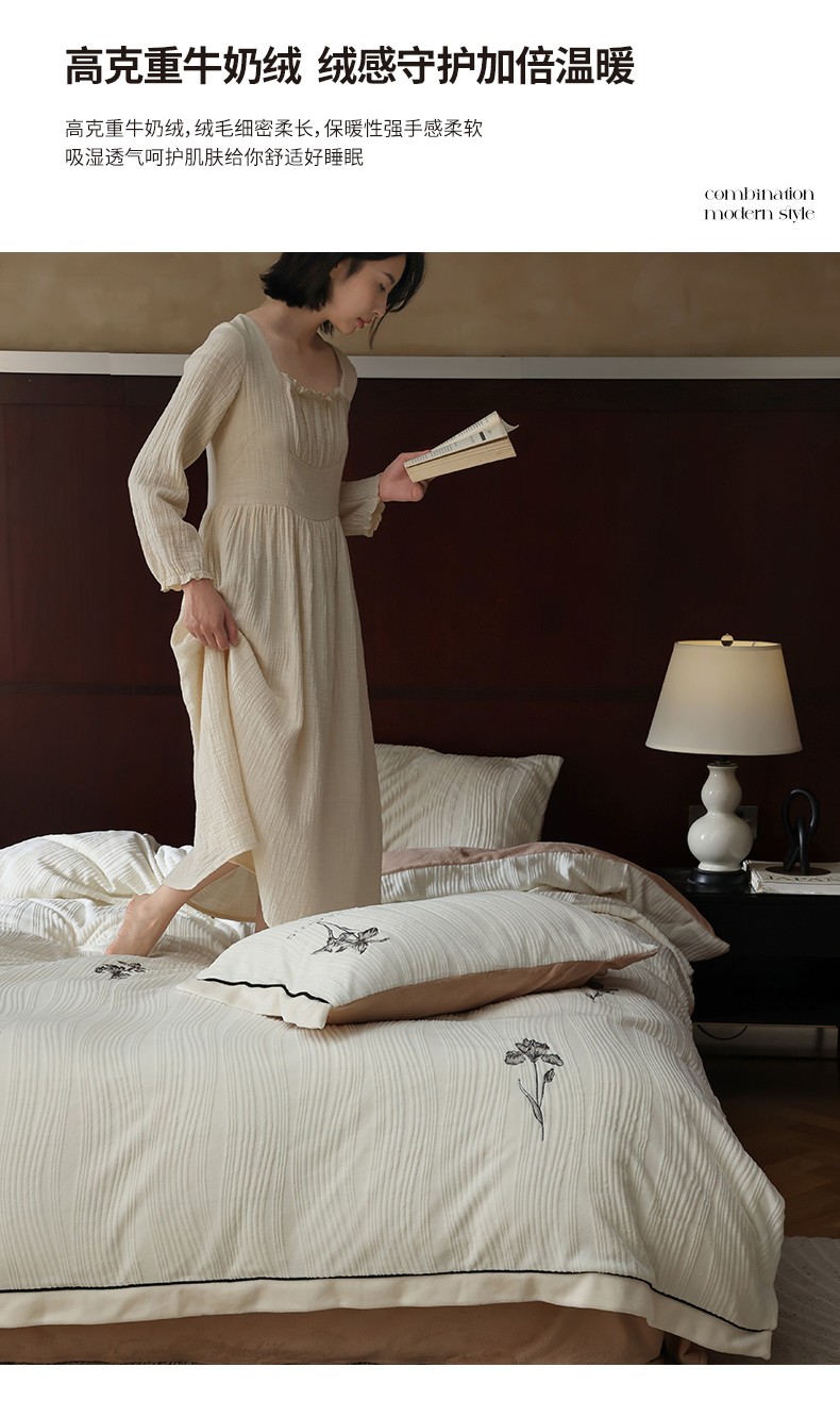 商品名称:安莱生活 2023年新品专版立体牛奶绒浮梦鸢尾系列四件套-法式实拍 鸢尾印象-白茶