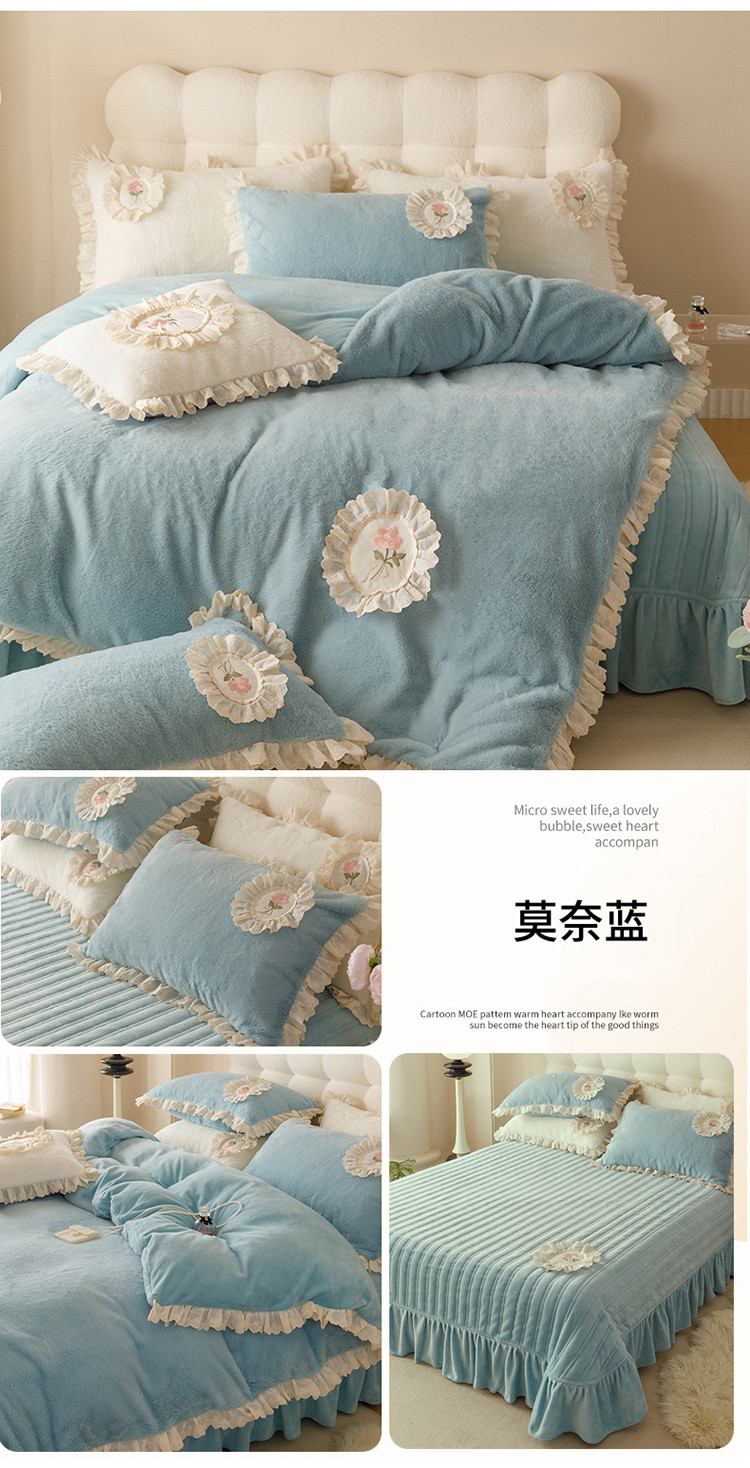 商品名称:胜权 新款AB版仿兔绒牛奶绒加厚韩国绒刺绣夹棉床盖四件套 莫奈蓝