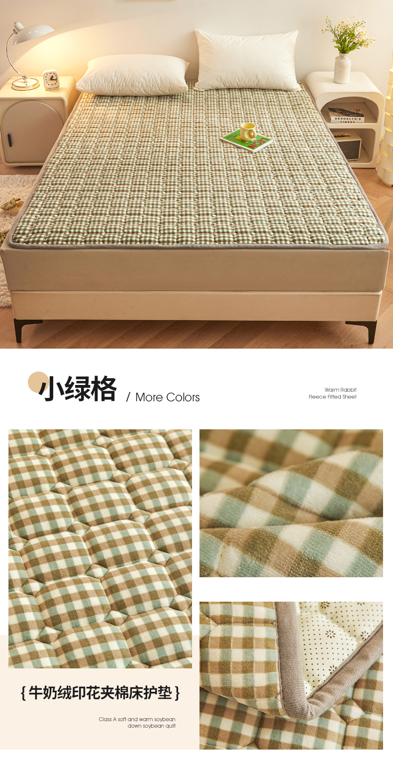 商品名称:富威堡家纺 2023新款牛奶绒印花夹棉床护垫床垫垫子 小绿格