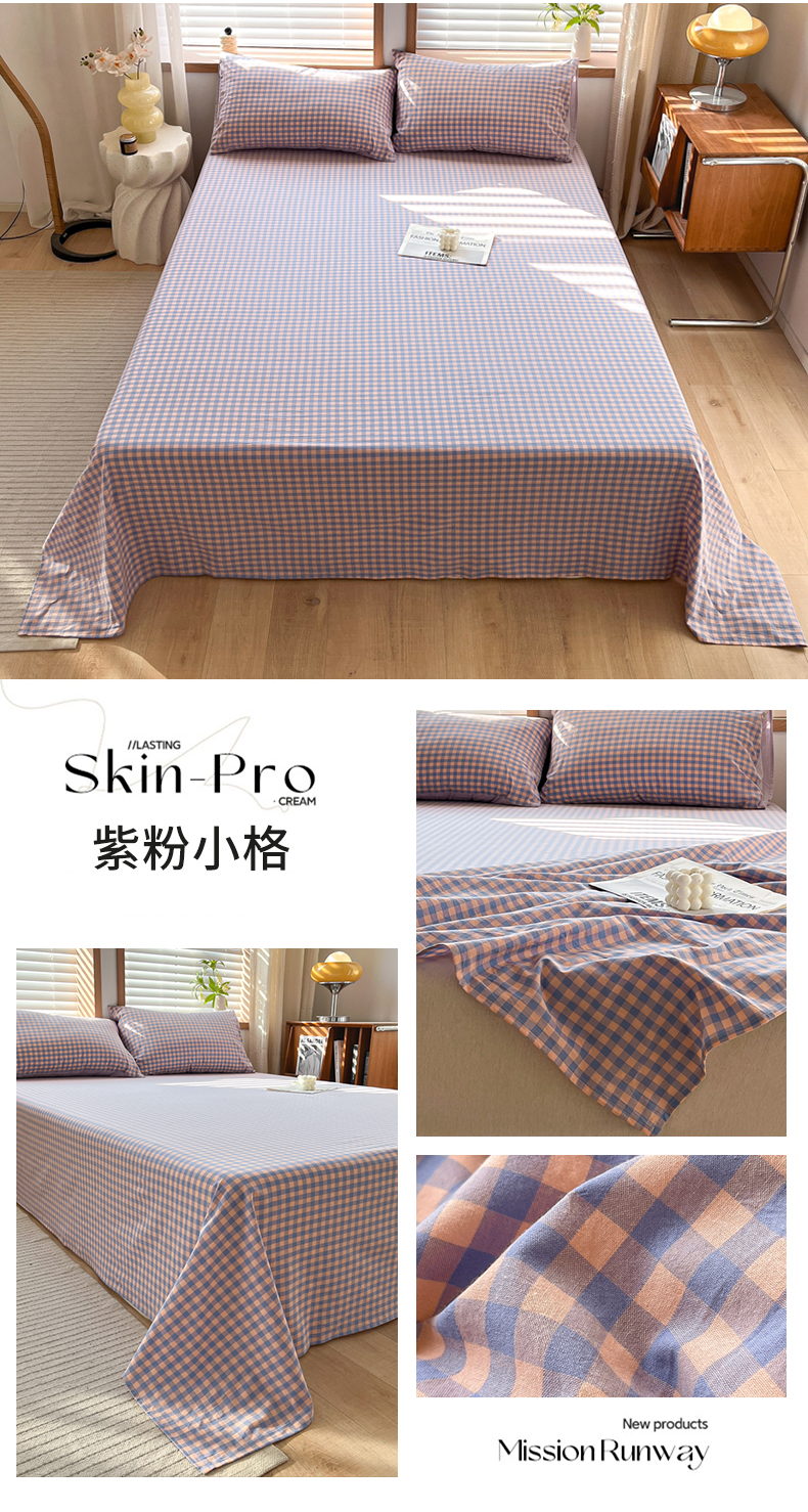 启程家纺 2026新款全棉A类水洗棉多规格四件套单品-单床单 紫粉小格