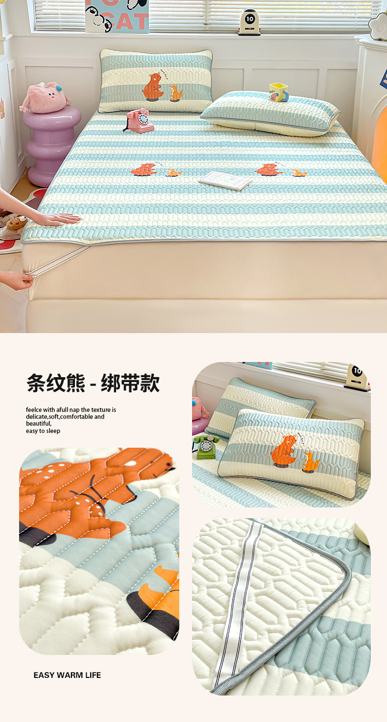 商品名称:米帛家纺 2024新款A类凉感丝卡通乳胶凉席-绑带款 条纹熊
