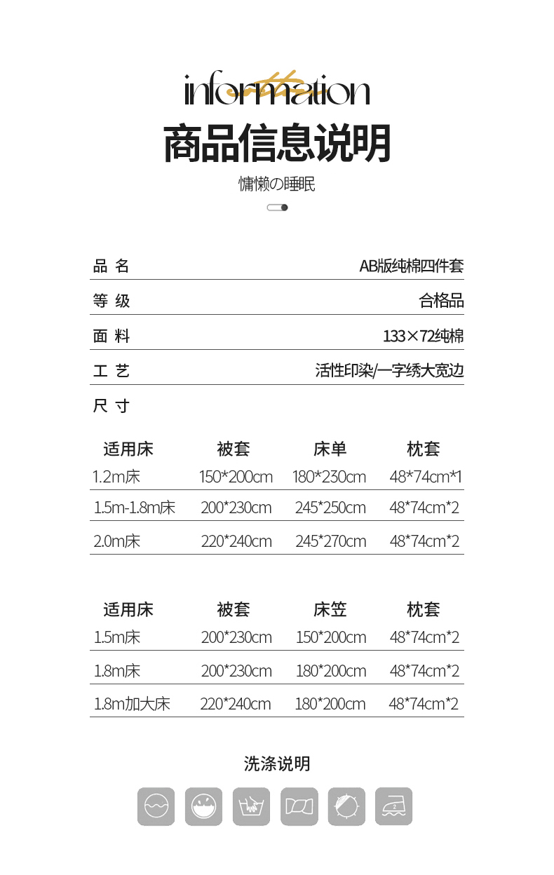 1.8m加大床笠款四件套(被套220*240cm*1 床笠180*200cm*1 枕套48*74cm*2) | ¥150.00 |