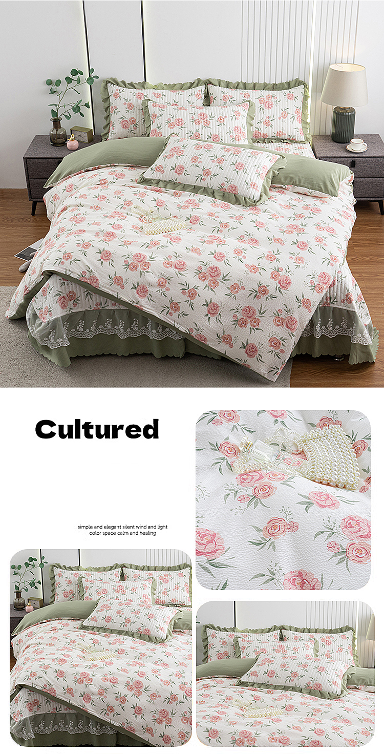 浩浩家纺 2024新款软糯印花泡泡棉蕾丝床盖四件套 被套款 粉玫瑰