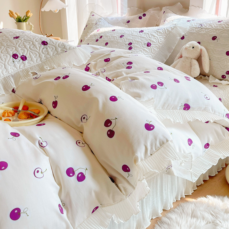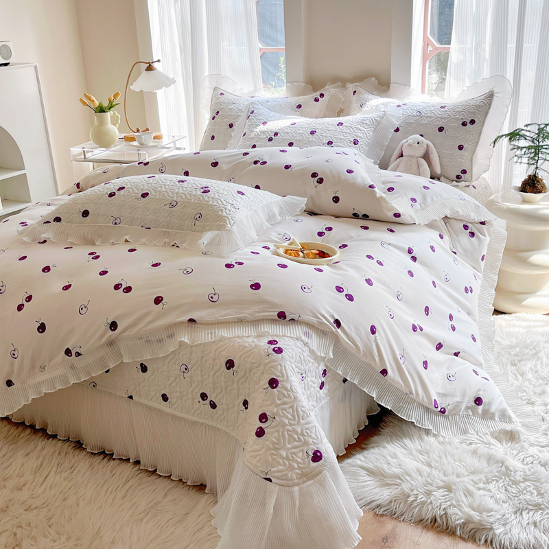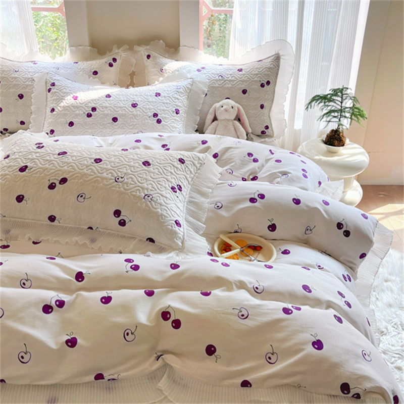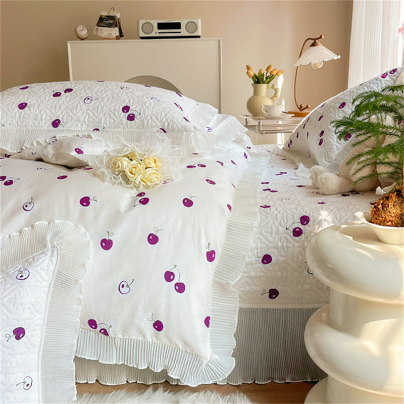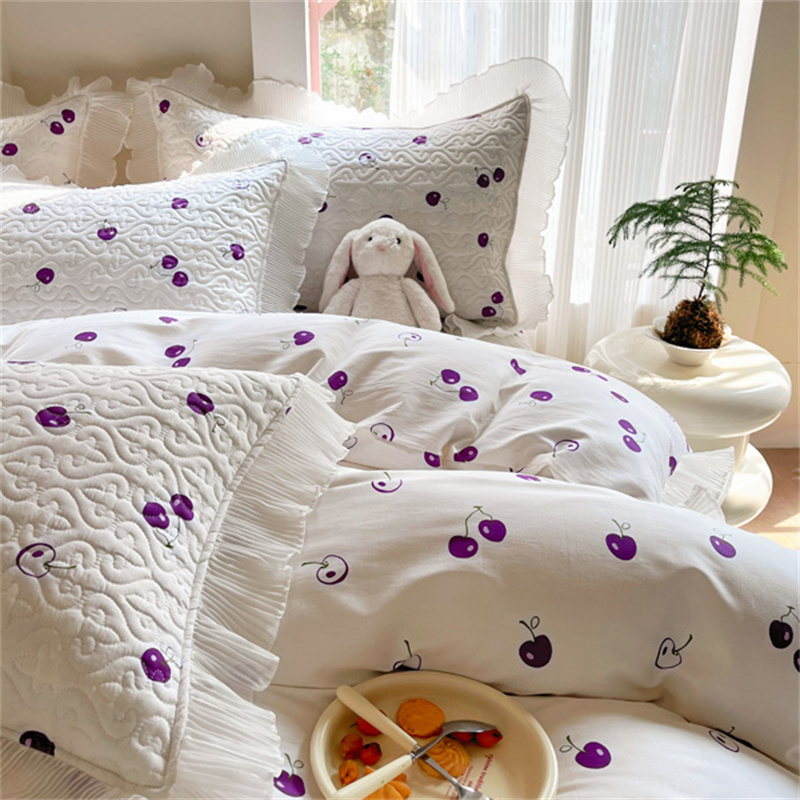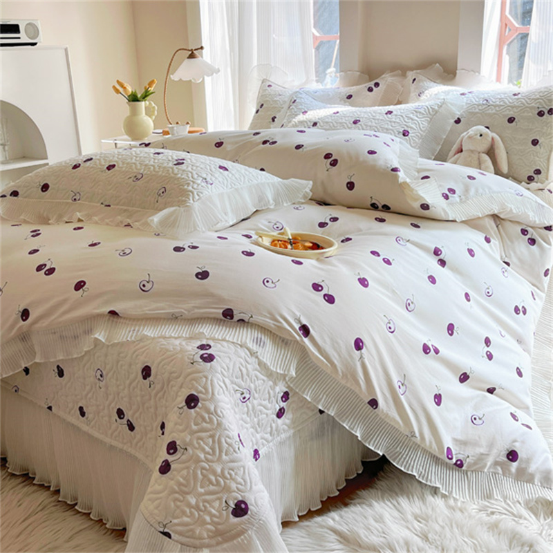 商品名称:添越 2024小清新韩版蕾丝花边纯棉夹棉床盖三件套全棉-紫色小樱桃