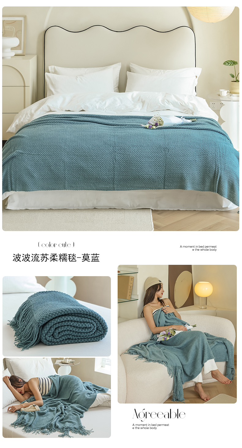 当前位置: 91家纺网 > 商品网购 > 毛毯休闲毯绒毯 > 毛毯 > 朴尔家纺-毛巾被 2024年新款波波风流苏柔糯毯床尾毯沙发巾-朴尔毛巾被 波波流苏柔糯毯-莫蓝