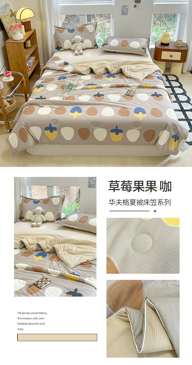 • 91家纺网 家纺一手货源 找家纺 吉祥家纺 2024新款华夫格夏被床笠四件套 草莓果果 咖