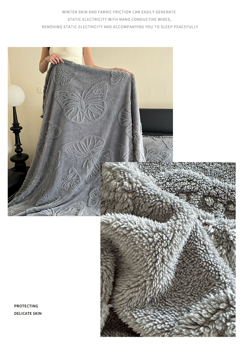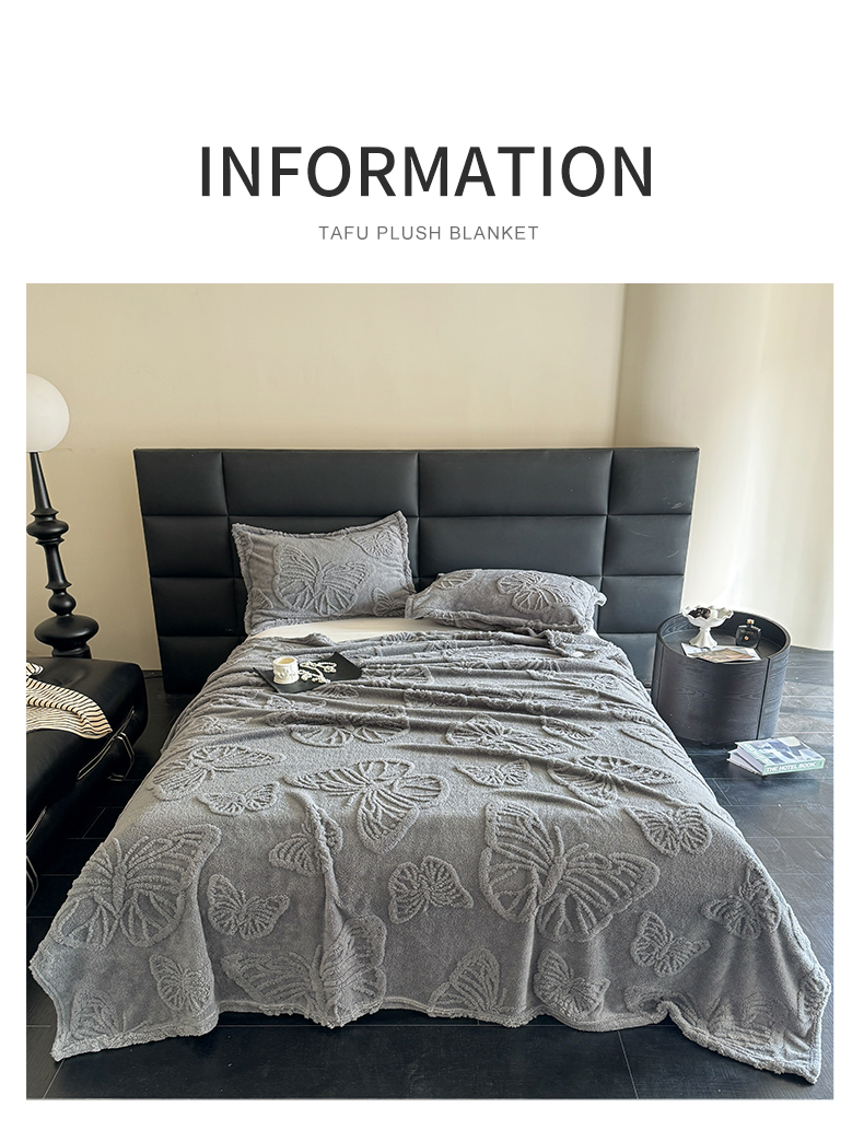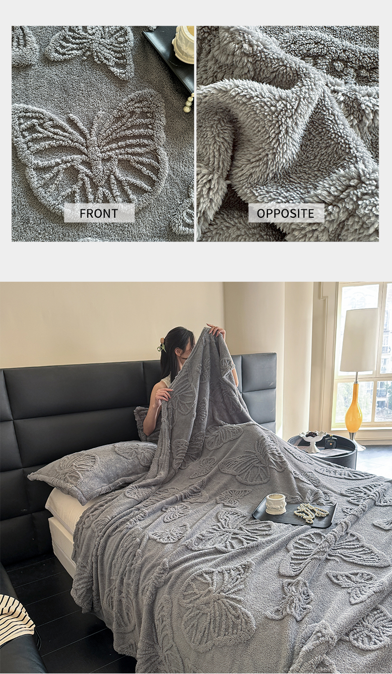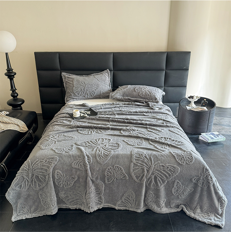 商品名称:2025款塔芙绒蝴蝶提花毛毯 纯色多功能休闲盖毯 爆款花型 电商/直播/外贸/跨境专供 蝴蝶蓝灰