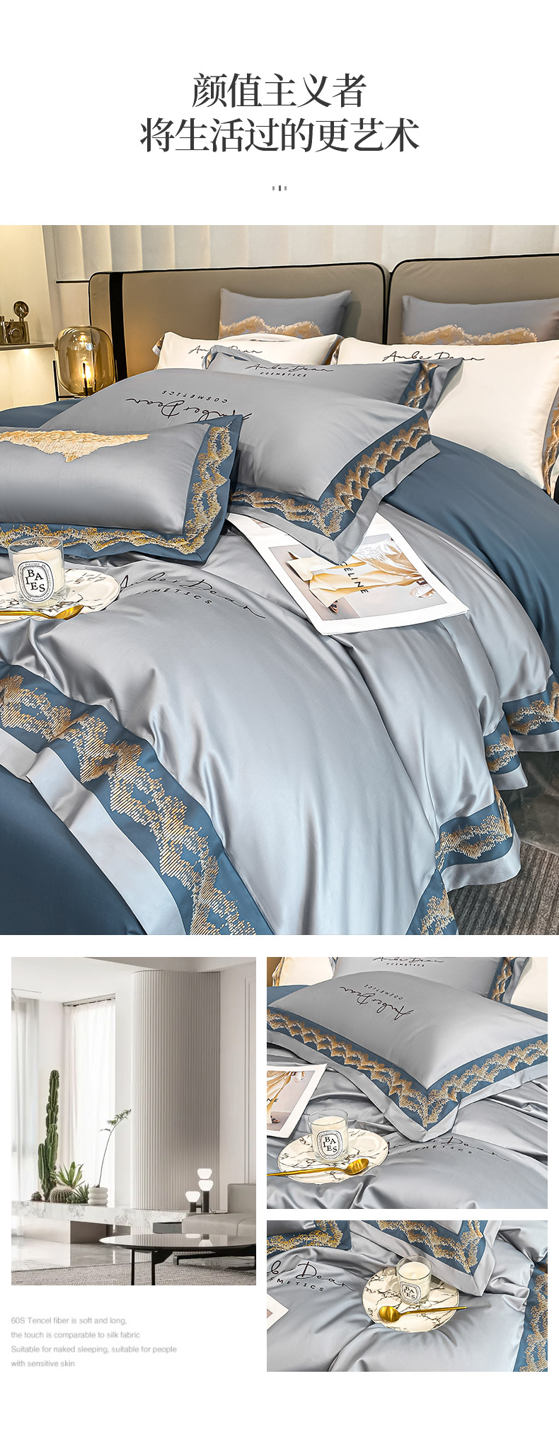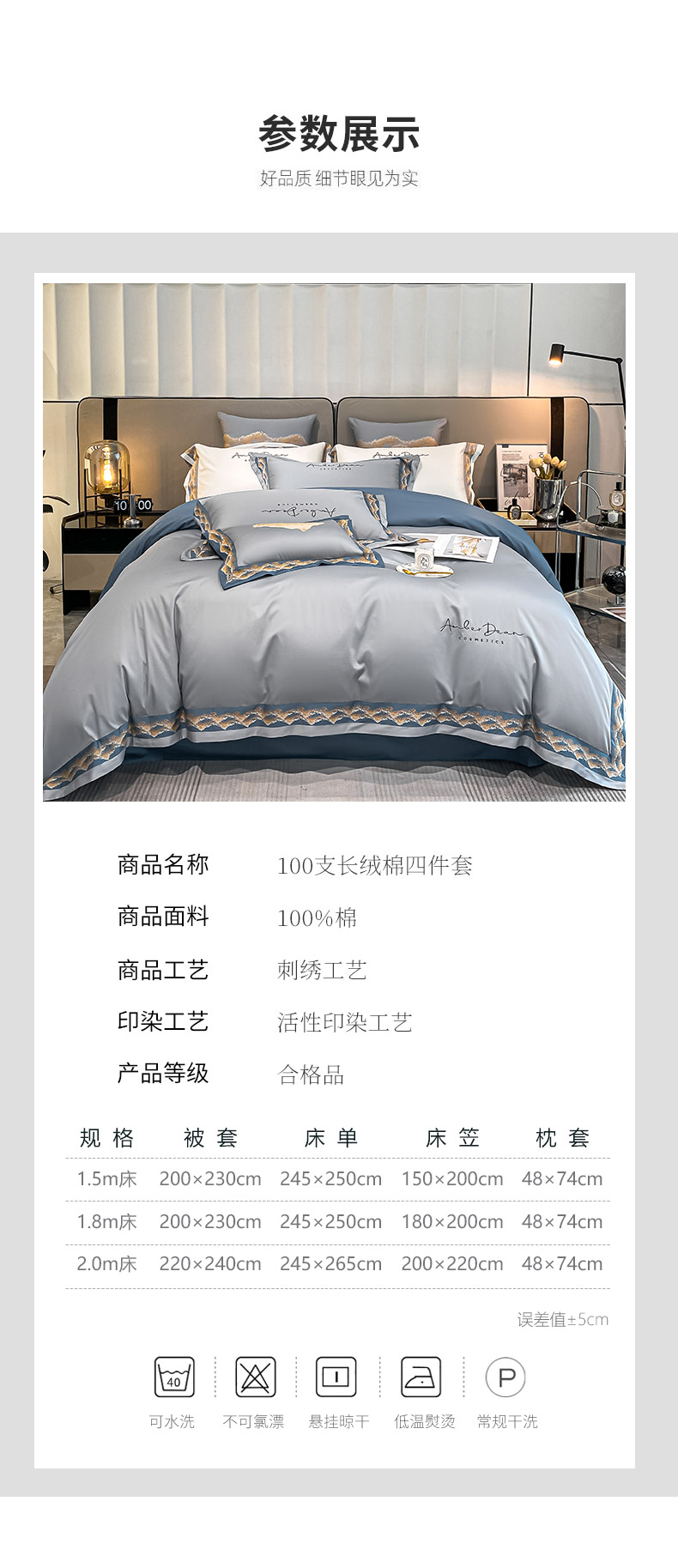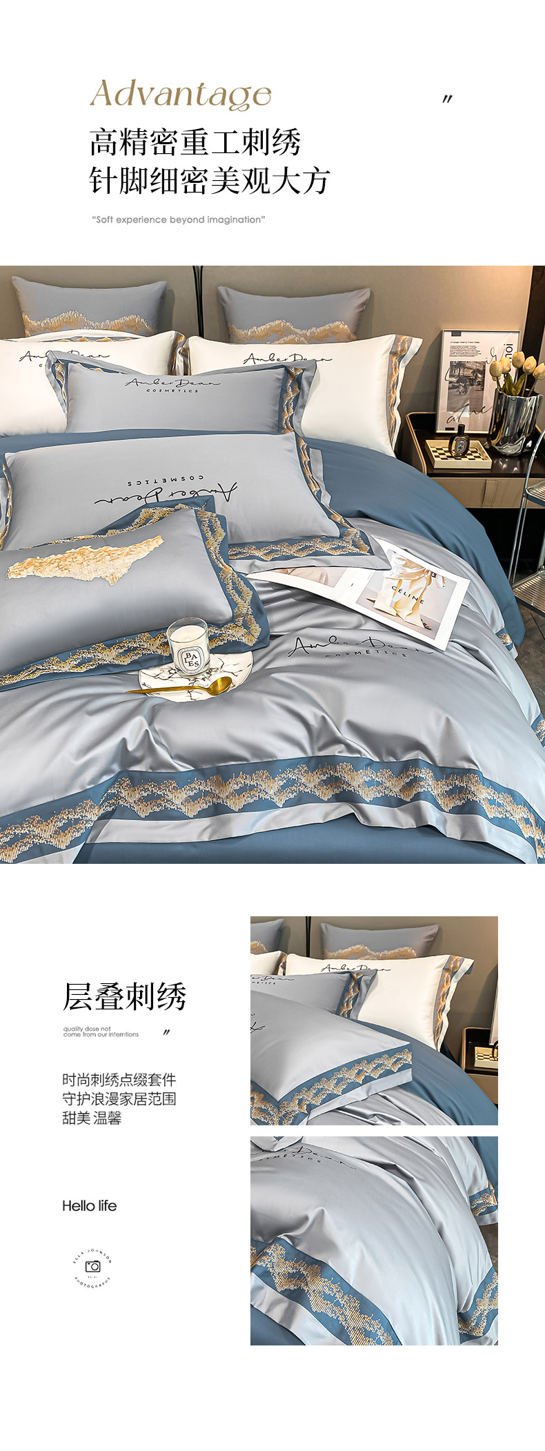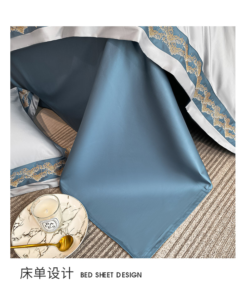 商品名称: 【会员减20】100支长绒棉四件套澳棉刺绣纯色拼边高定重工轻奢简约大气酒店风床上用品 维洛-星空银