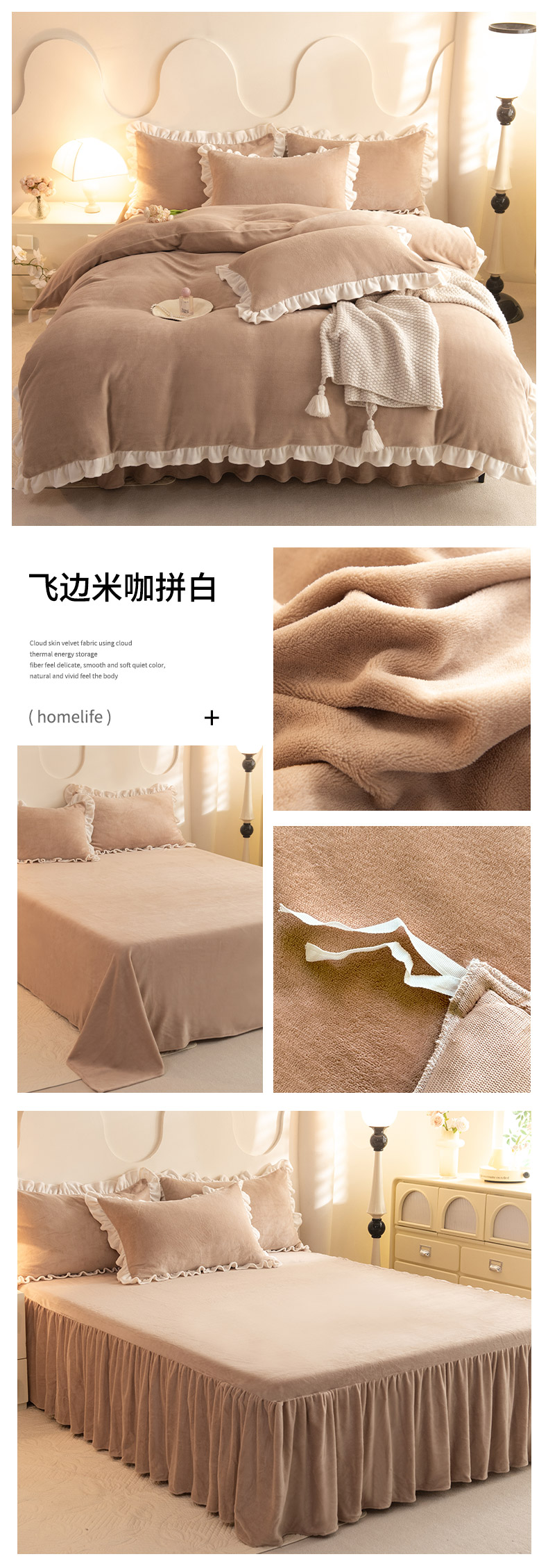 当前位置: 91家纺网 > 商品网购 > 床品套件 > 四件套 > 牛奶绒四件套 > 恩和家纺 2024新款高克重200g牛奶绒飞边款四件套 飞边米咖拼白