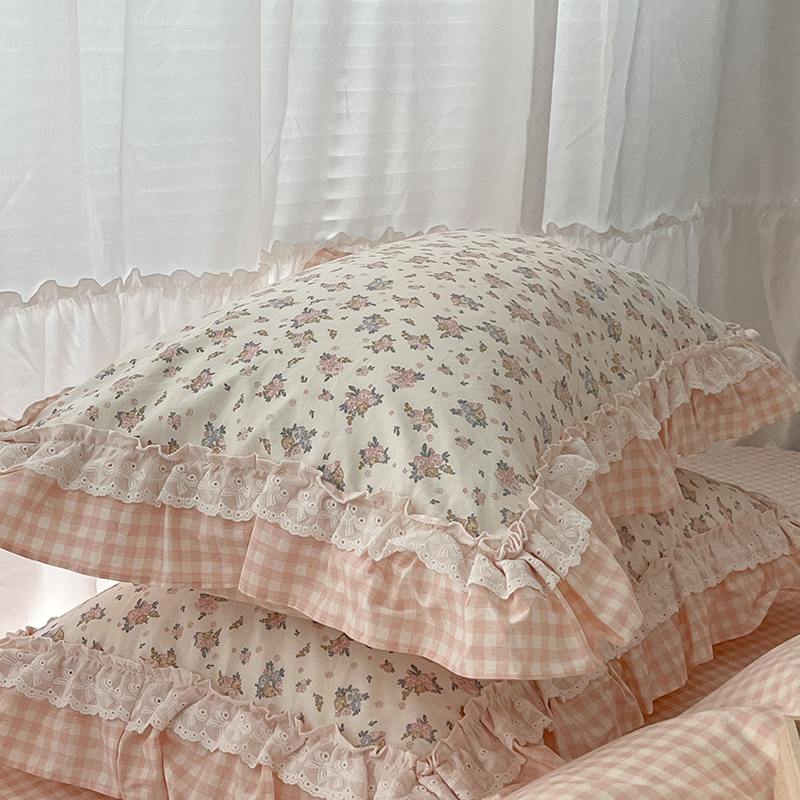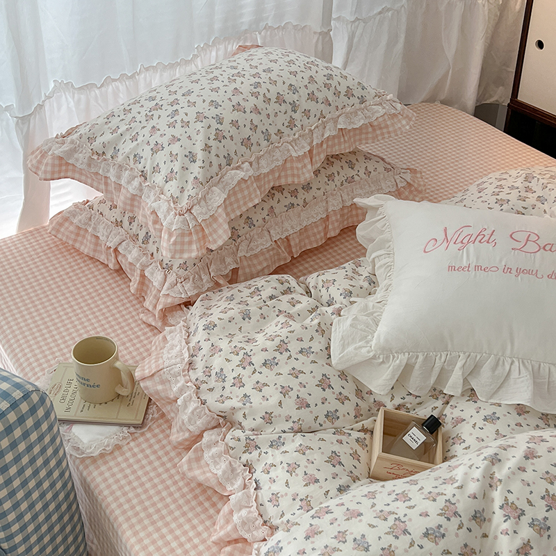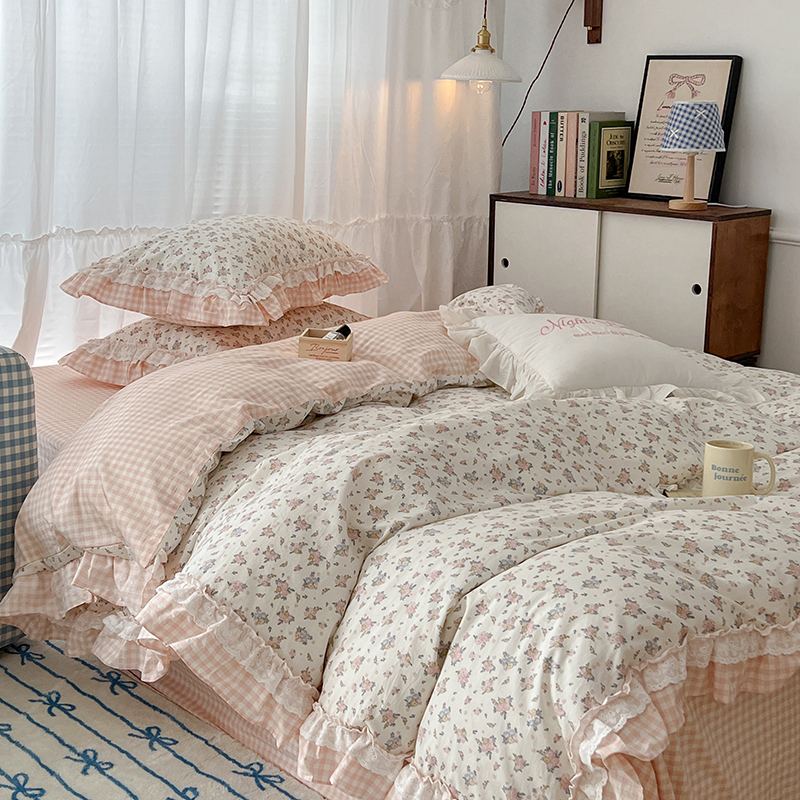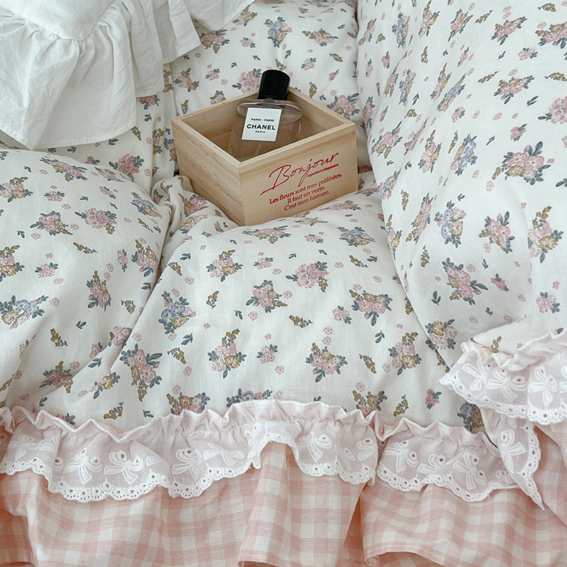 昔可家纺 2024蕾丝双层花边款全棉四件套 春鹭杏花