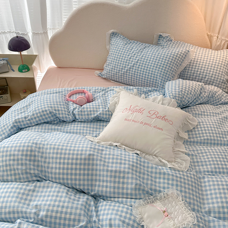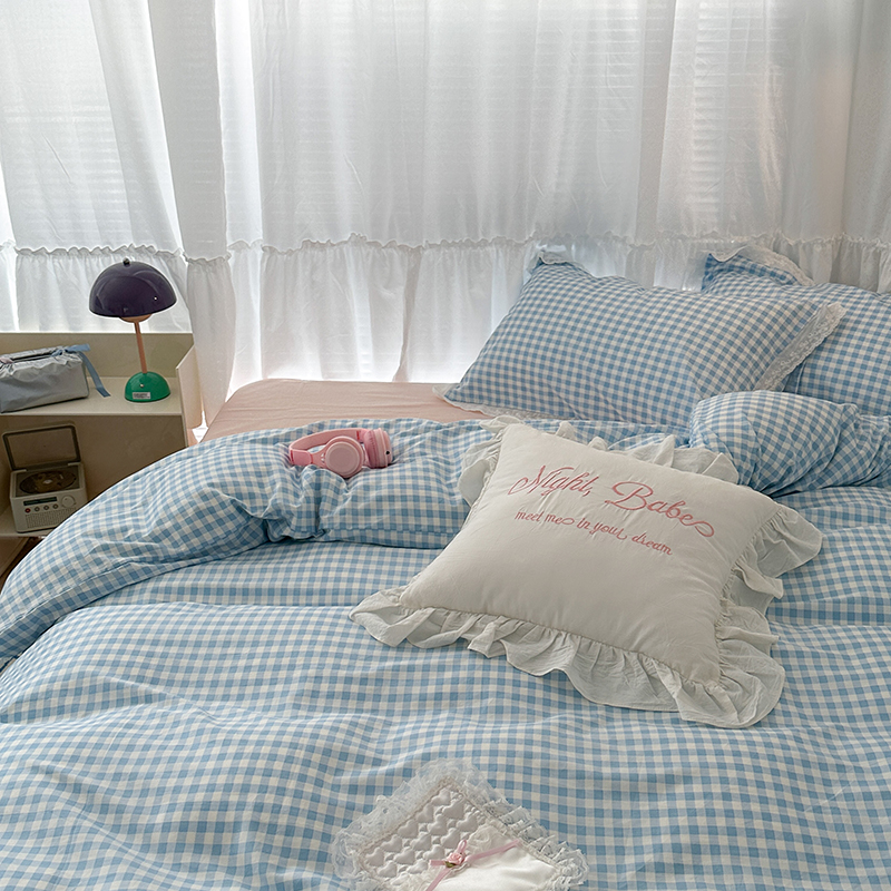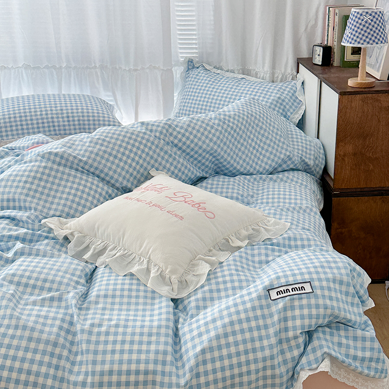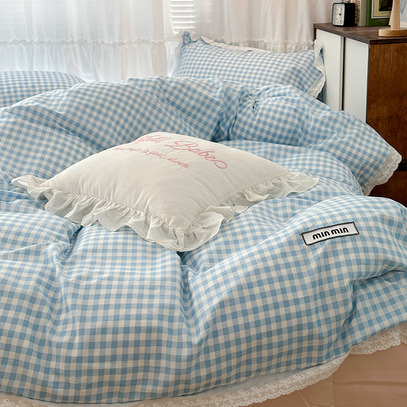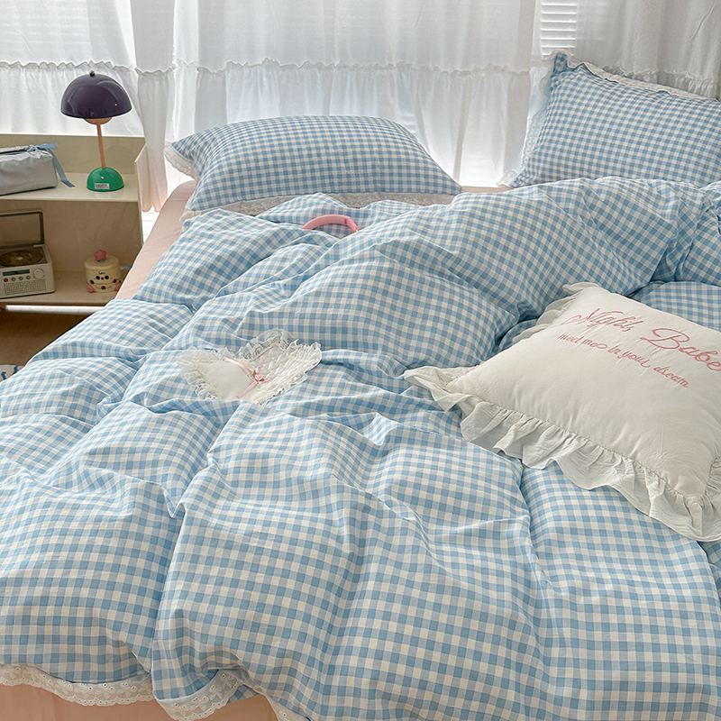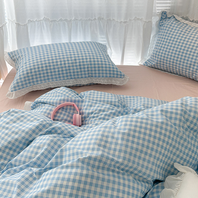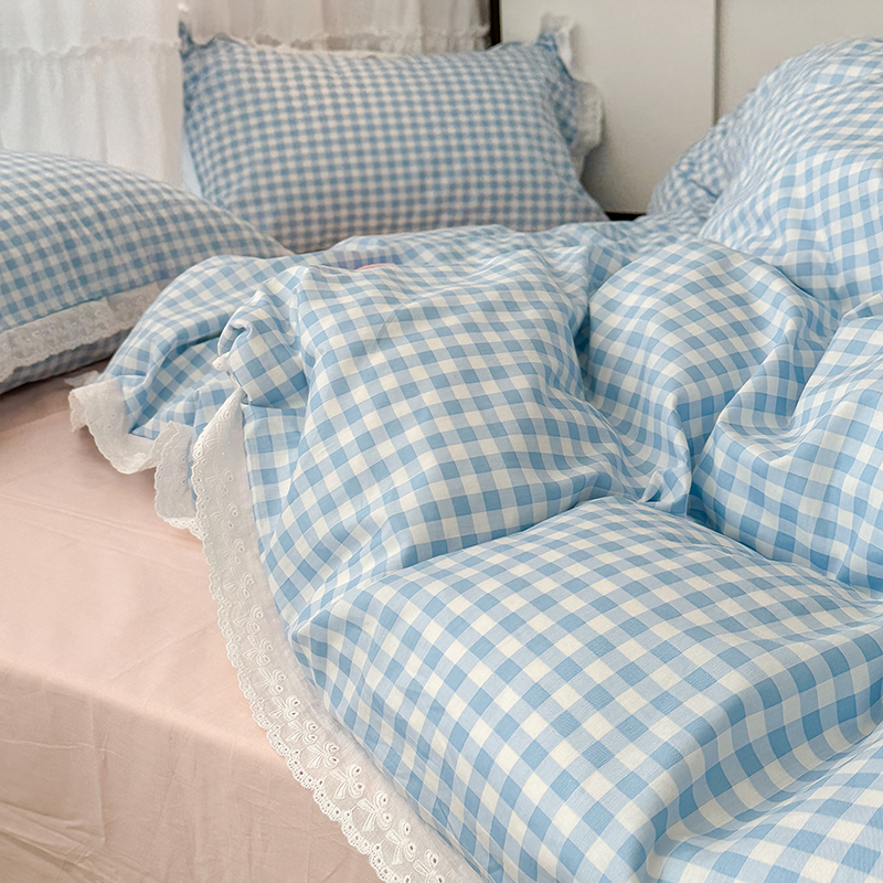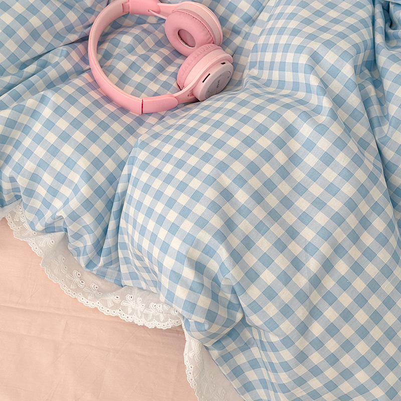 昔可家纺 2024新款m1u系格子蕾丝花边四件套 盐系蓝格