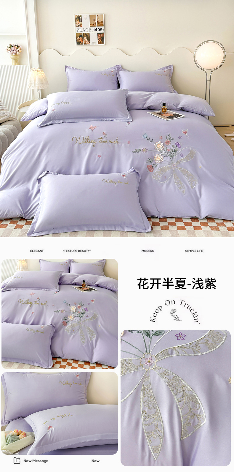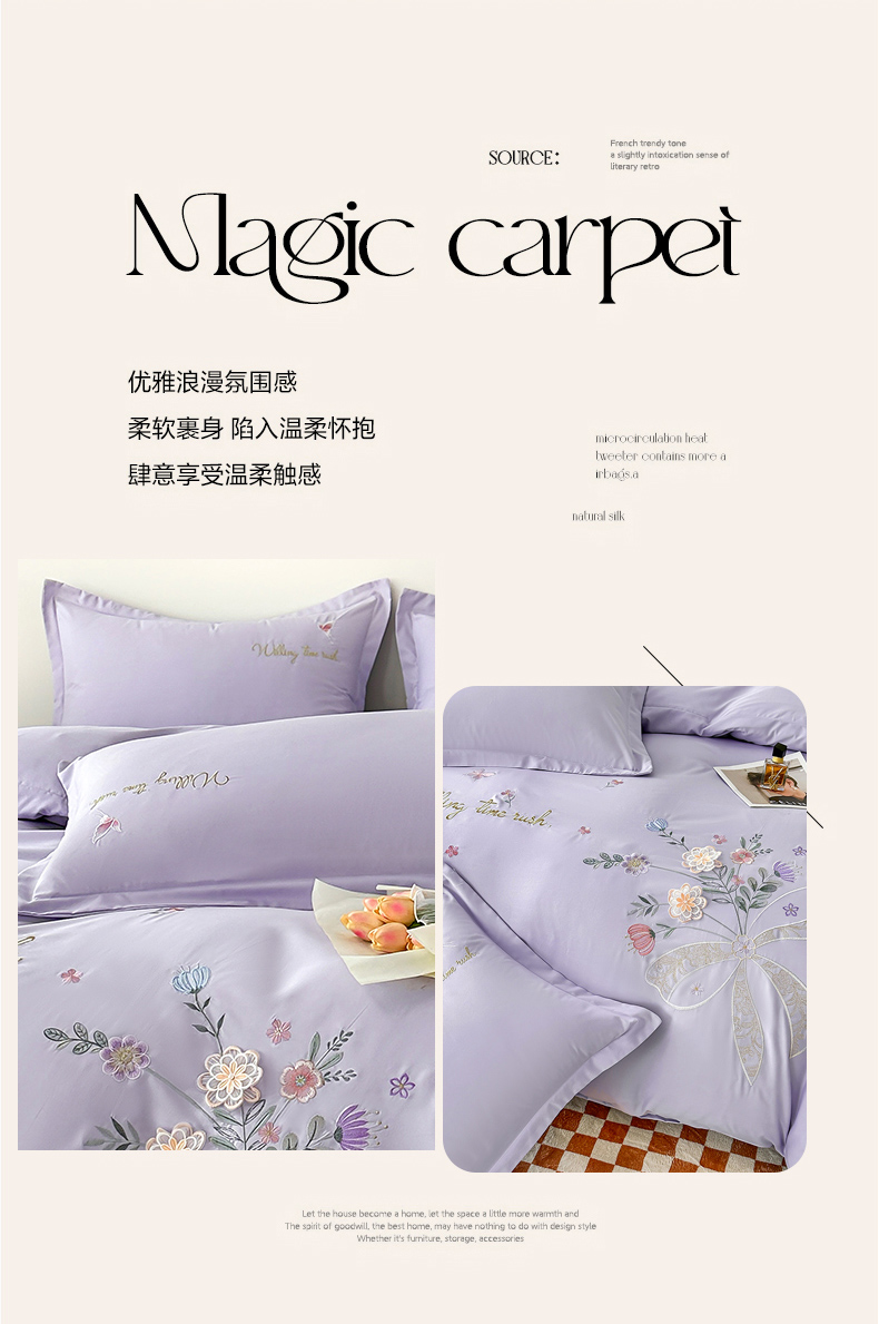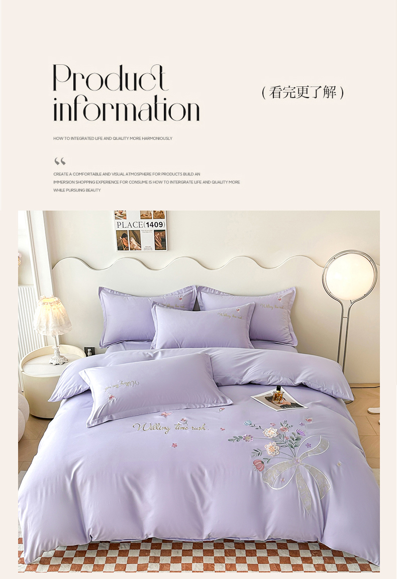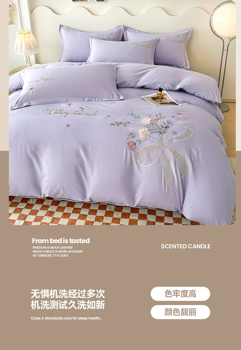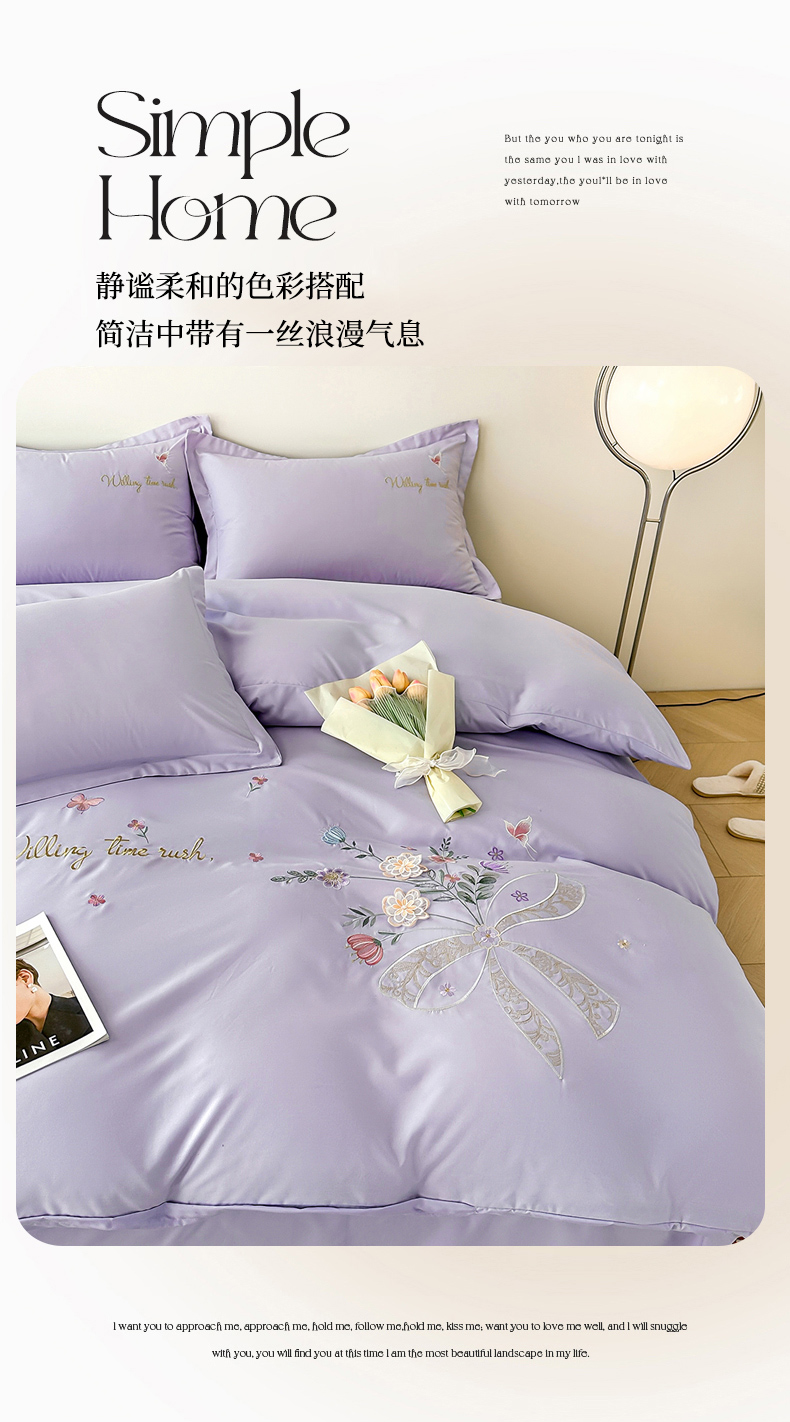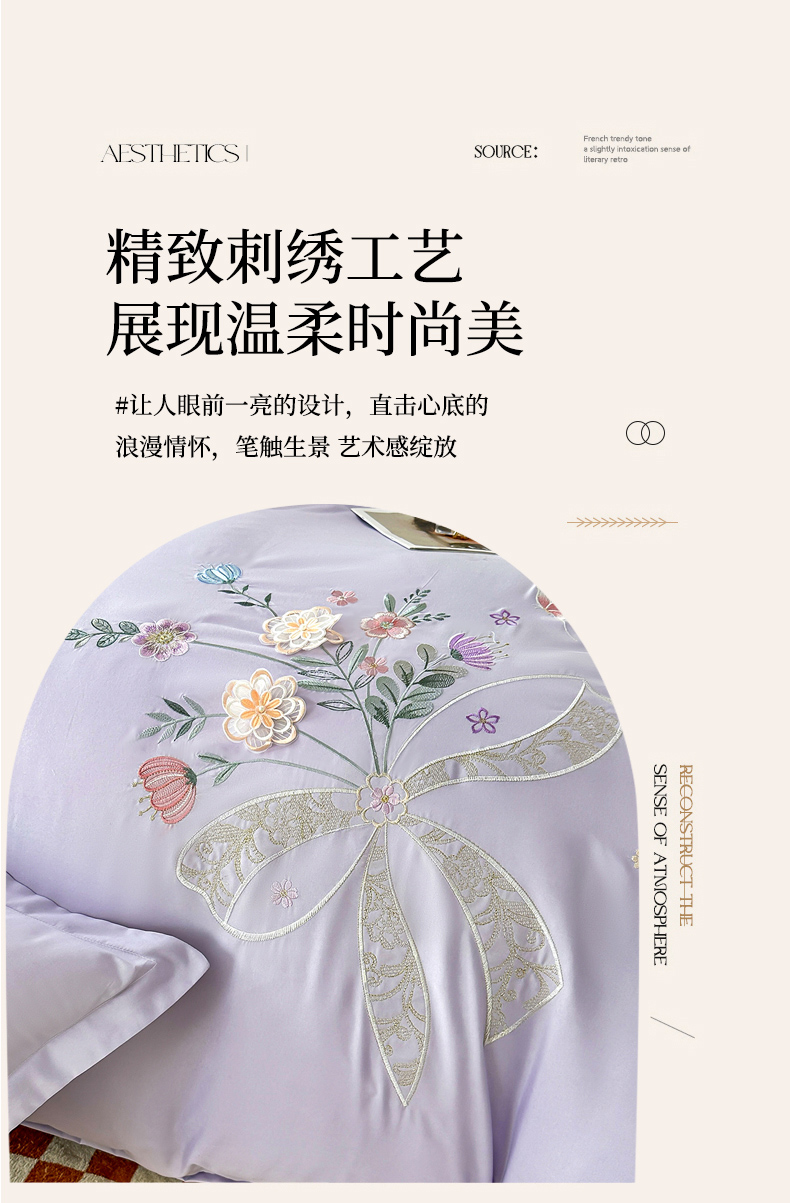 商品名称:帝菲妮 2025新款法式公主风立体花绣花优肤棉刺绣四件套-花开半夏 花开半夏-浅紫