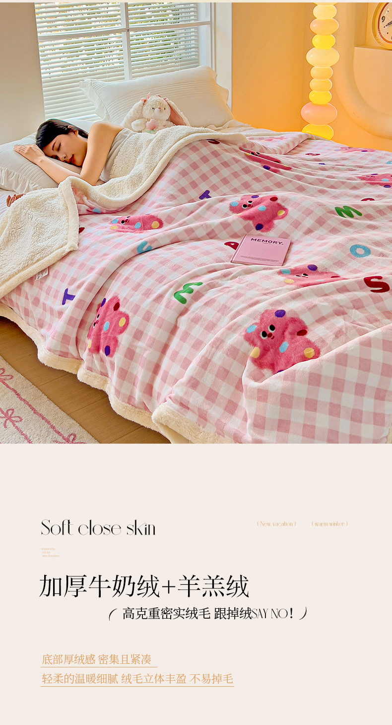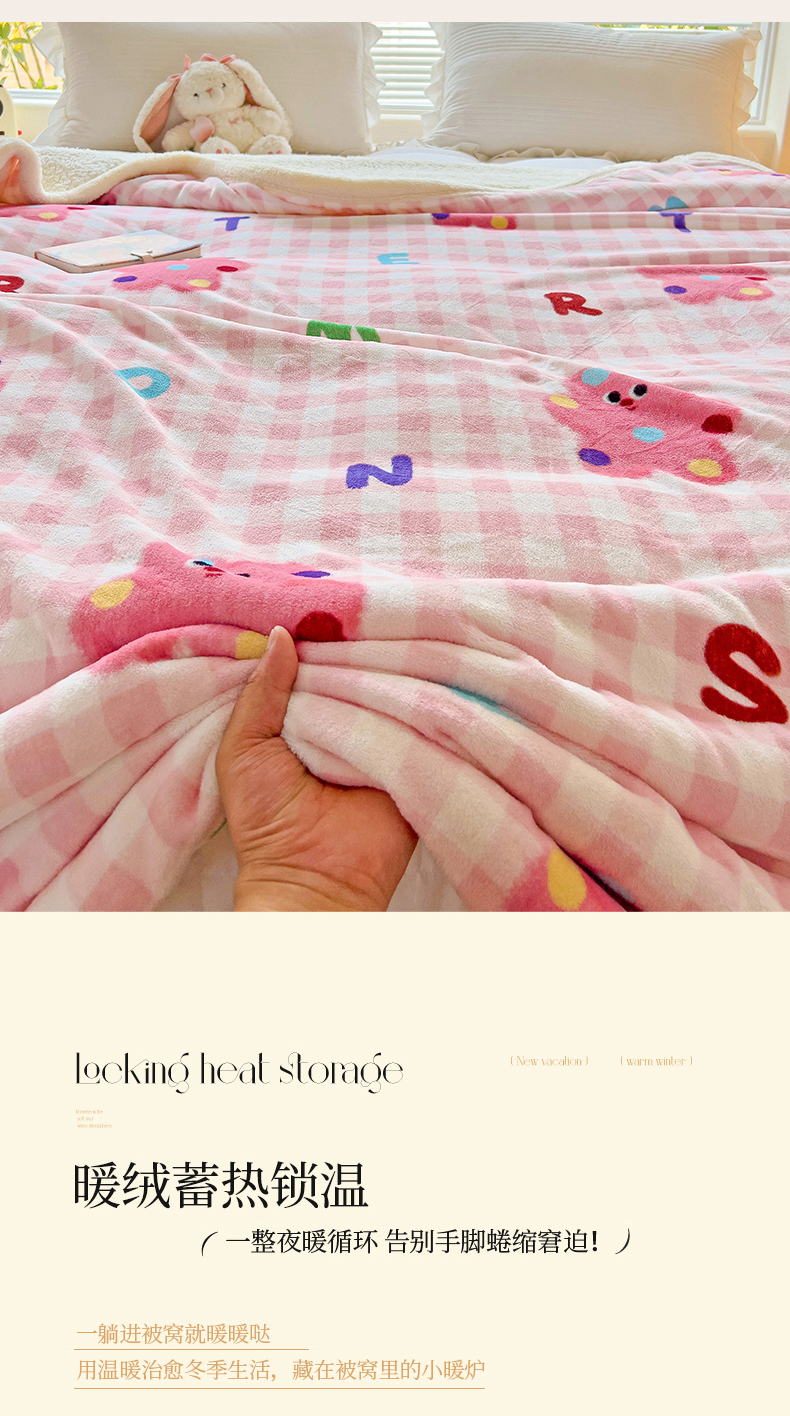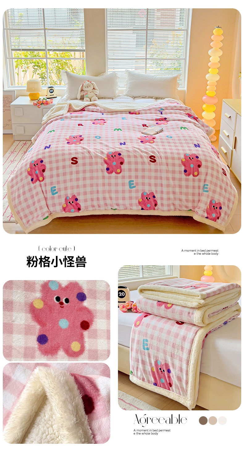 鑫喜莱家纺 2024新款牛奶绒羊羔绒盖毯毛毯毯子午睡毯 粉格小怪兽