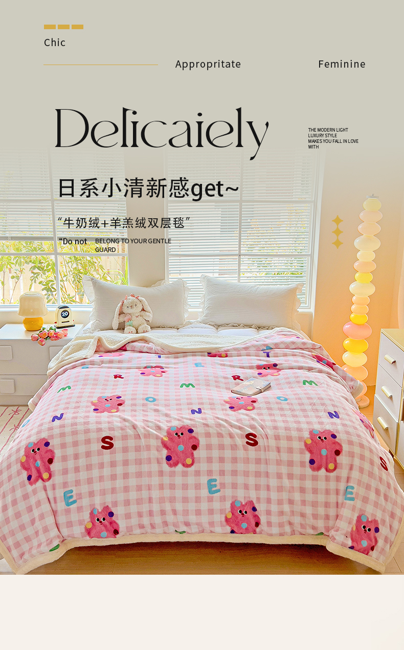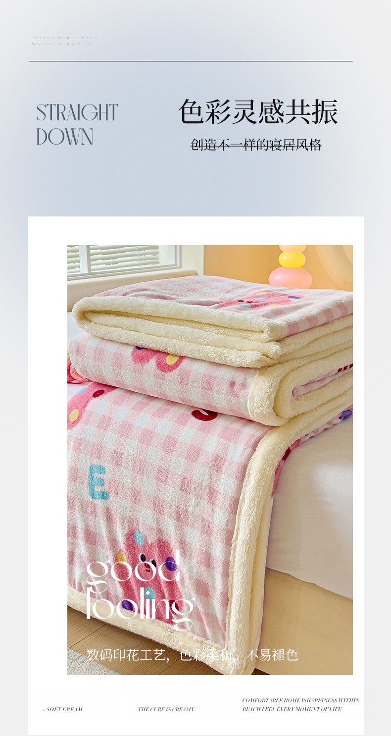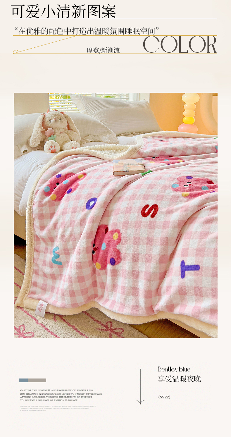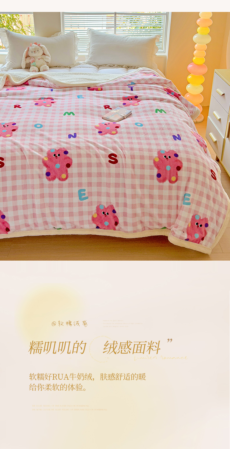 鑫喜莱家纺 2024新款牛奶绒羊羔绒盖毯毛毯毯子午睡毯 粉格小怪兽