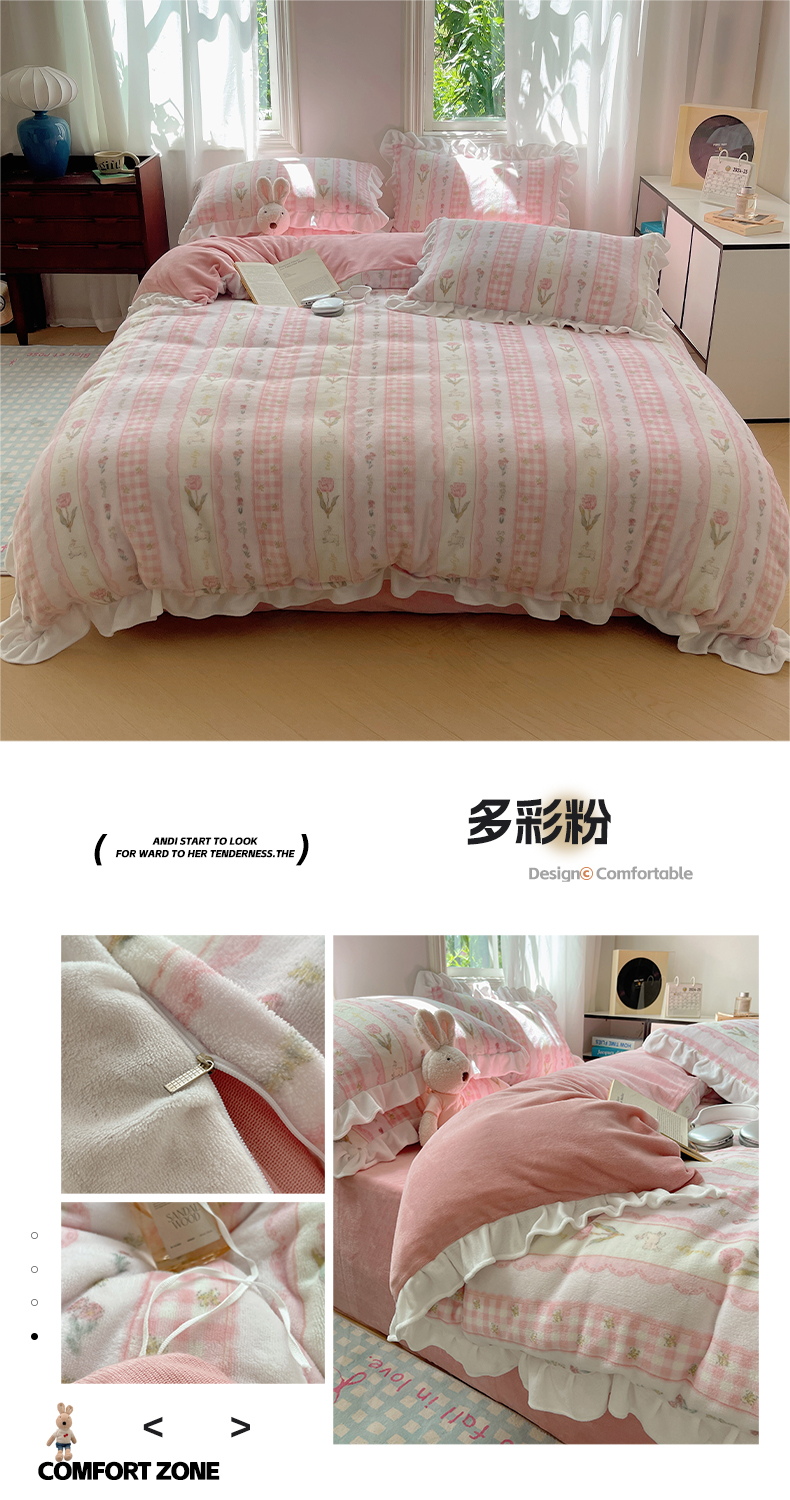 美乐迪家纺 2024新款花边牛奶绒印花四件套 多彩粉