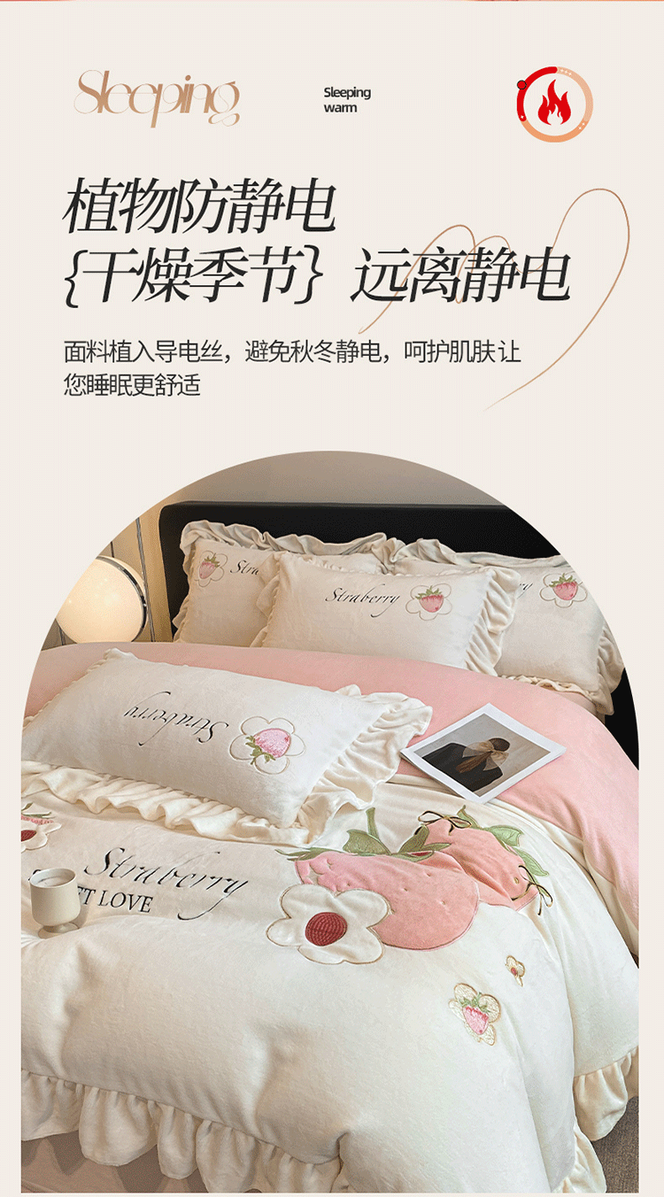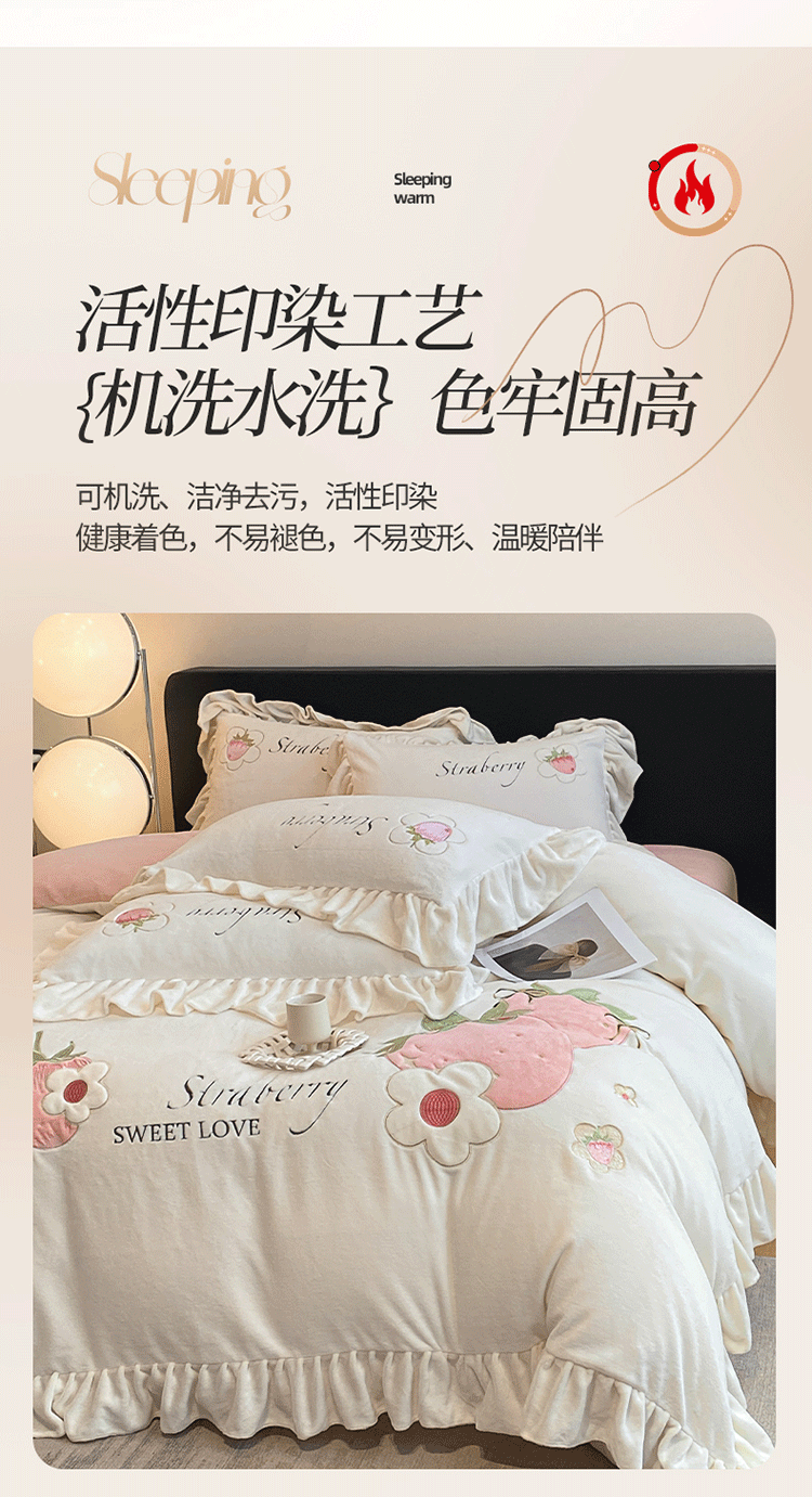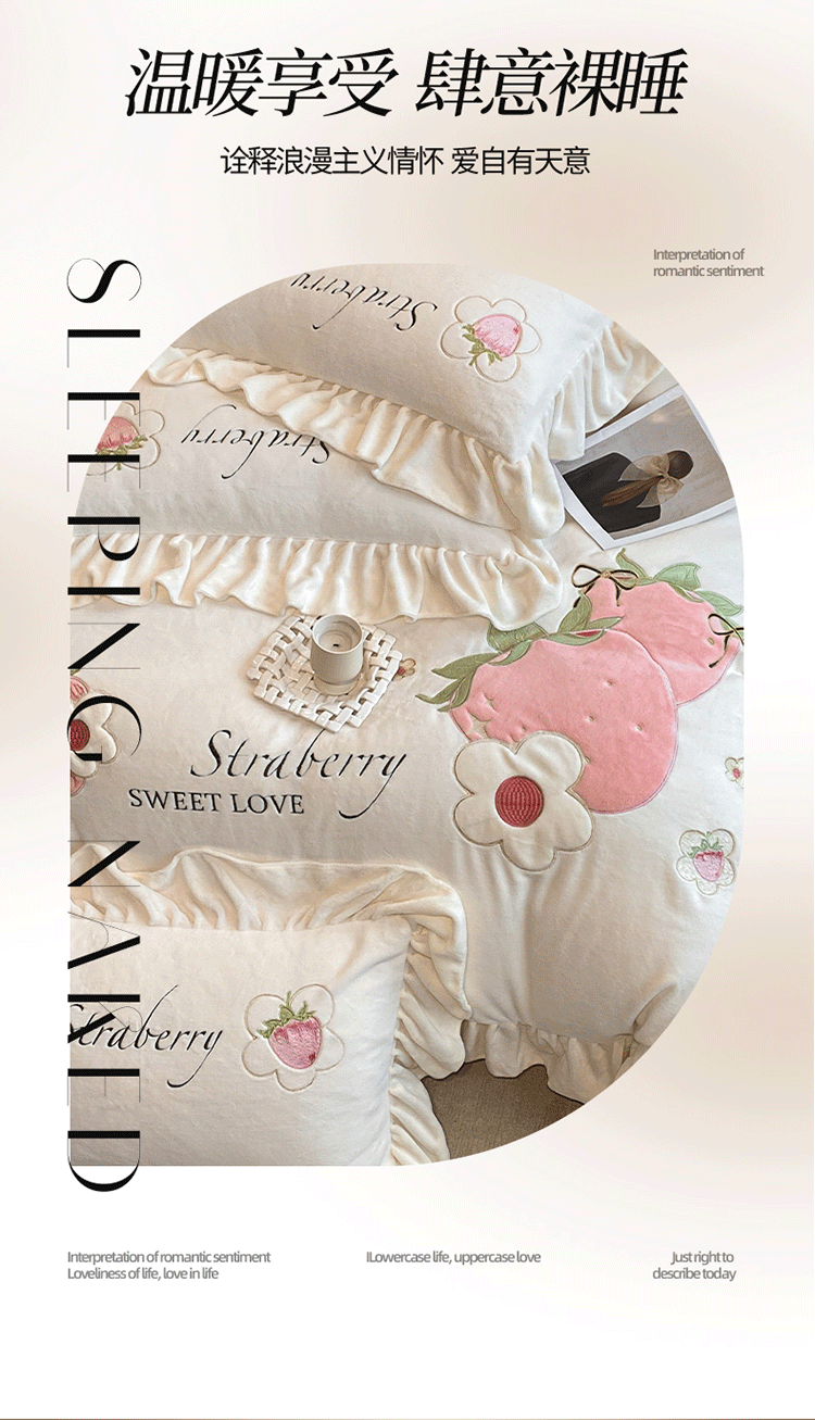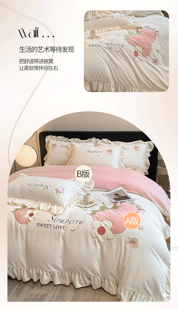 爱家(原缔乐家纺) 牛奶绒贴布绣四件套-甜心草莓 甜心草莓-奶昔白