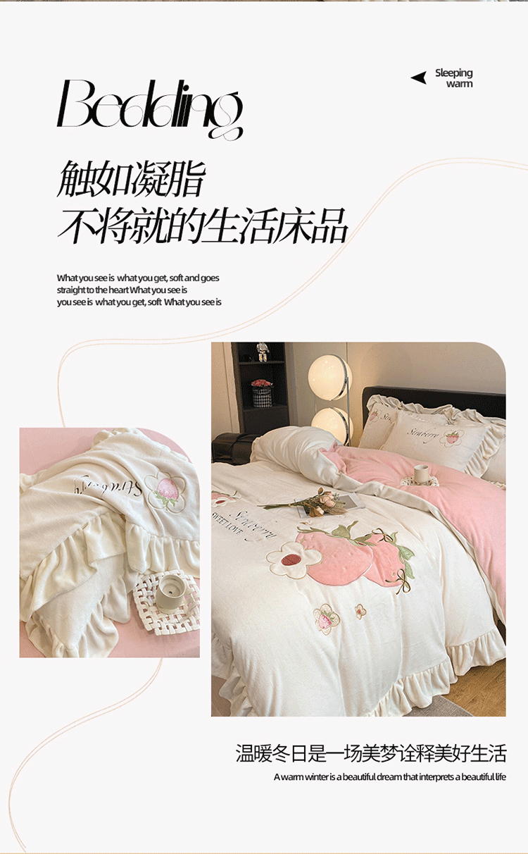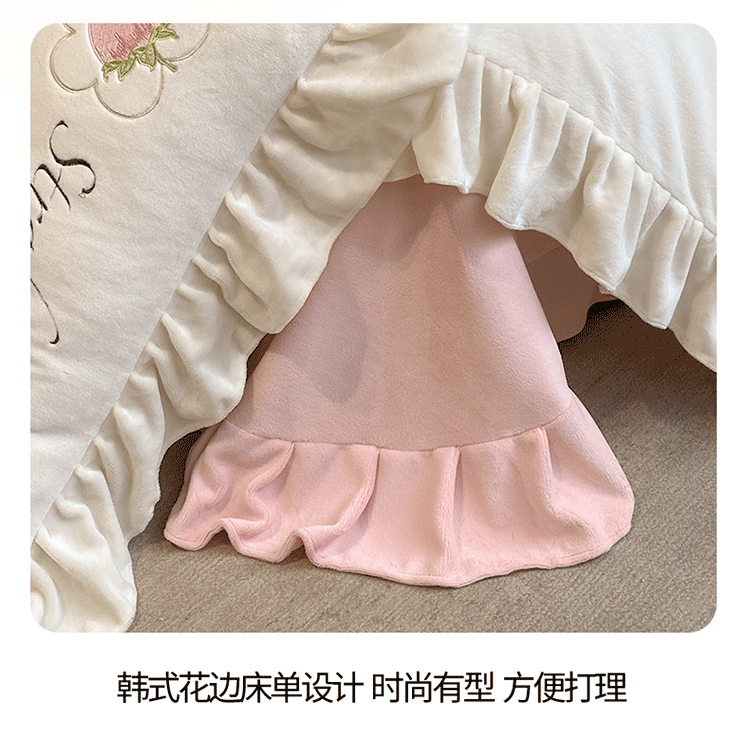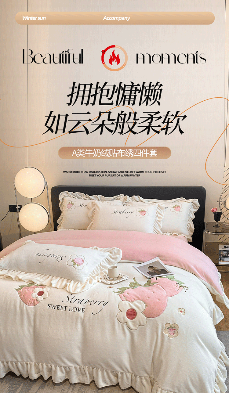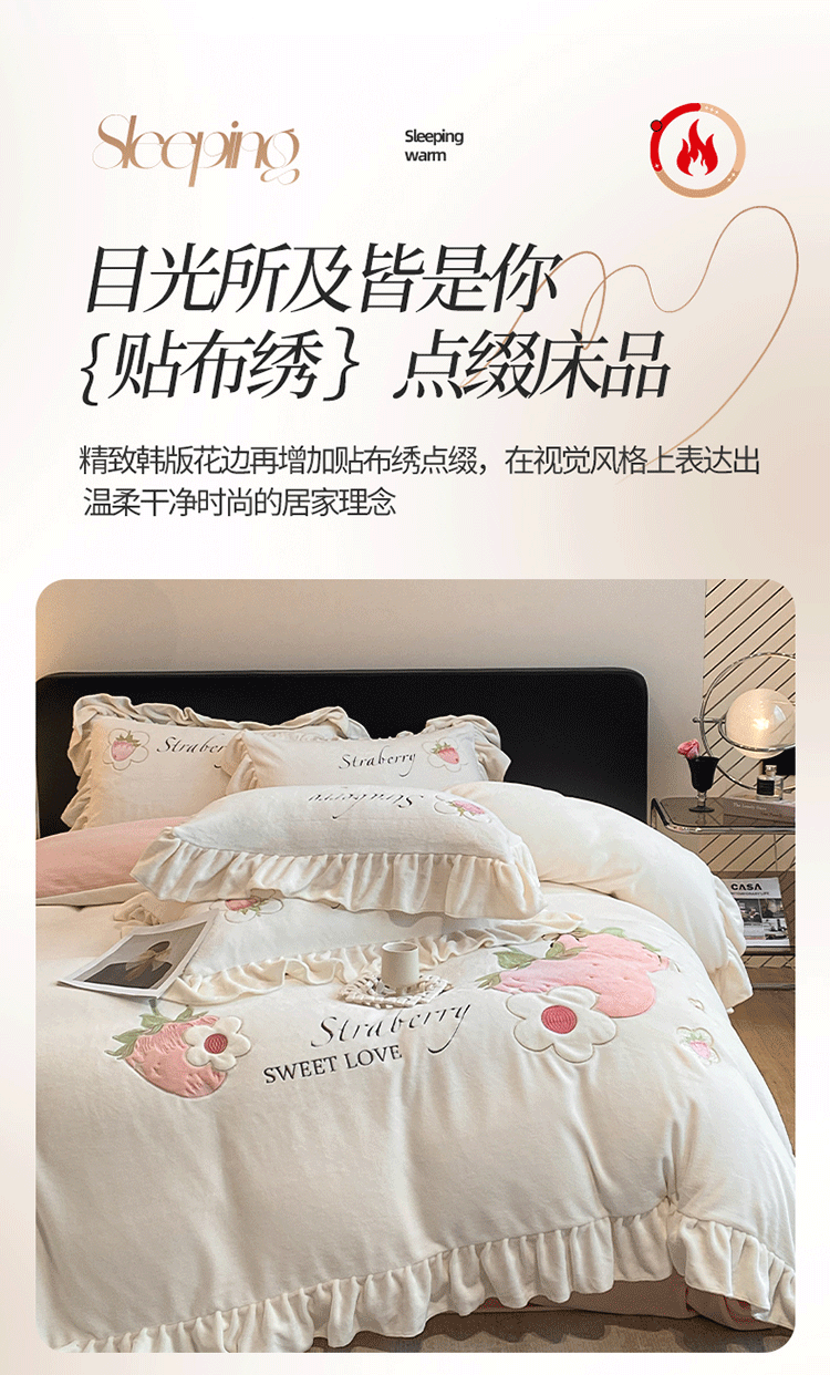 爱家(原缔乐家纺) 牛奶绒贴布绣四件套-甜心草莓 甜心草莓-奶昔白