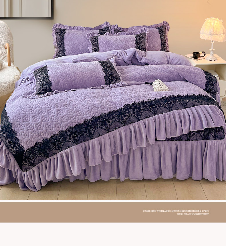 商品名称:恋尚 2024新款纯色牛奶绒四件套韩版蕾丝花边床盖款四件套 洛丽塔 紫色