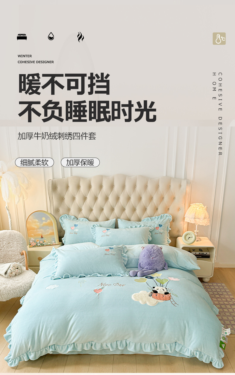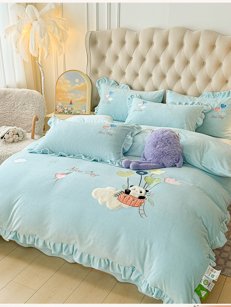 金窝窝家纺 2025新款全消光高克重牛奶绒贴布绣四件套 卡皮熊-天空蓝,卡皮熊-天空蓝