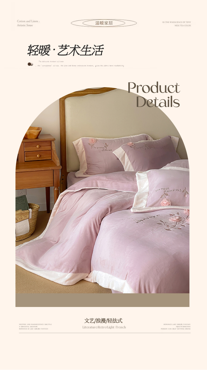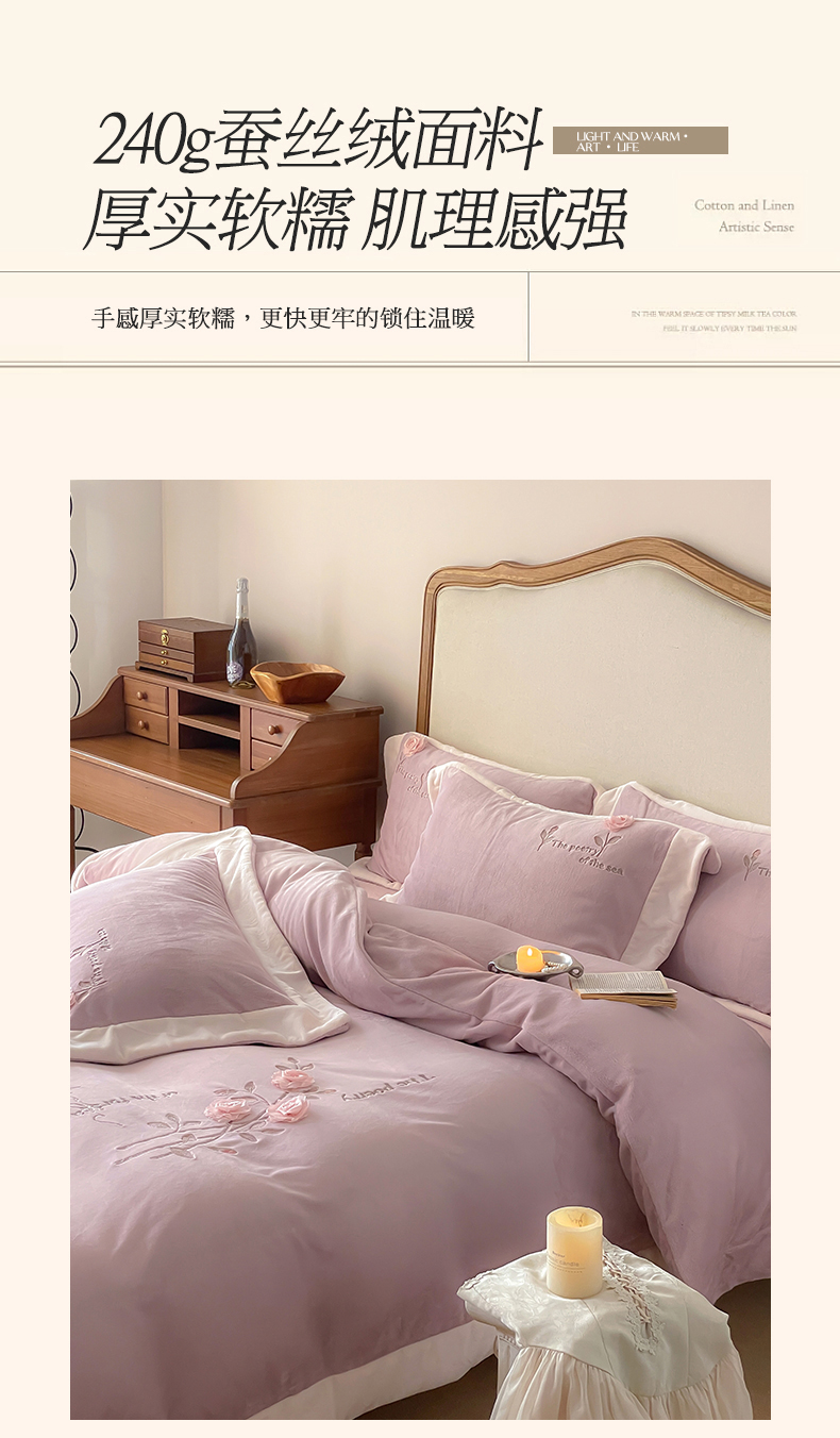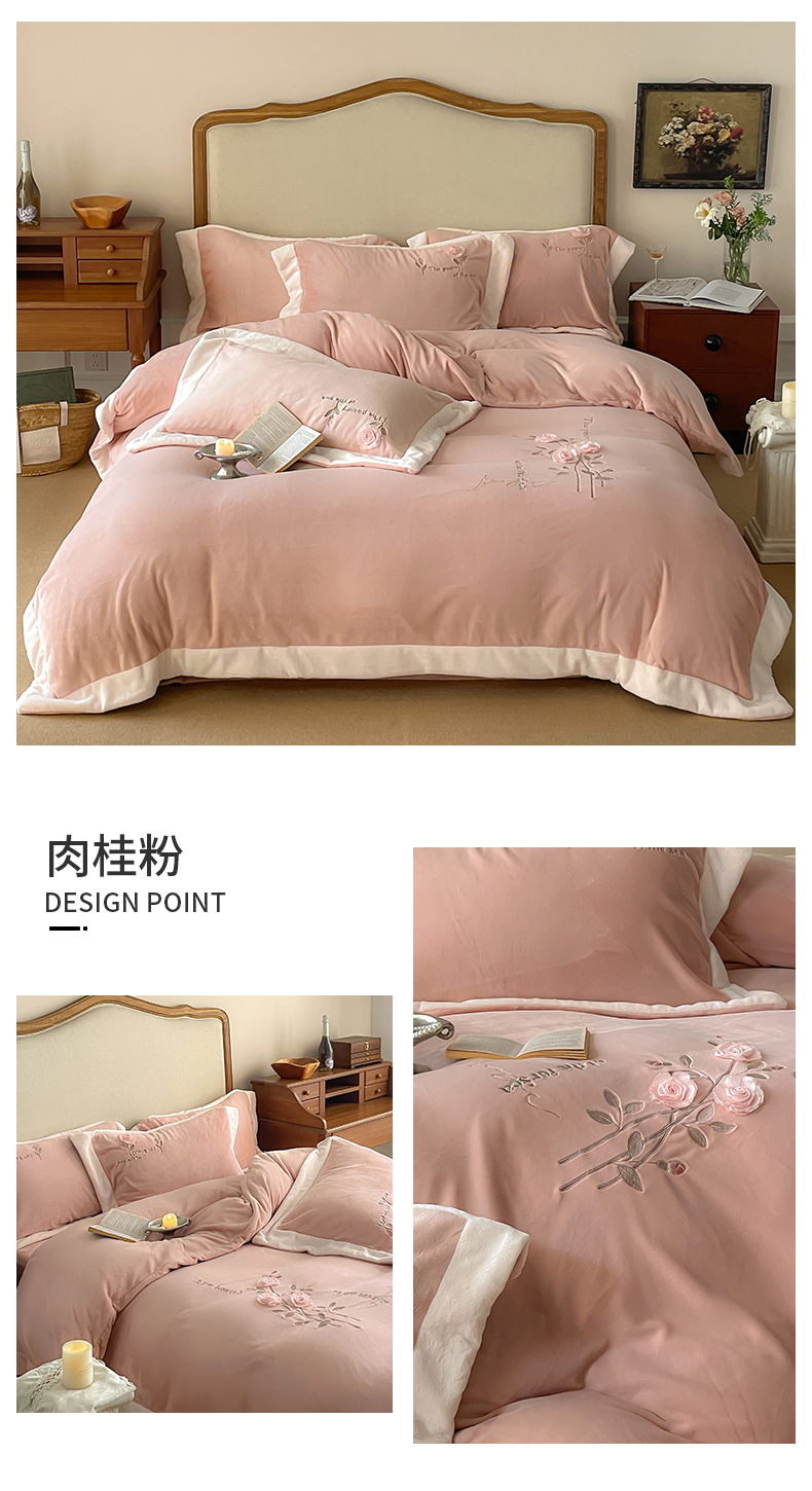 商品名称:名品优仓 2024新款高克重牛奶绒立体绣花四件套-爱丽莎 木槿柴