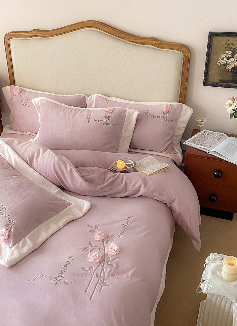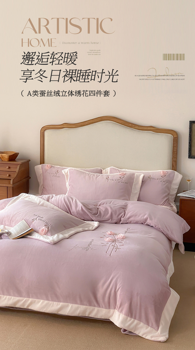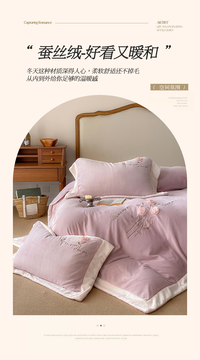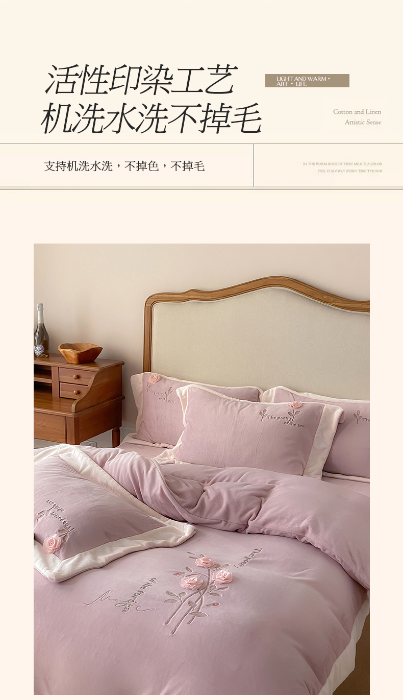 商品名称:名品优仓 2024新款高克重牛奶绒立体绣花四件套-爱丽莎 木槿柴