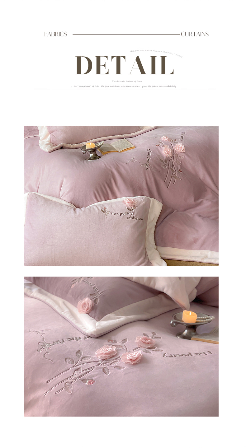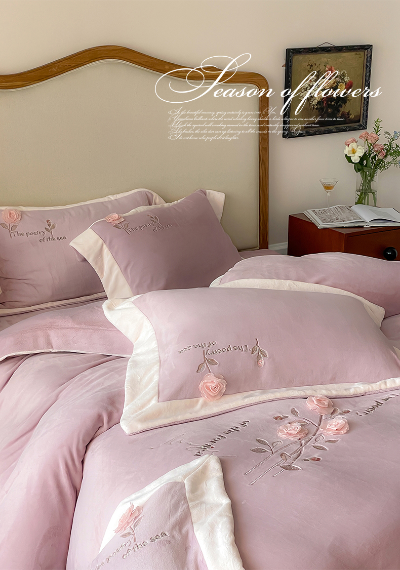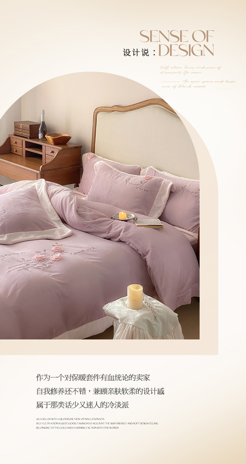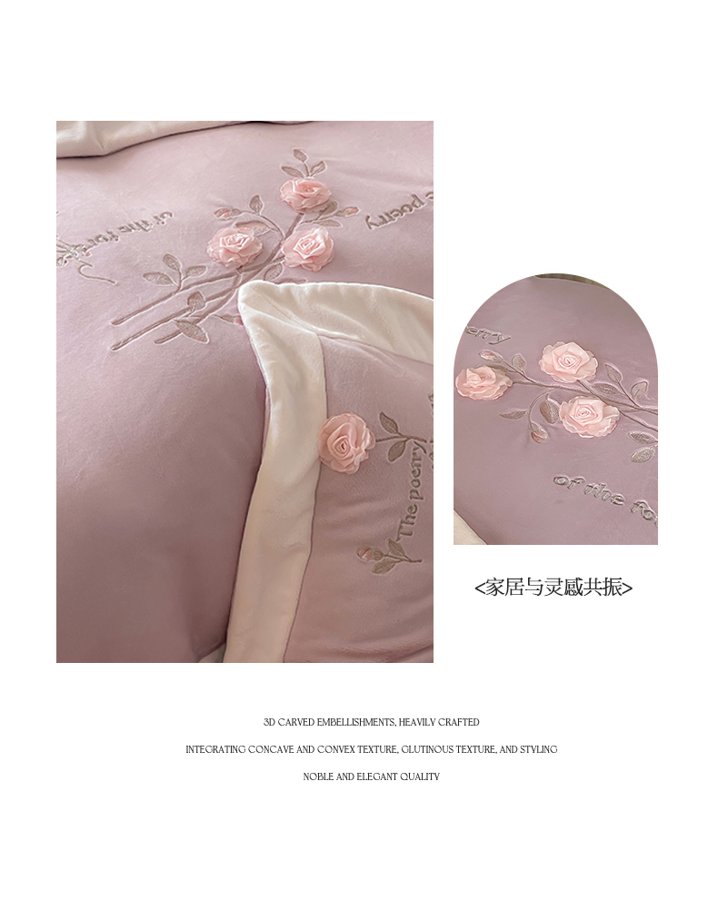 名品优仓 2024新款高克重牛奶绒立体绣花四件套-爱丽莎 木槿柴