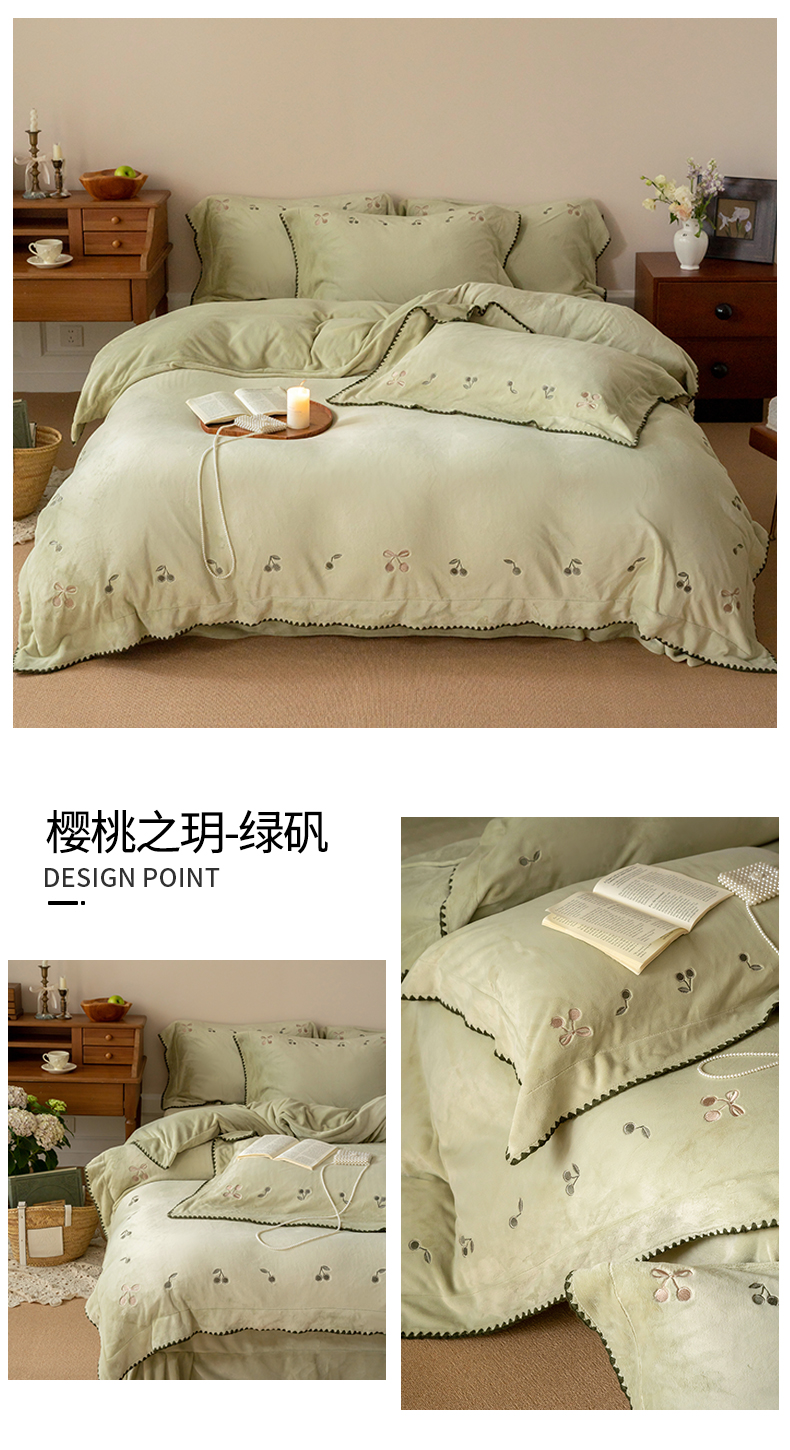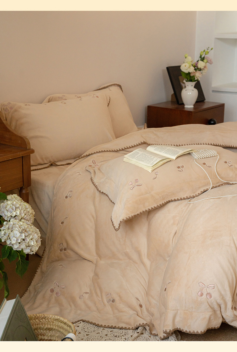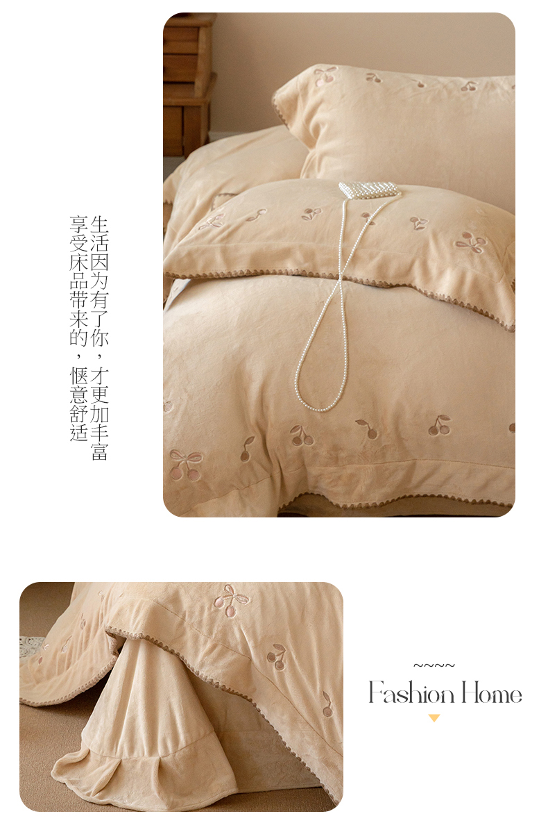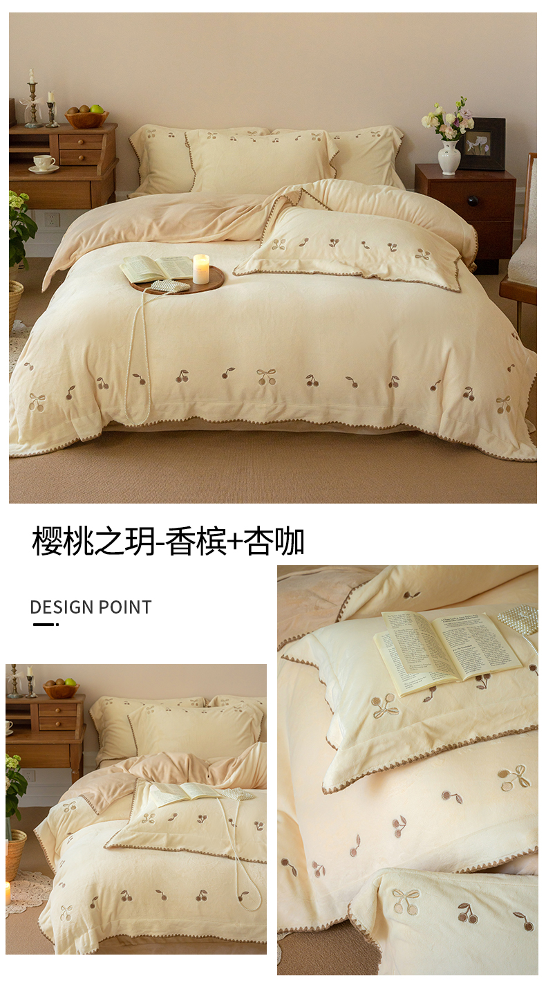名品优仓 2024新款高克重牛奶绒绣花四件套-樱桃之玥 樱桃之玥-杏咖