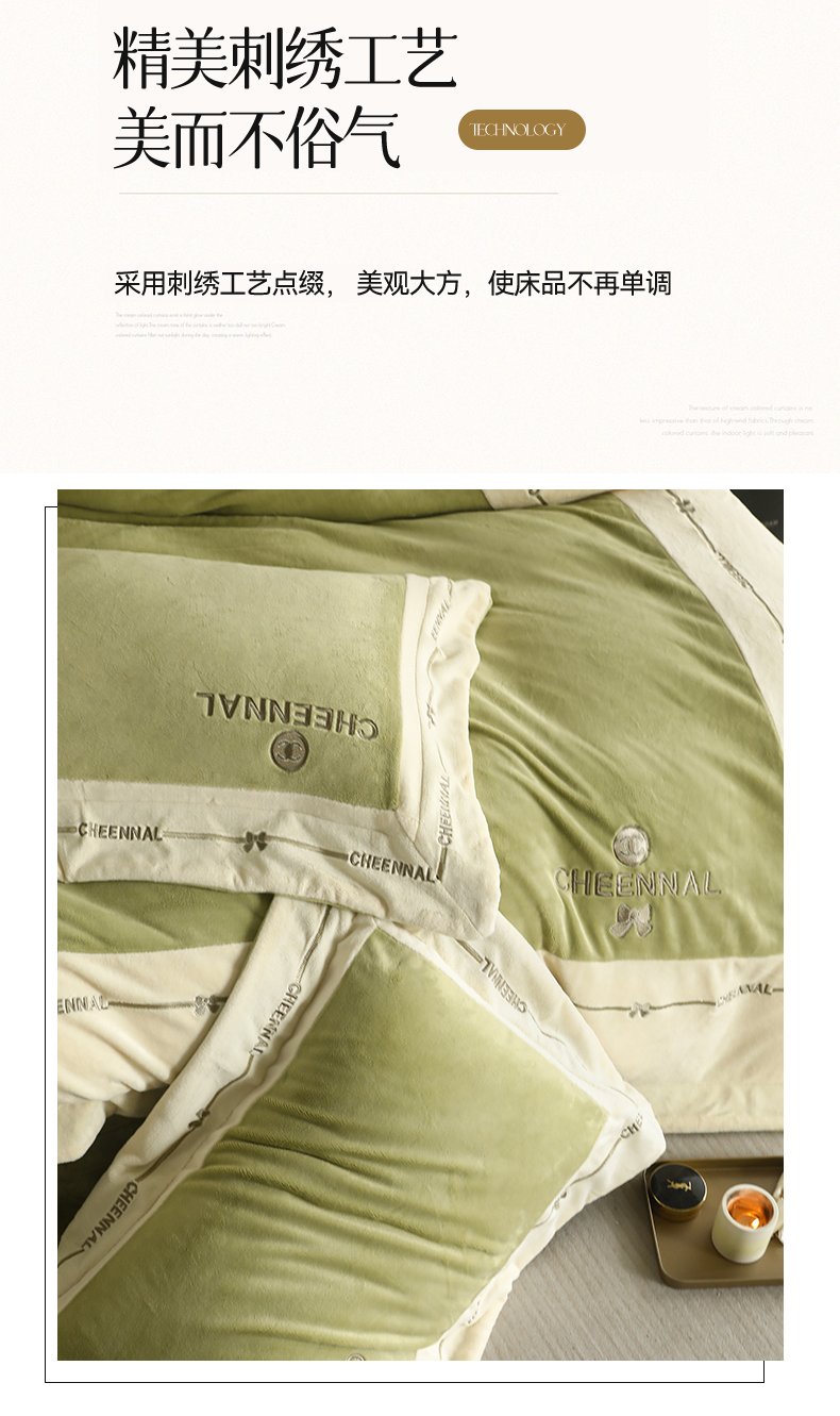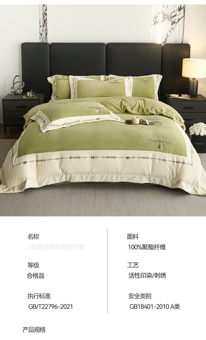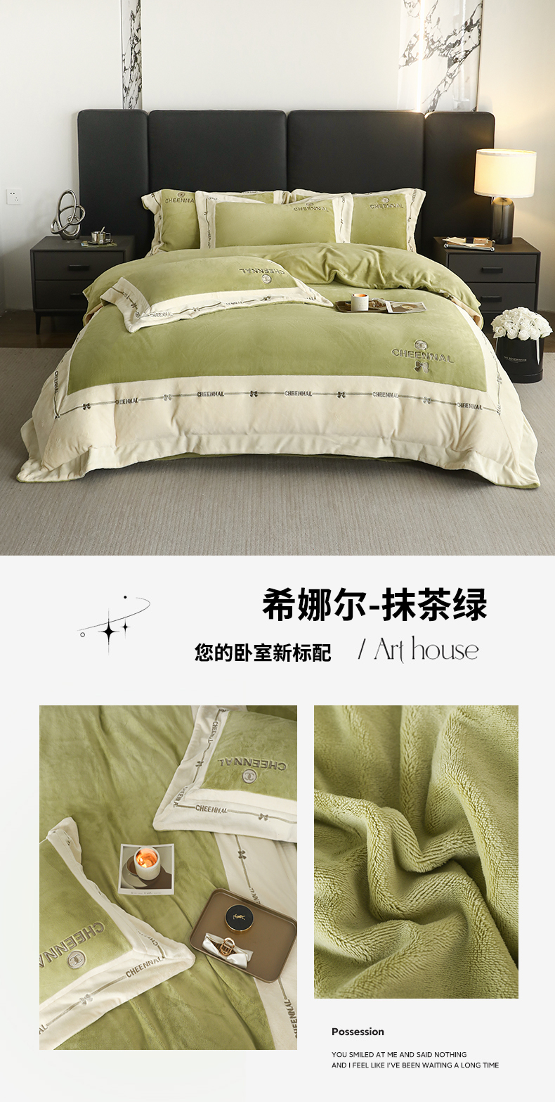 商品名称:名品优仓 2024新款高克重高克重牛奶绒四件套-希娜尔 希娜尔-抹茶绿