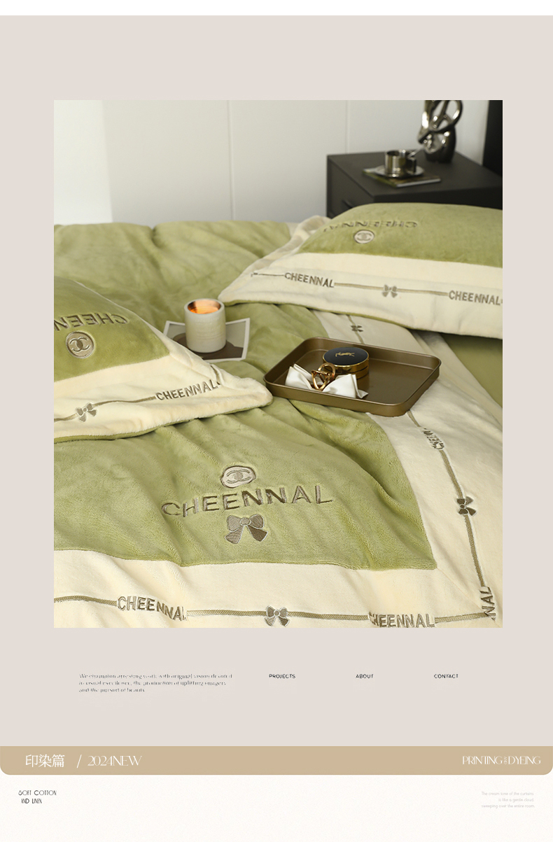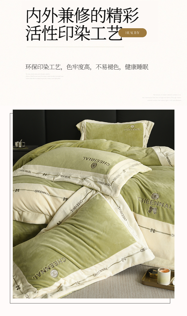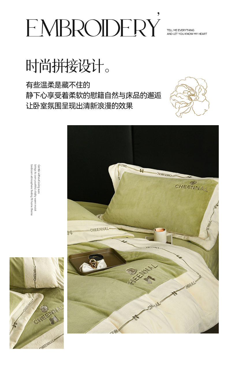 商品名称:名品优仓 2024新款高克重高克重牛奶绒四件套-希娜尔 希娜尔-抹茶绿