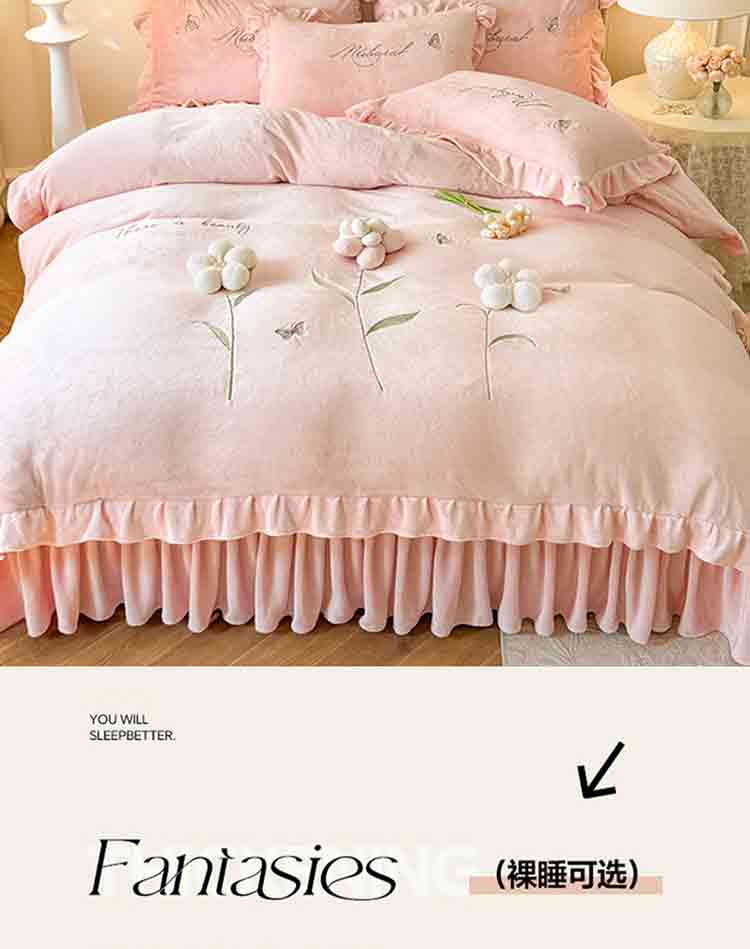 漫布云2025秋冬新款11斤230g全消光牛奶绒夹棉床盖款四件套纯色蕾丝花边刺绣床裙款床盖,蝶恋花-梦幻紫, 蝶恋花-嫩黄 ,蝶恋花-新芽绿, 蝶恋花-婴儿蓝, 蝶恋花-樱花粉
