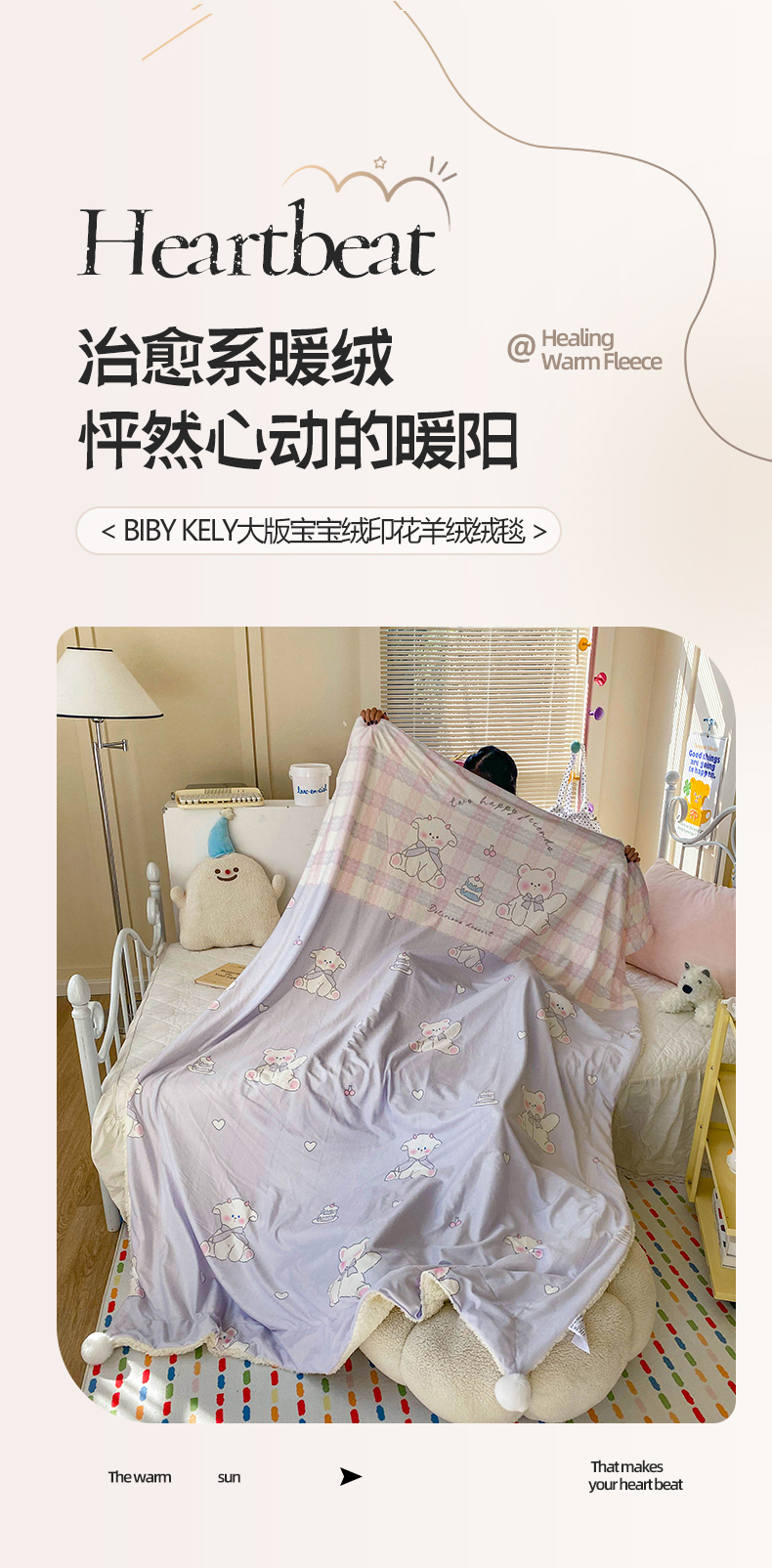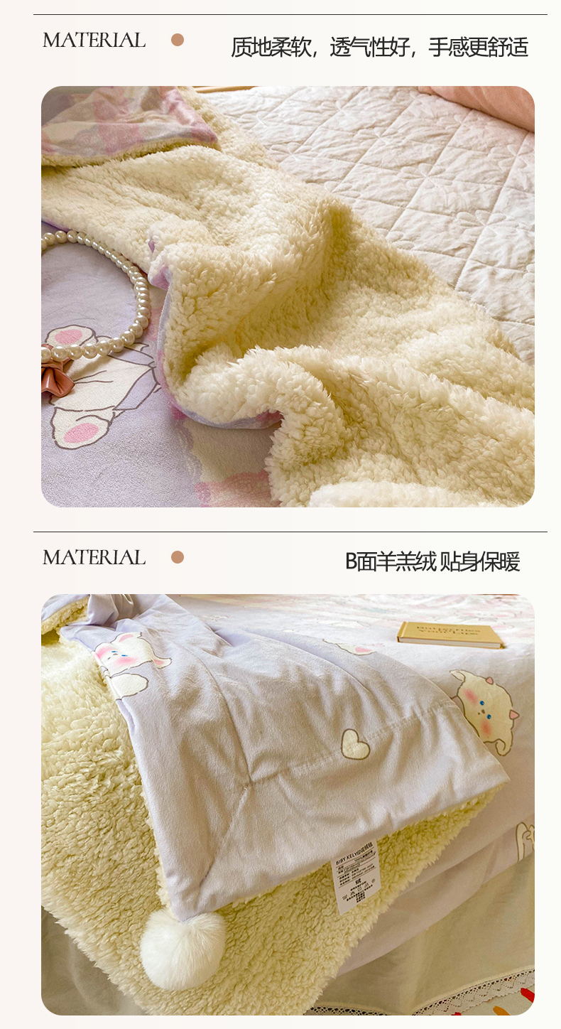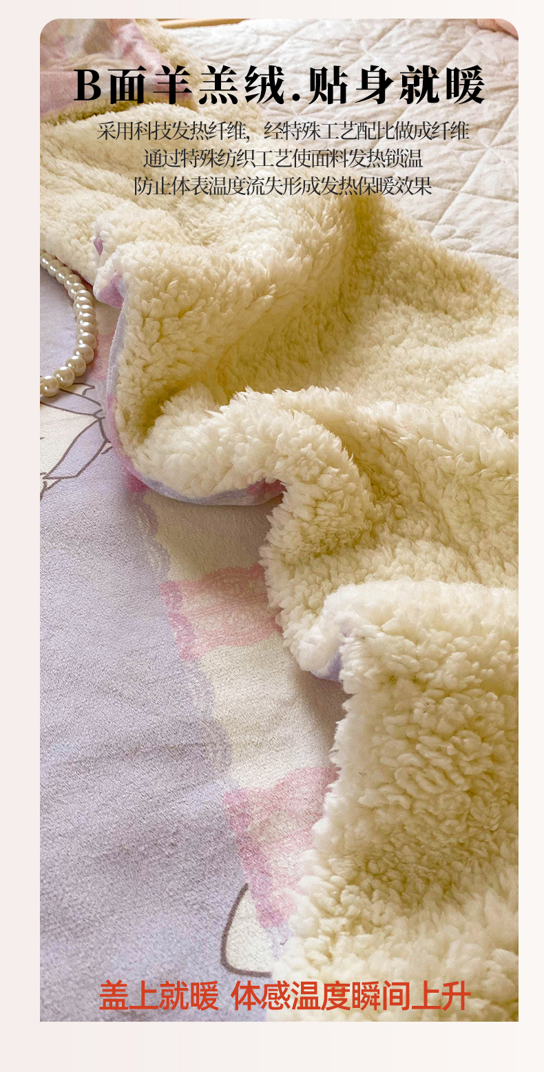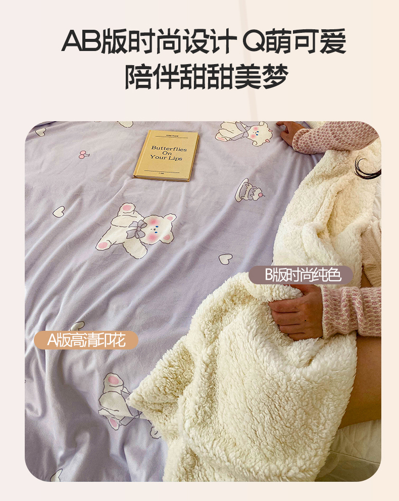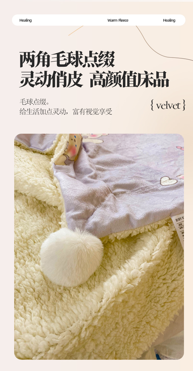 商品名称:潮邦创意家居 2025新款印花大版羊羔绒球-BIBY KELY系列羊绒绒毯 粉紫小甜心