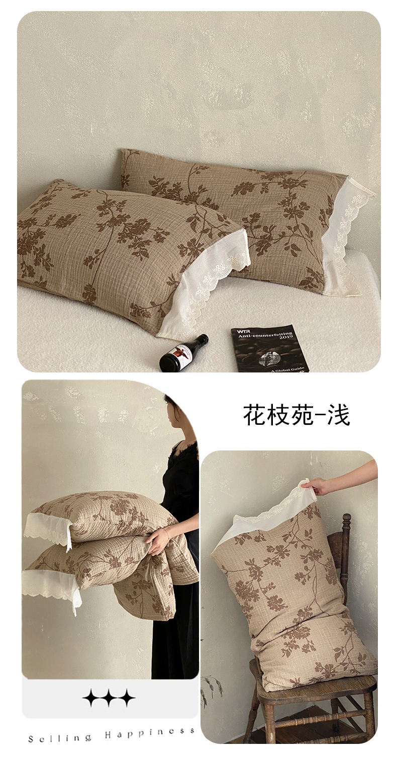 商品名称:麻依 2024新款法式四层纱布枕套花边款 花枝苑-浅