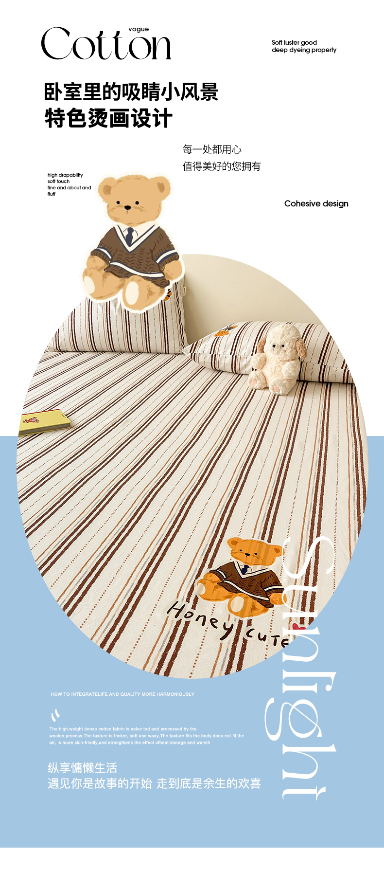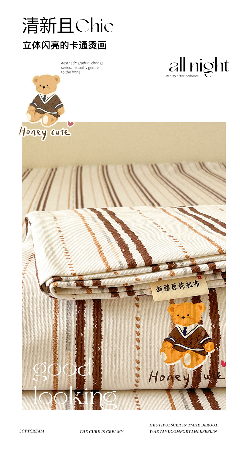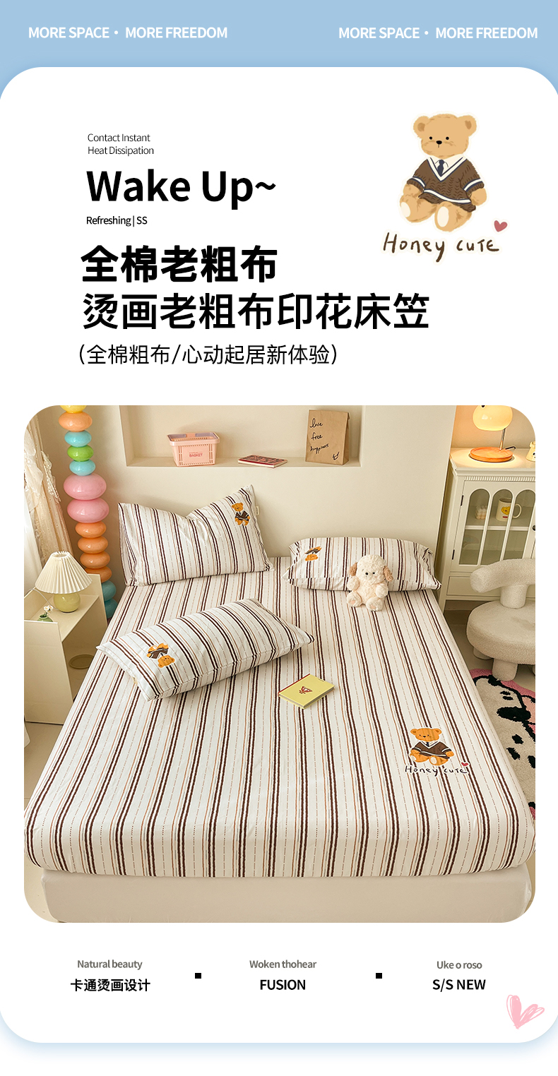 卧趣家纺 2025新款全棉烫画老粗布单品系列-床笠 甜心熊-棕