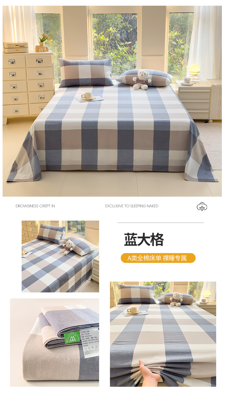 • 91家纺网 家纺一手货源 找家纺 柠萌家居 2025新款无印风全棉色织A类母婴级纯棉水洗棉床单 蓝大格