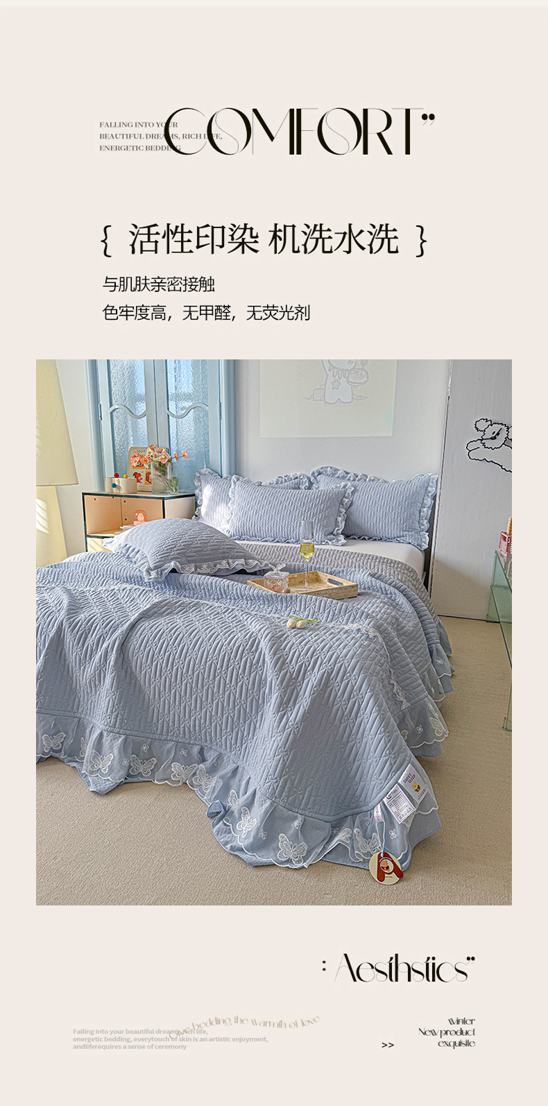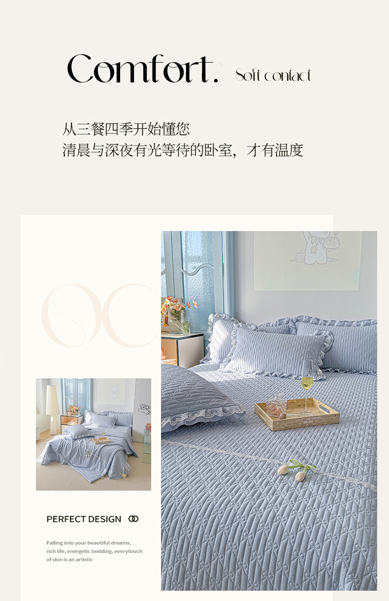 (总)源舜家纺 2025新款色织棉简约韩系花边床盖三件套,简约灰,简约粉,简约绿,简约驼,简约蓝