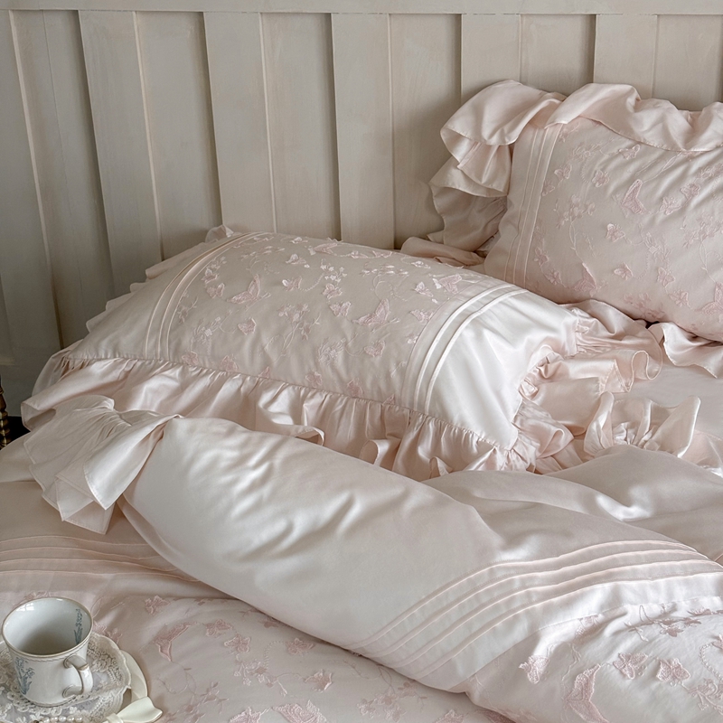 (总)佳汐蓝 2025春夏新品双层皱皱纱刺绣+织带+荷叶边四件套--白茶花,奶白,曲奇