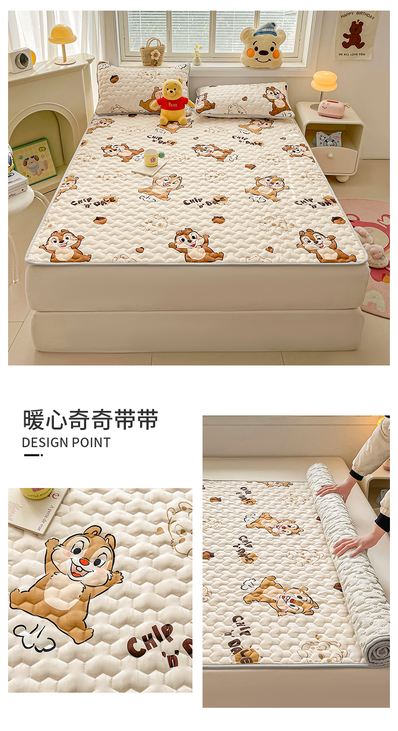 商品名称:迪梦思家纺 2025新款A类正版授权卡通印花水洗棉夹棉学生床护垫 暖心奇奇带带