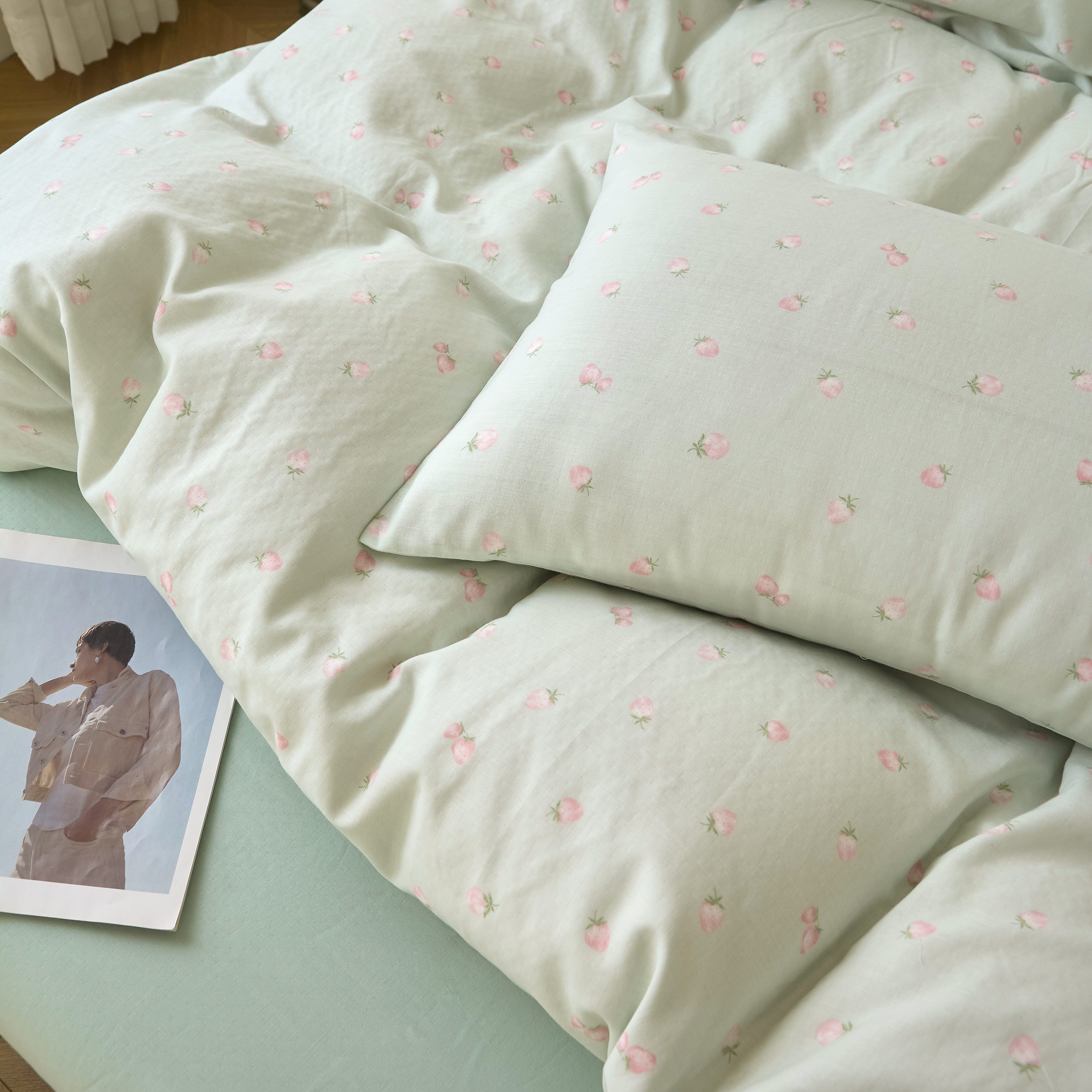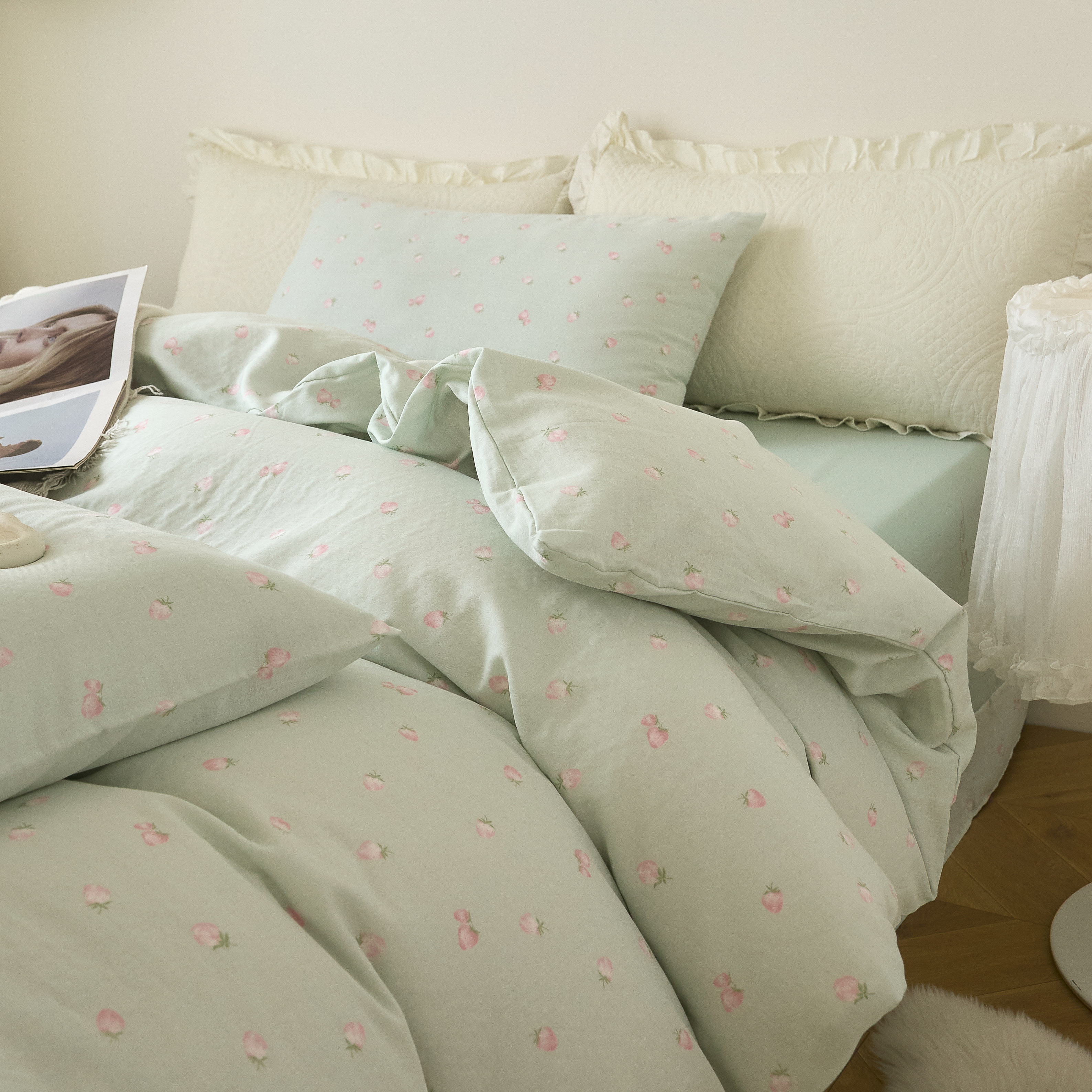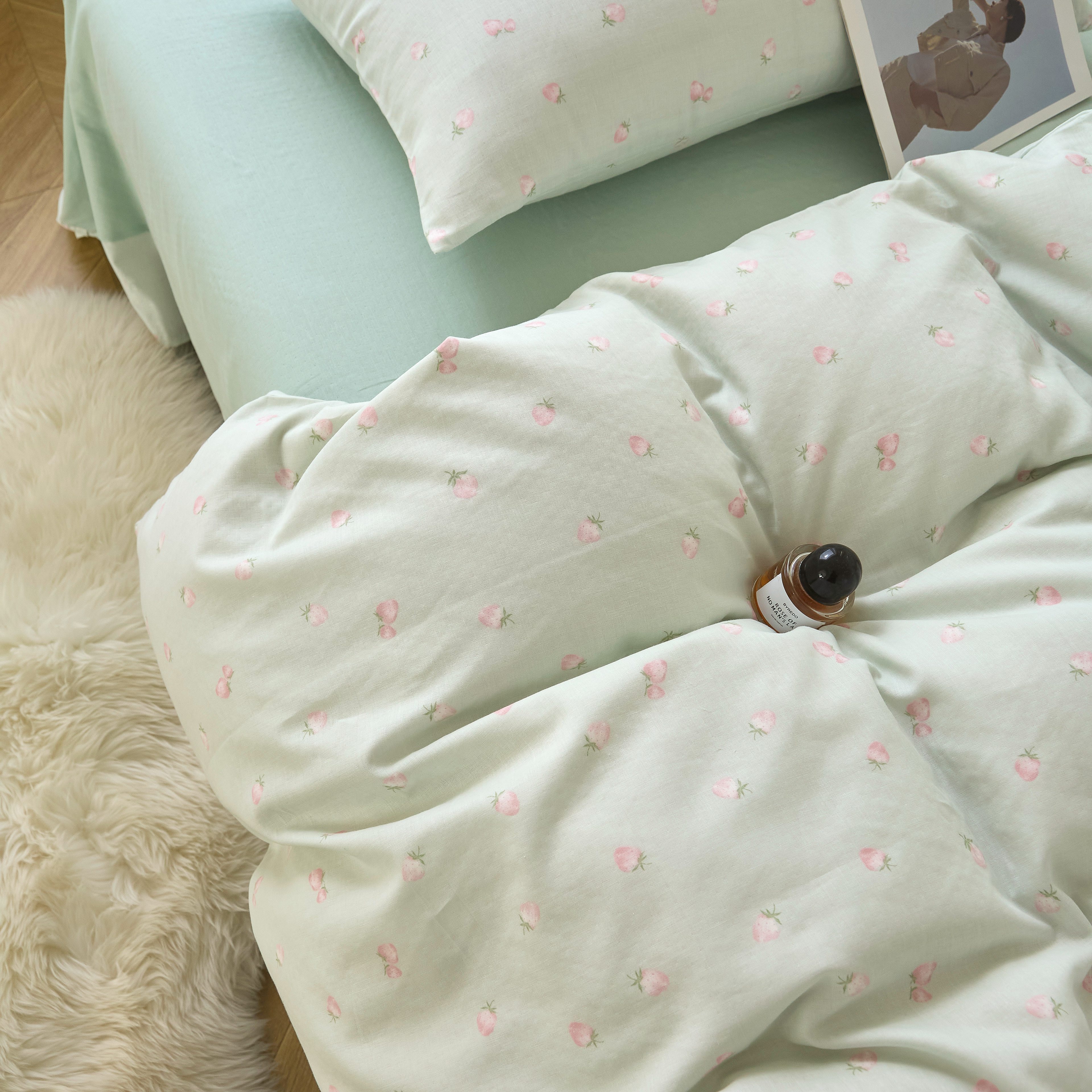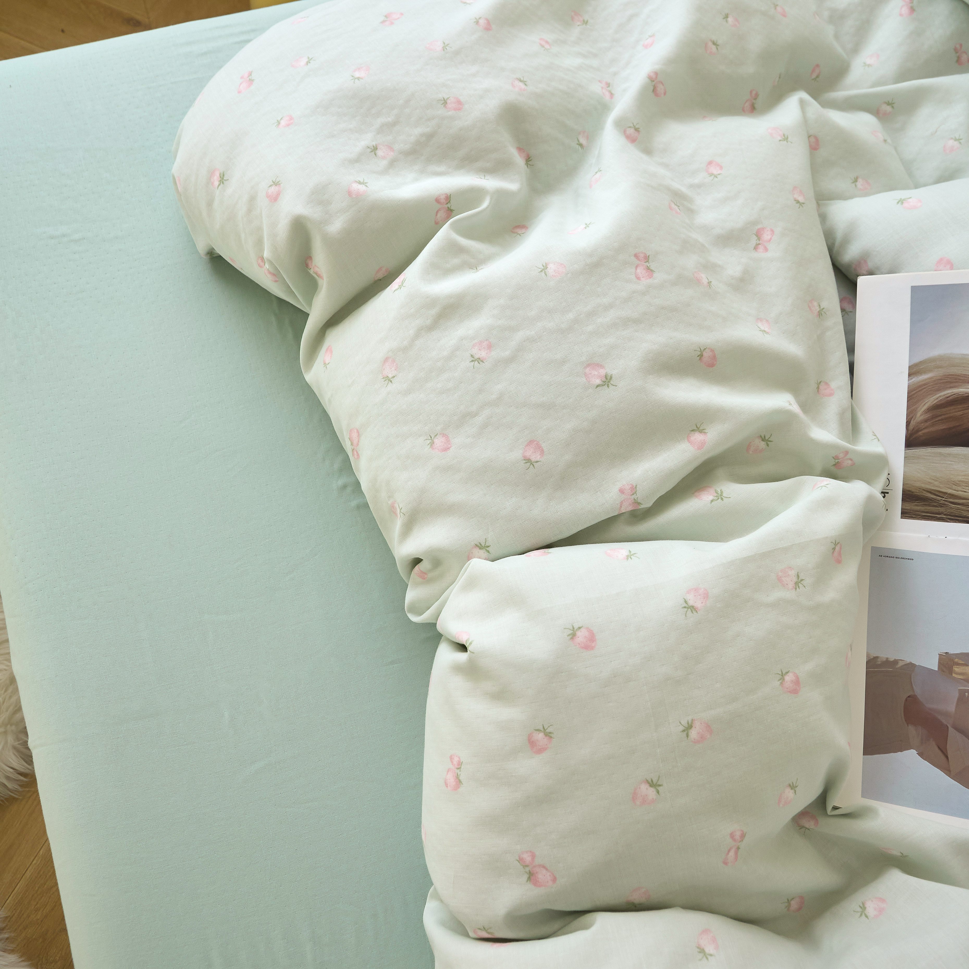 商品名称:嘉汀兰家居 2025新款圆角花边款全棉纯棉A类母婴级有氧全棉双层纱亲肤全棉小清新印花四件套 绿底草莓