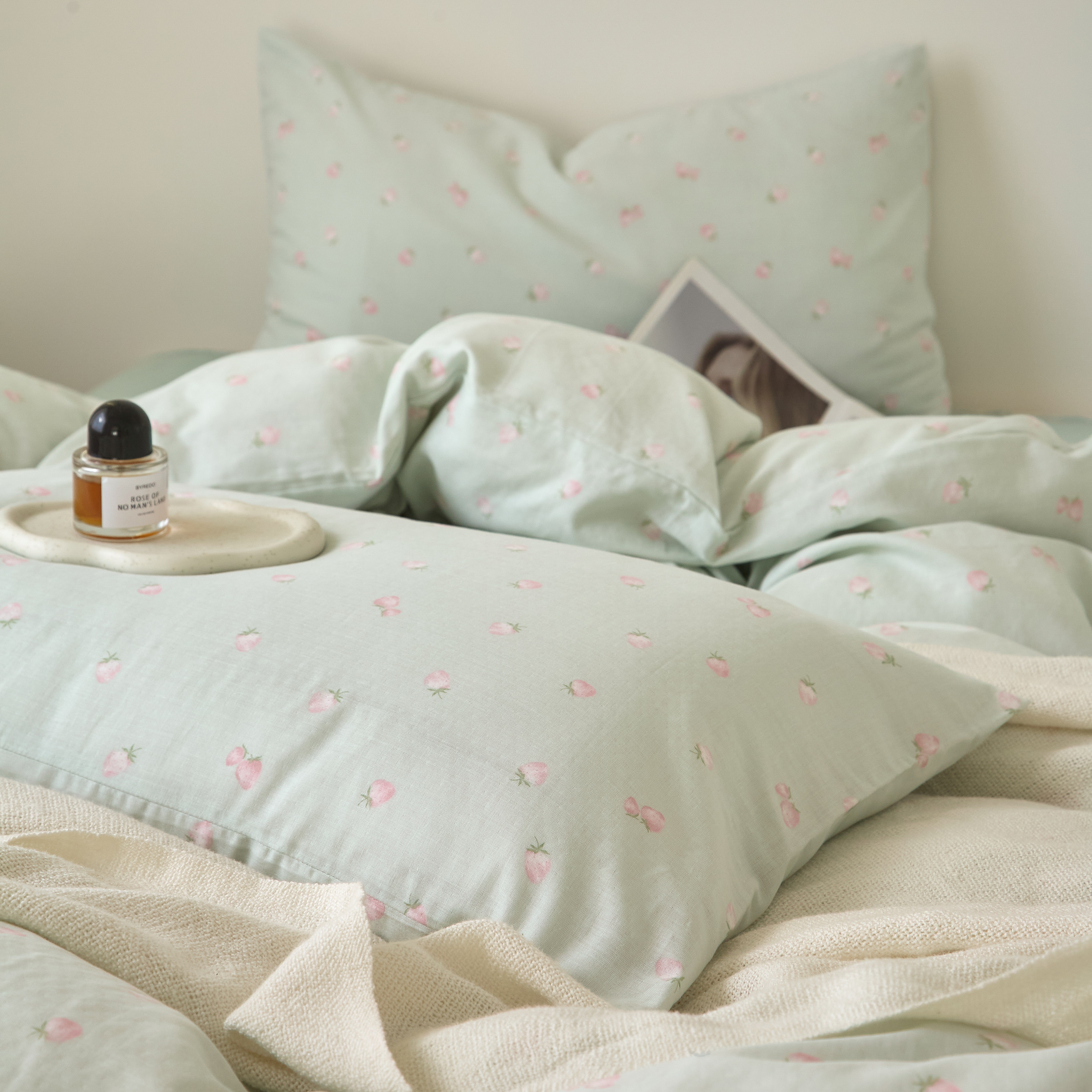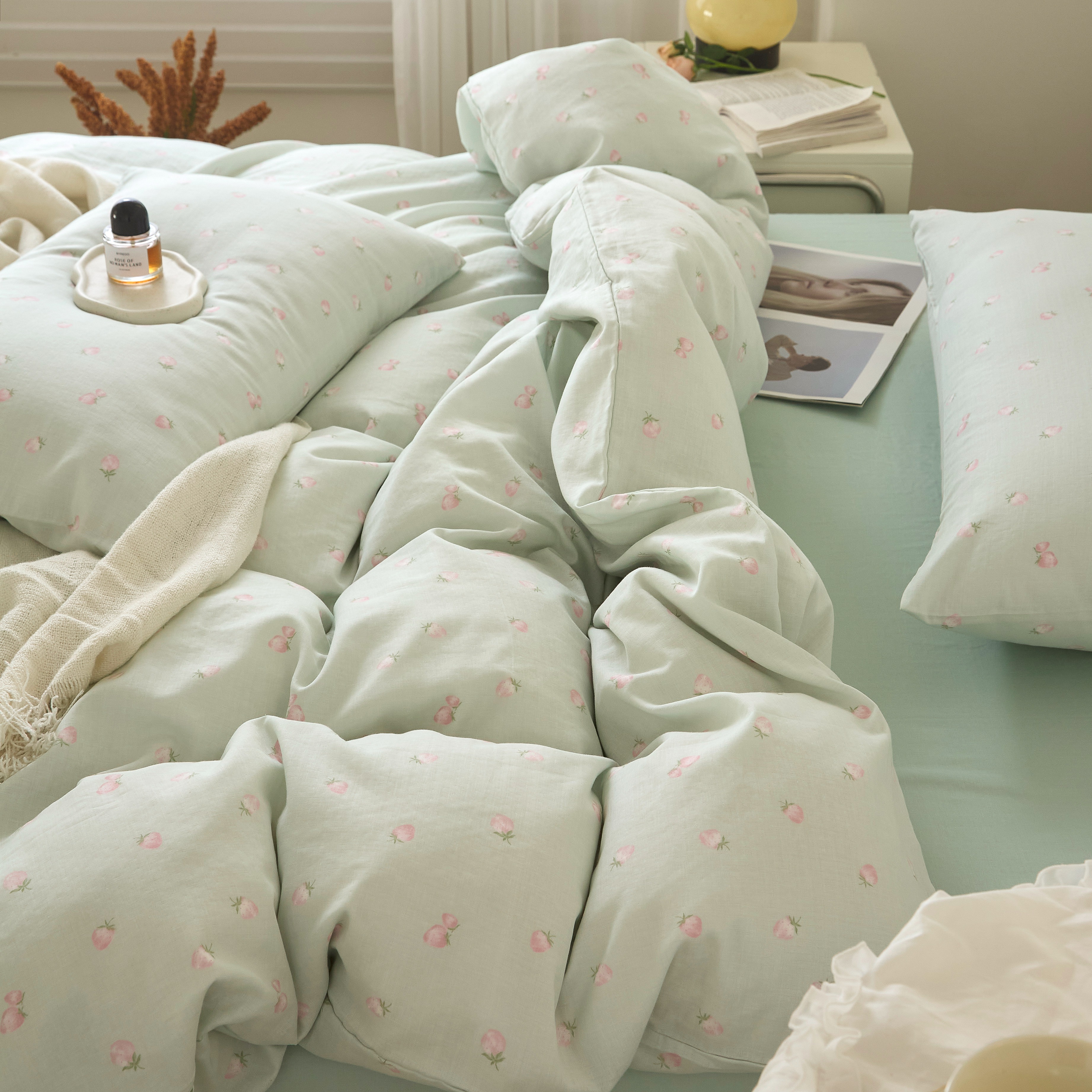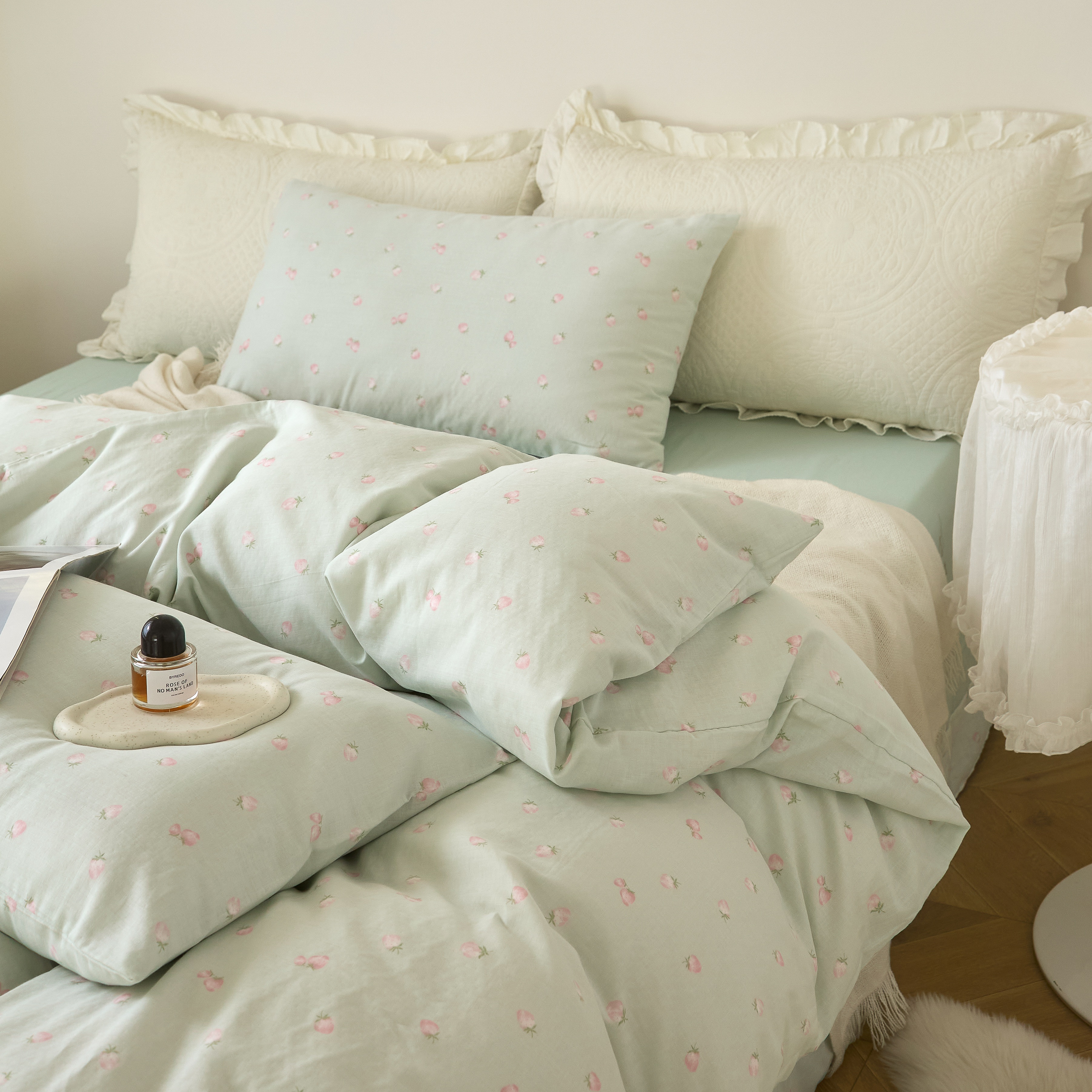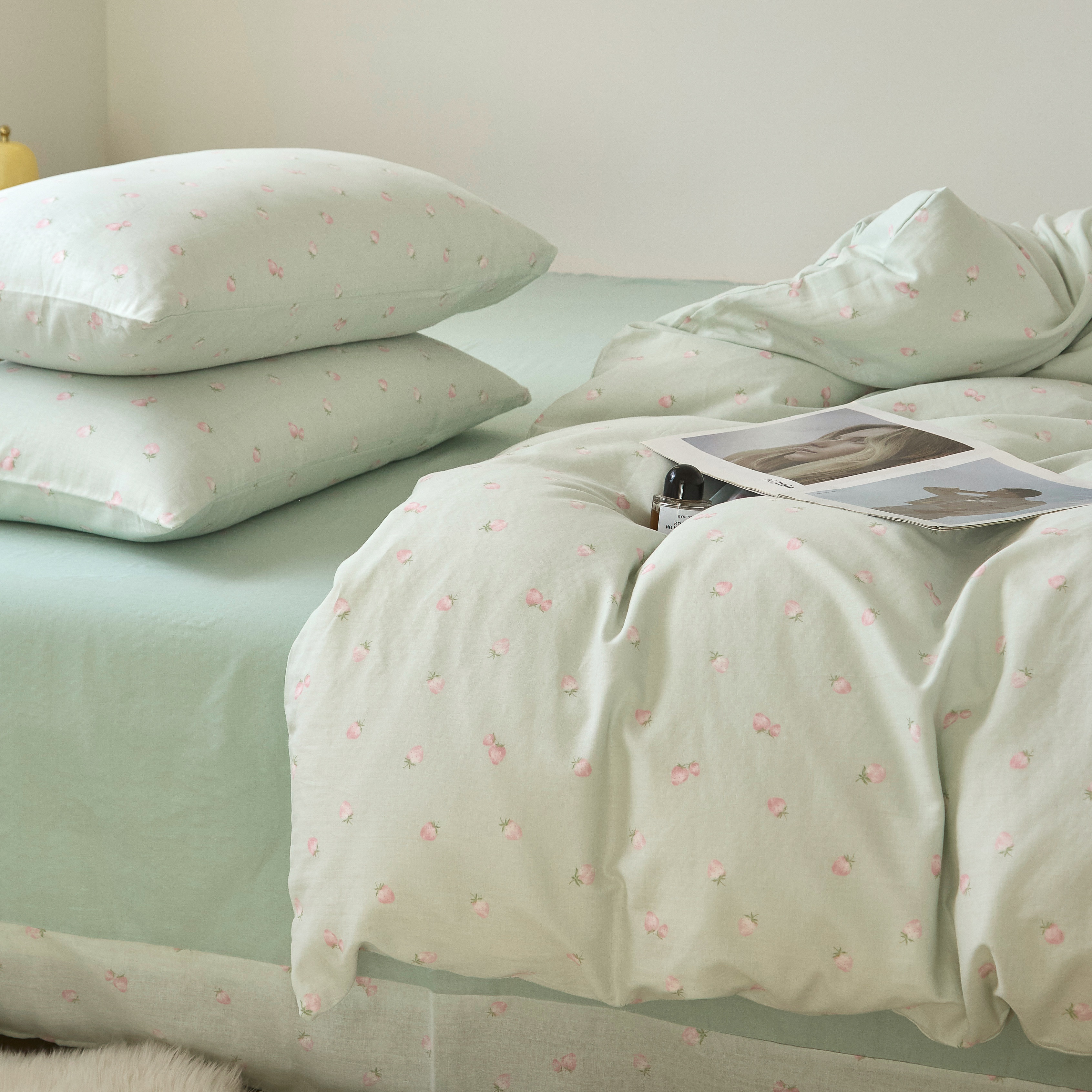 商品名称:嘉汀兰家居 2025新款圆角花边款全棉纯棉A类母婴级有氧全棉双层纱亲肤全棉小清新印花四件套 绿底草莓