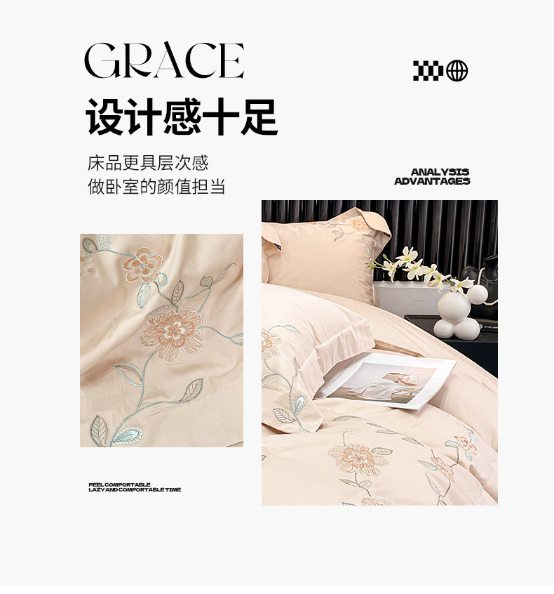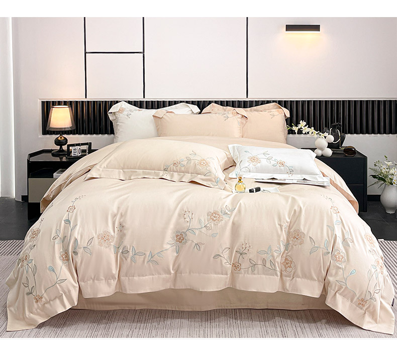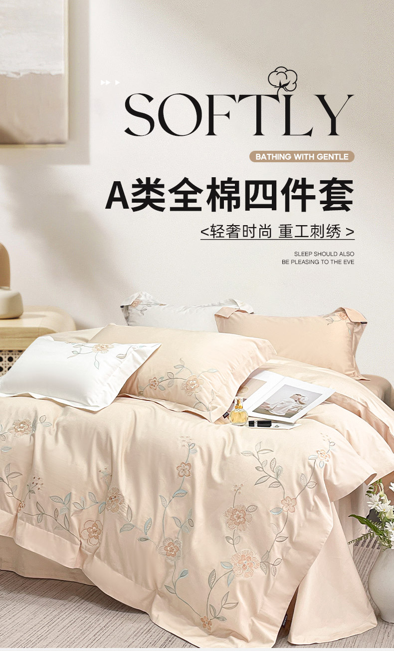 商品名称:2025新款春夏新款A类长绒棉全工艺刺绣四件套纯棉全棉轻奢风直播高端床上用品 蔓艺-奶杏