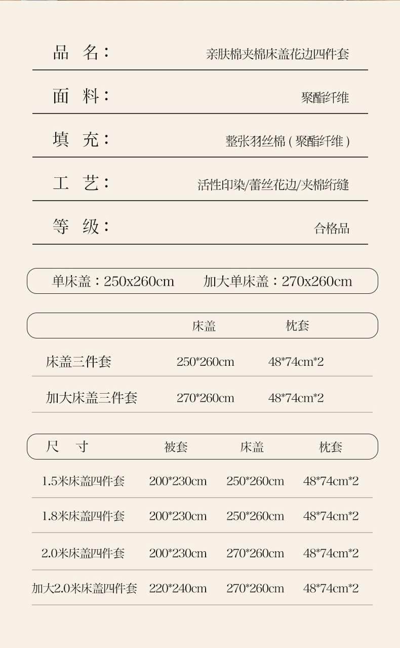 1.8米床盖四件套:被套200x230cm+床盖250x260cm+2只枕套 | ¥80.00 |