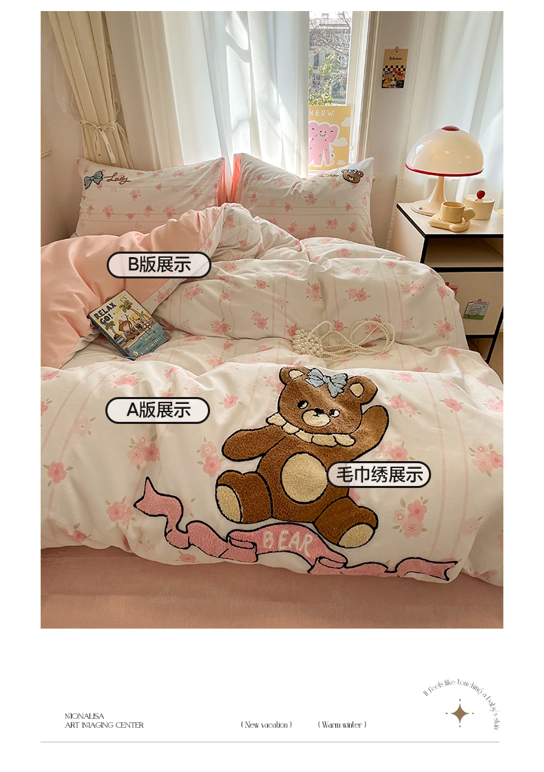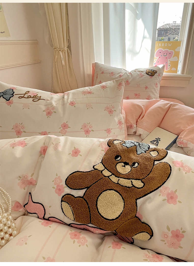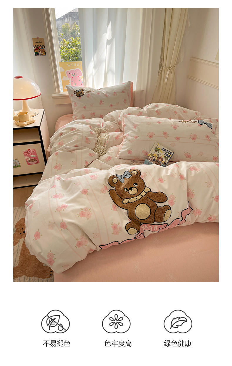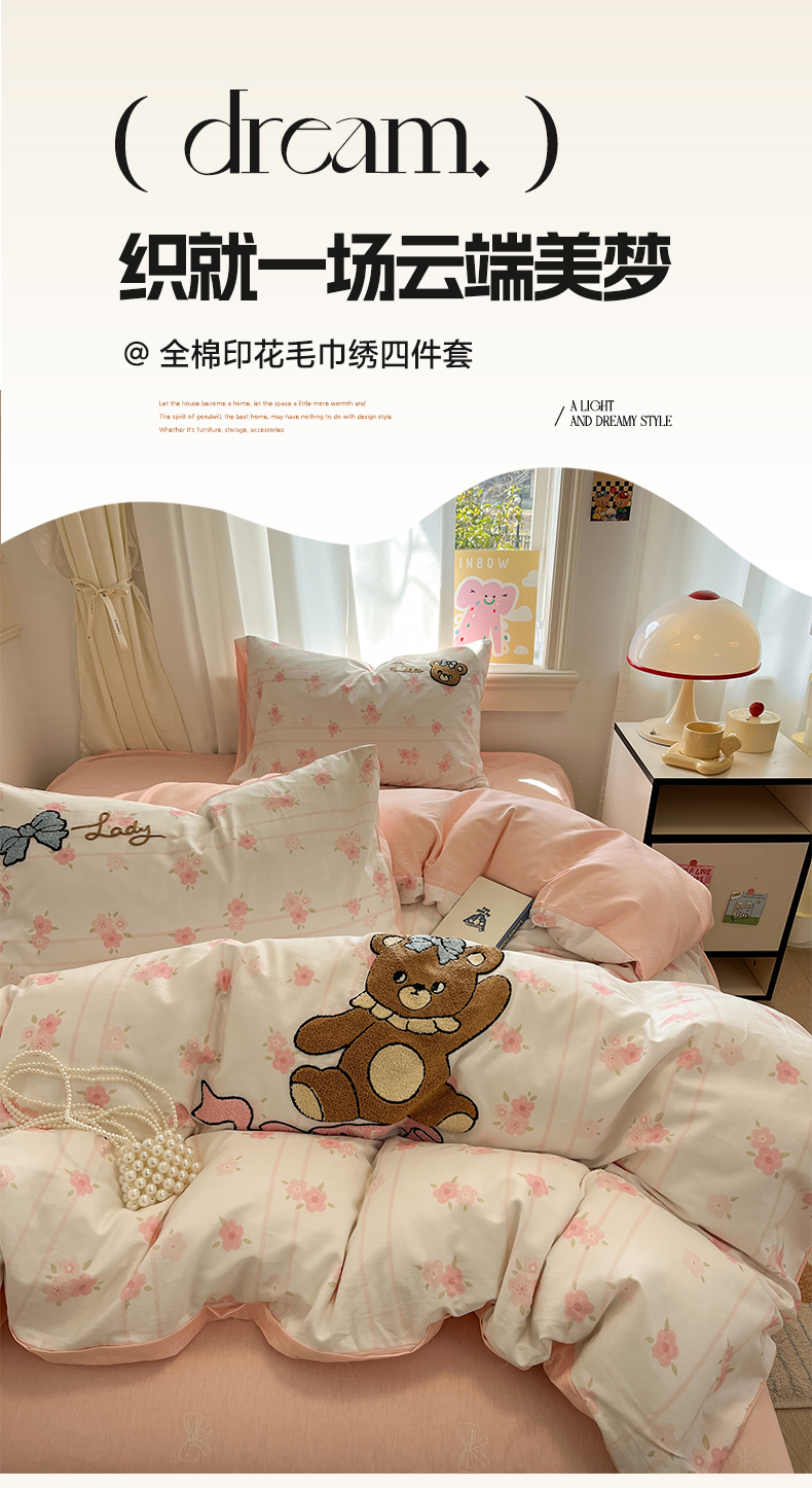 当前位置: 91家纺网 > 商品网购 > 床品套件 > 四件套 > 全棉普通四件套 > 雅居纺家纺 2025春夏新款全棉纯棉毛巾绣四件套 蝴蝶结小熊