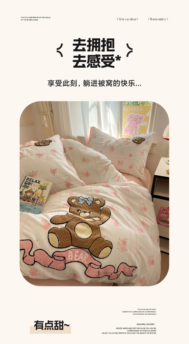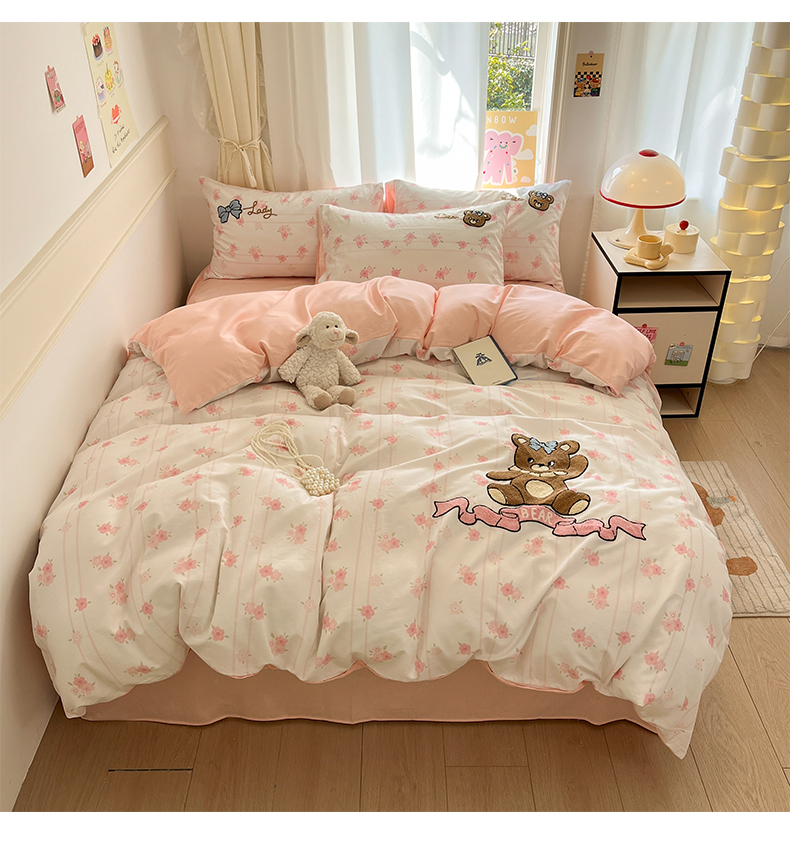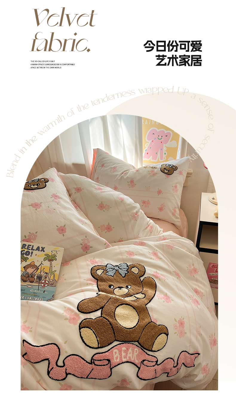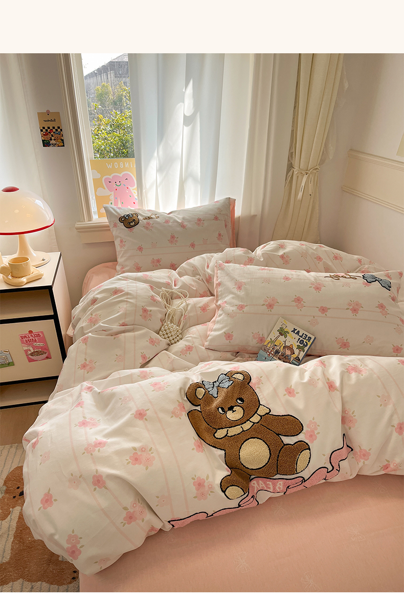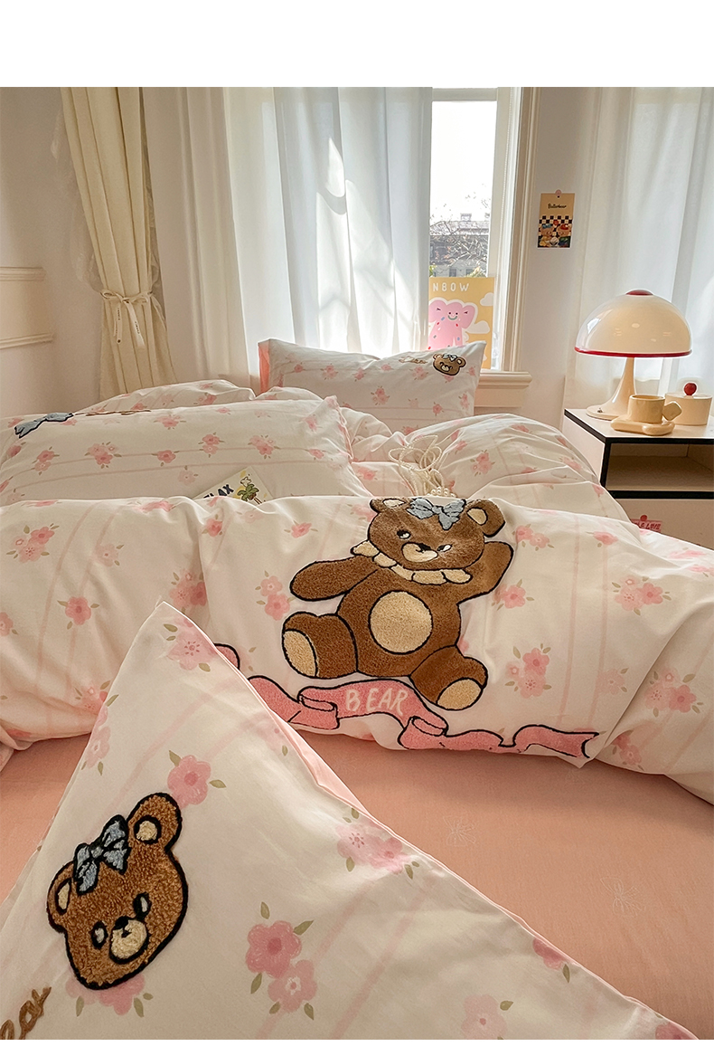 当前位置: 91家纺网 > 商品网购 > 床品套件 > 四件套 > 全棉普通四件套 > 雅居纺家纺 2025春夏新款全棉纯棉毛巾绣四件套 蝴蝶结小熊