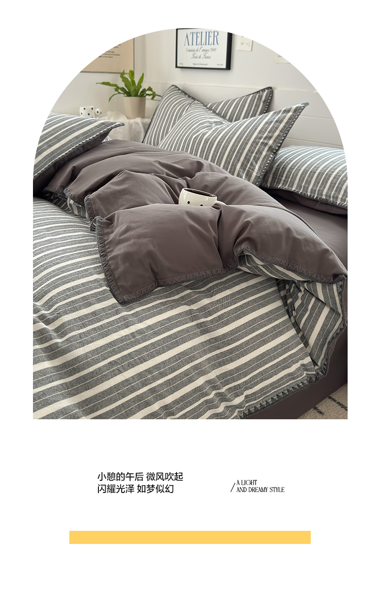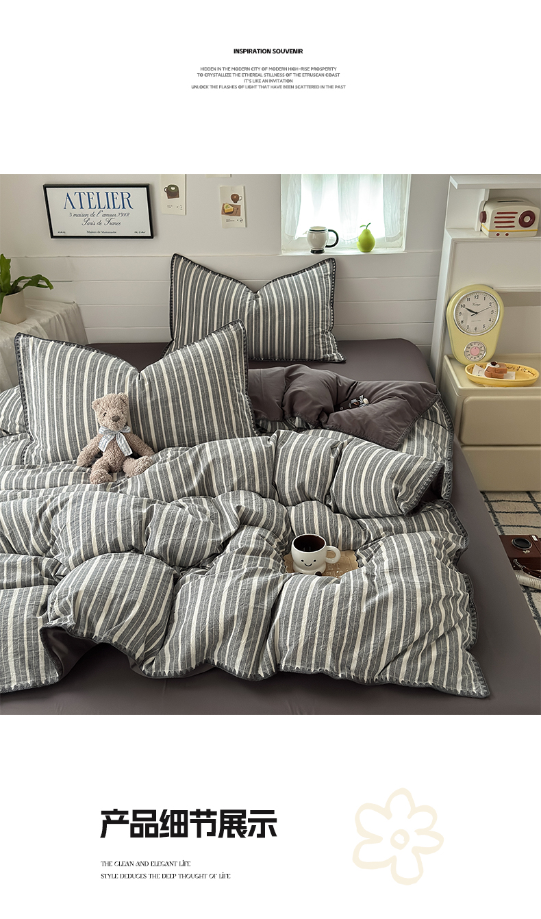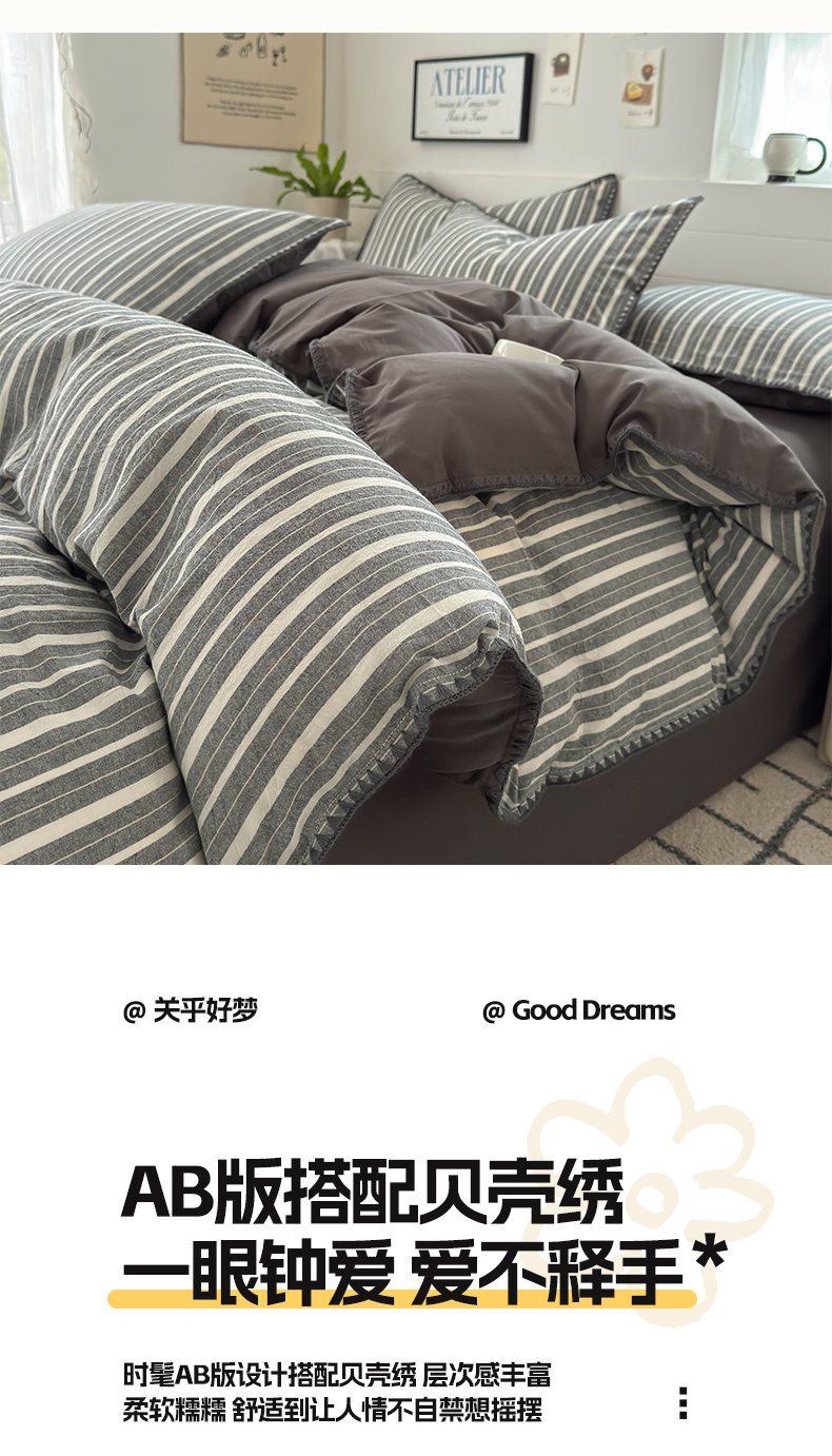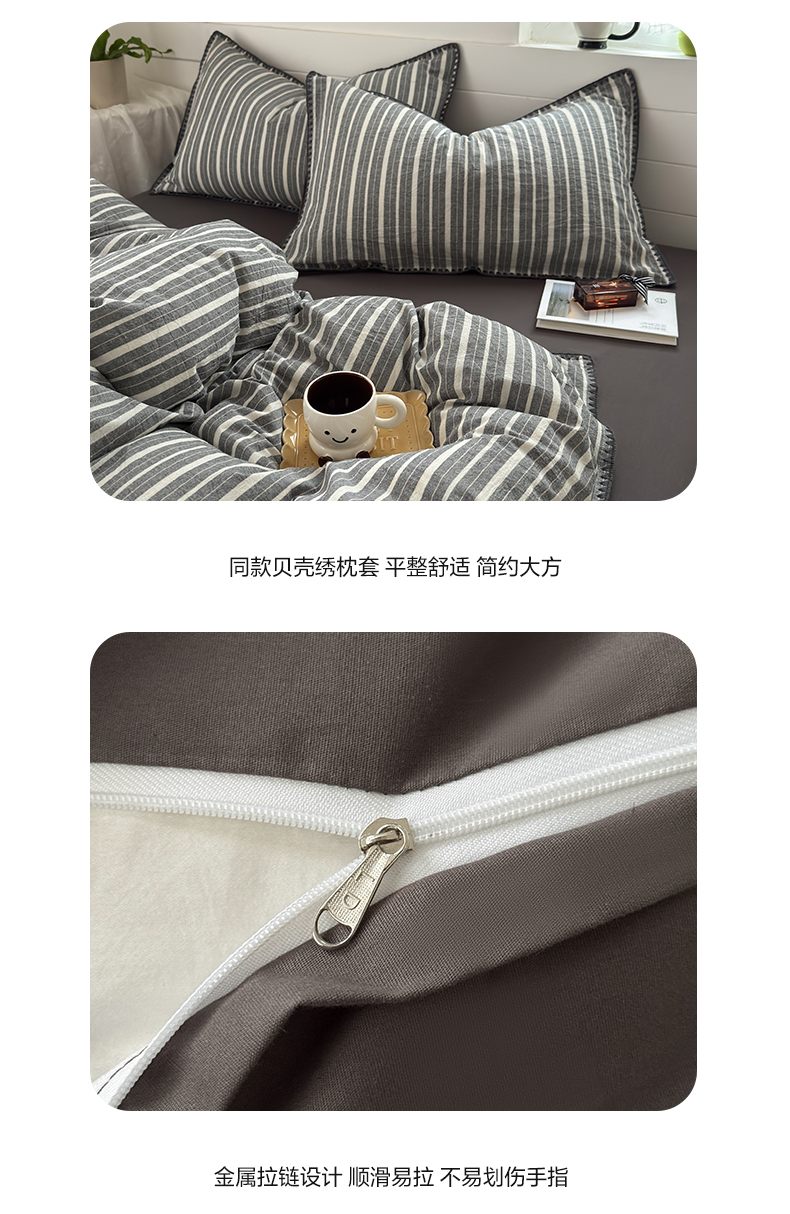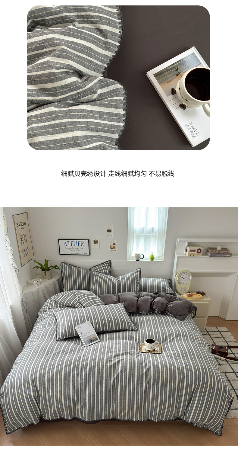 当前位置: 91家纺网 > 商品网购 > 床品套件 > 四件套 > 水洗棉四件套 > 2025新款A类全棉色织水洗棉贝壳绣条纹系列四件套 雅诗深灰
