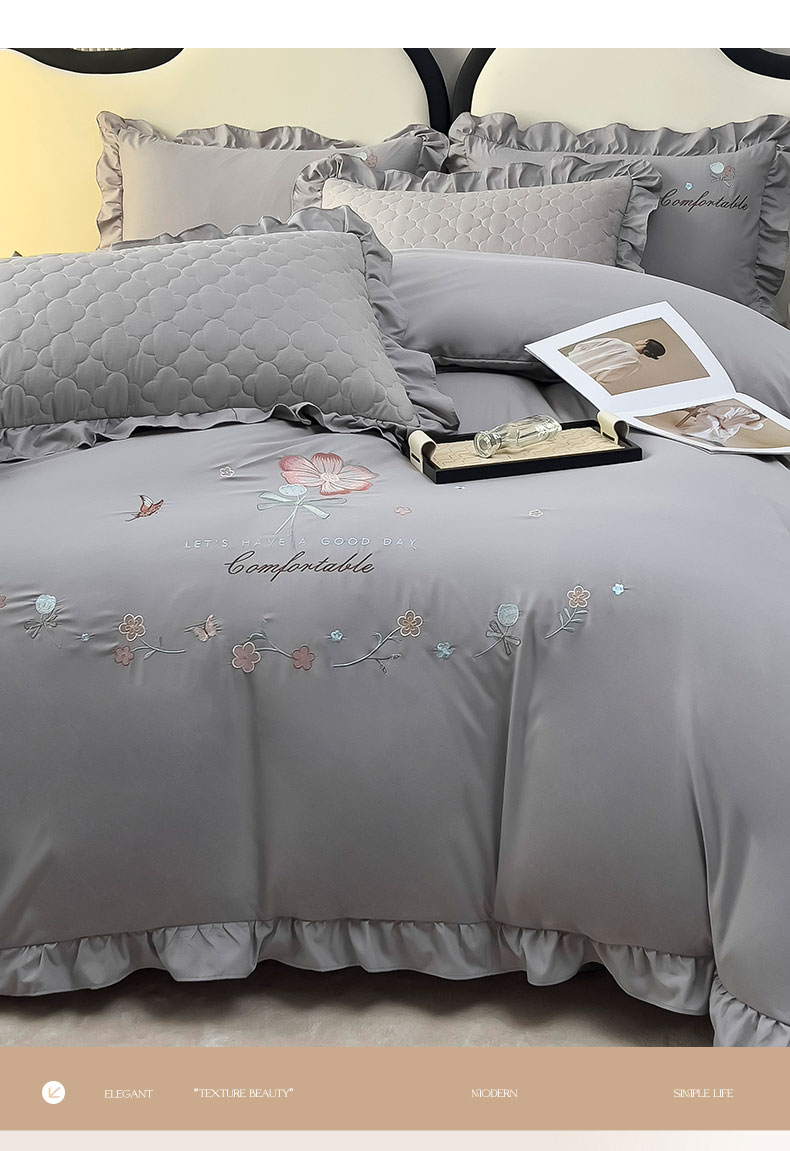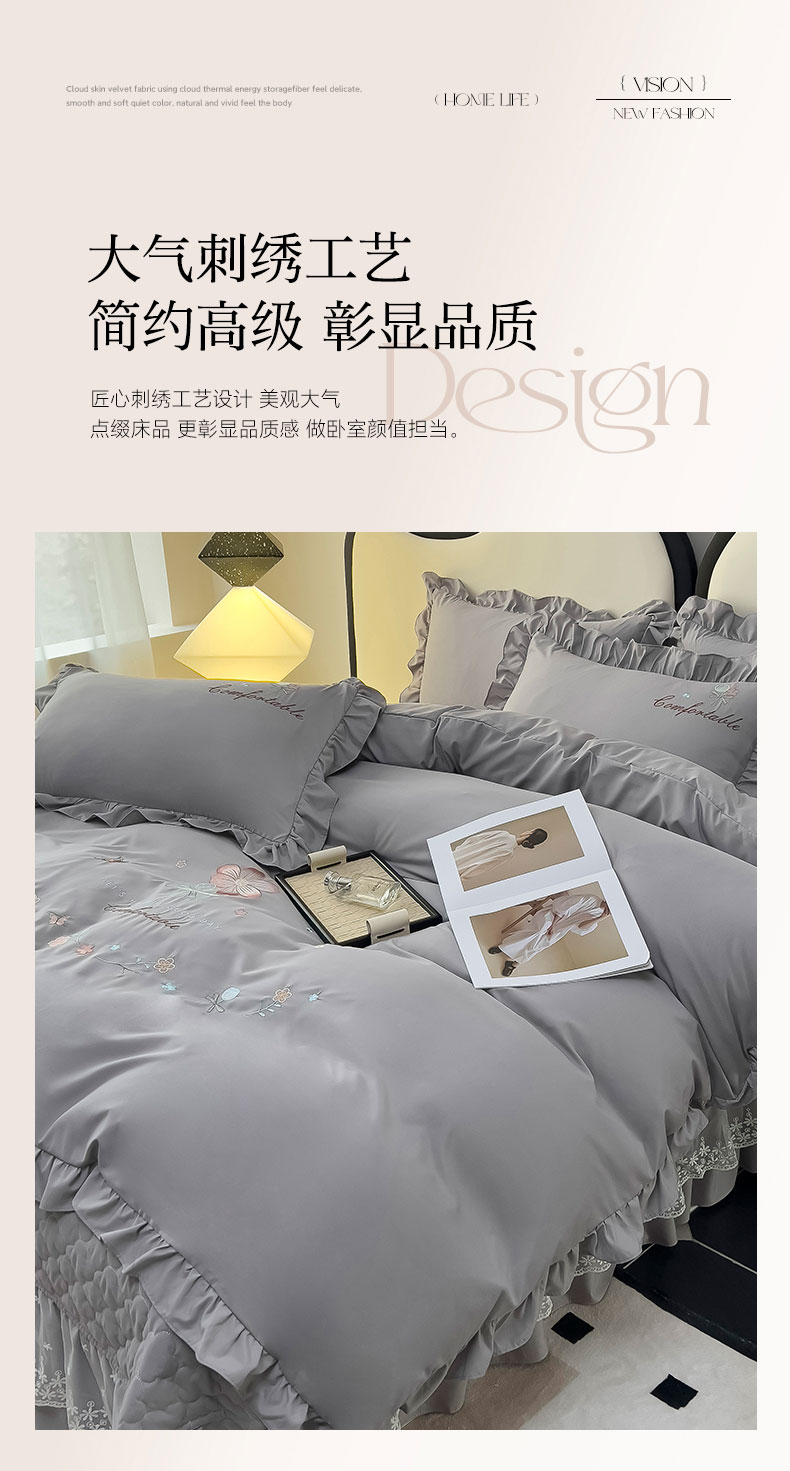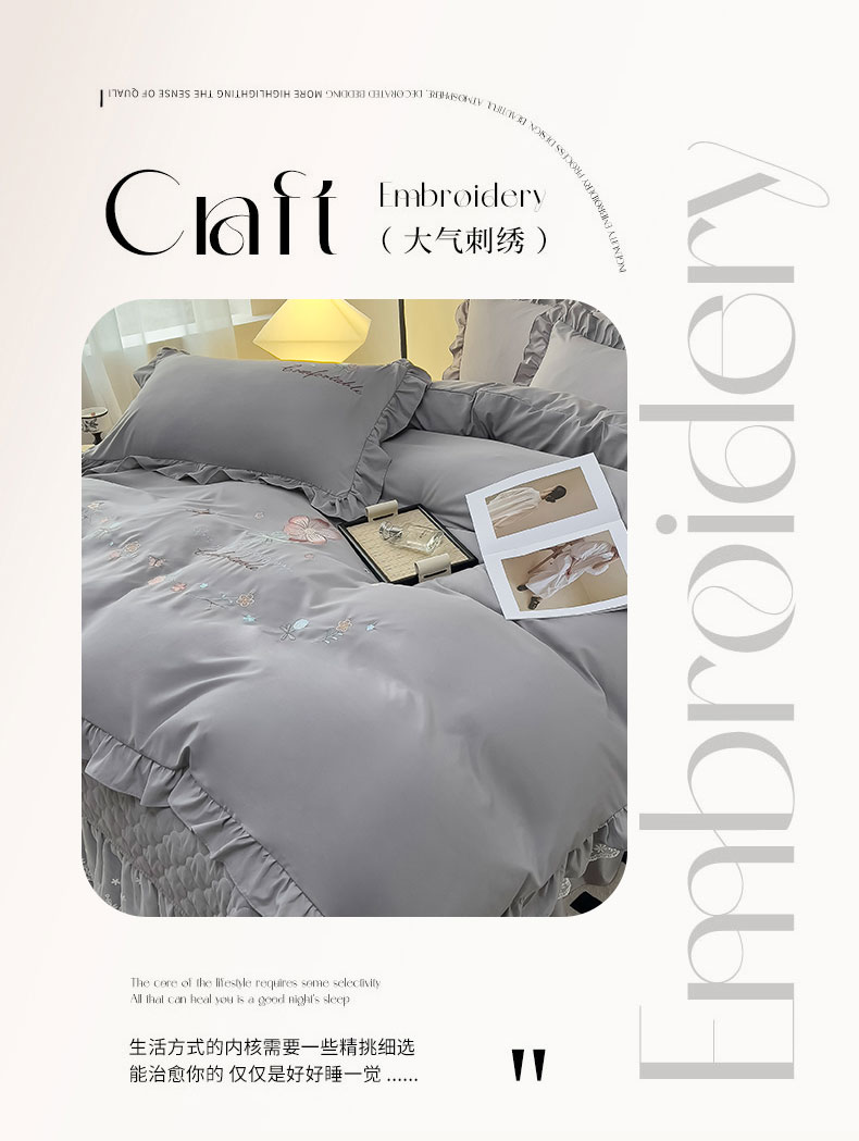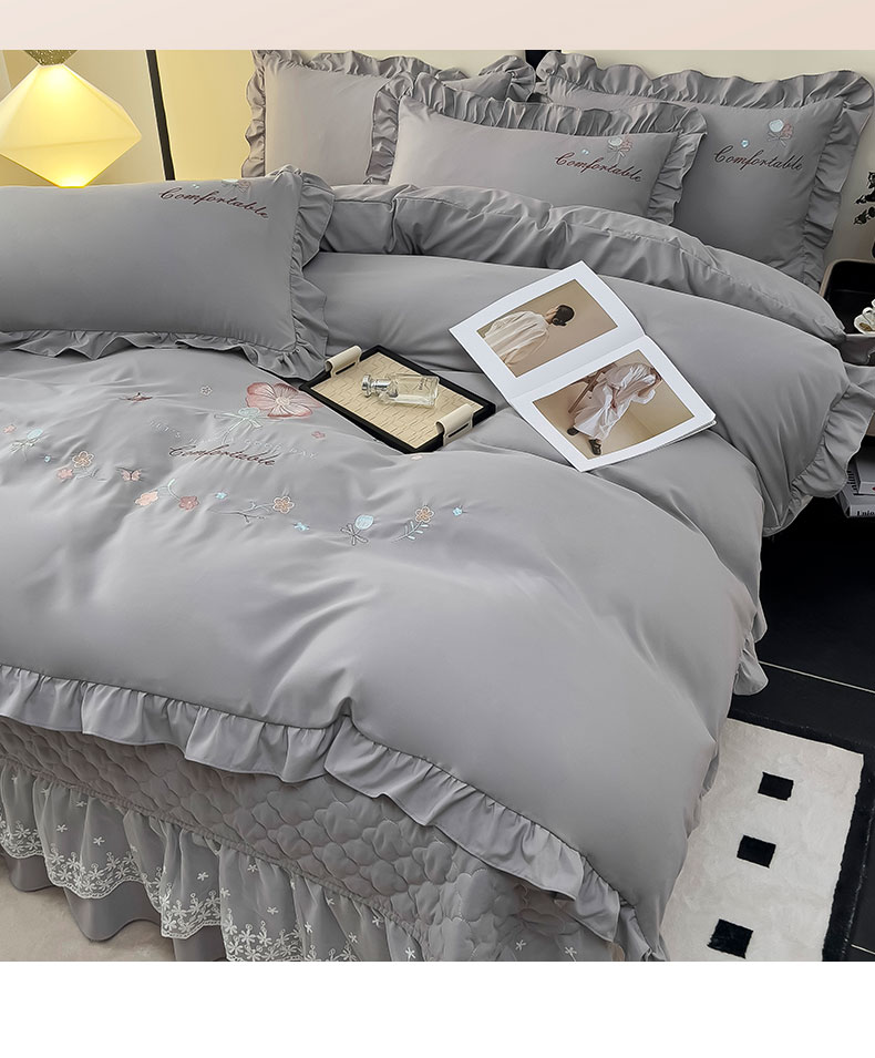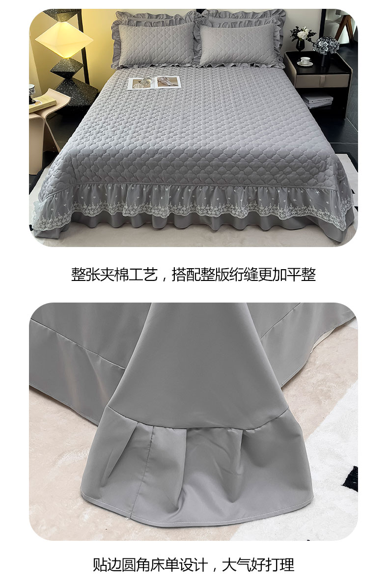 2025新款韩版刺绣花边夹棉床盖蕾丝边四件套 盛若花语-浅灰