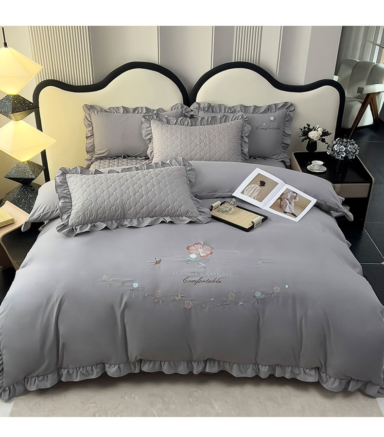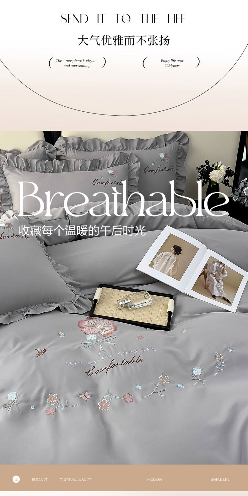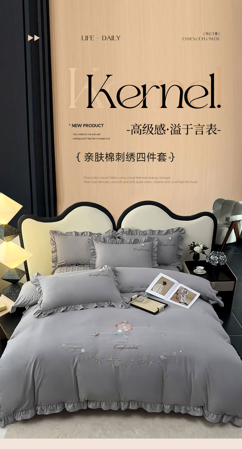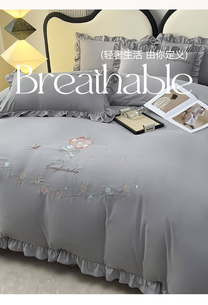 2025新款韩版刺绣花边夹棉床盖蕾丝边四件套 盛若花语-浅灰