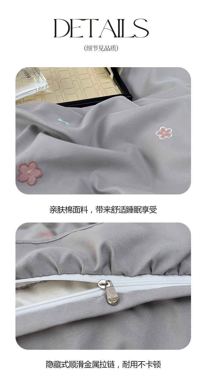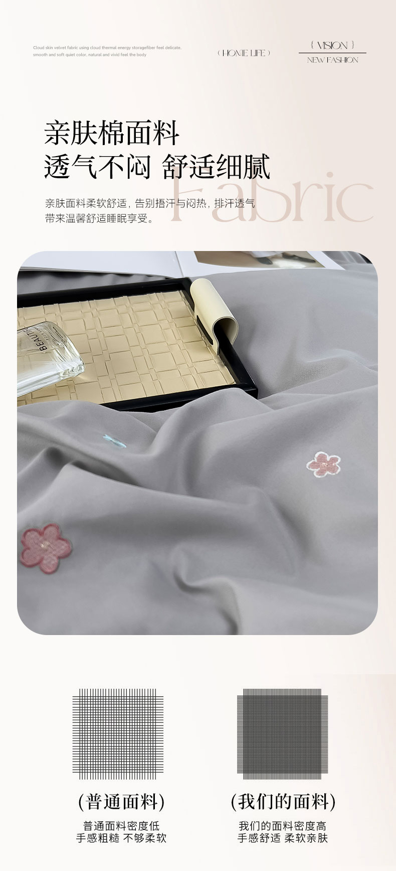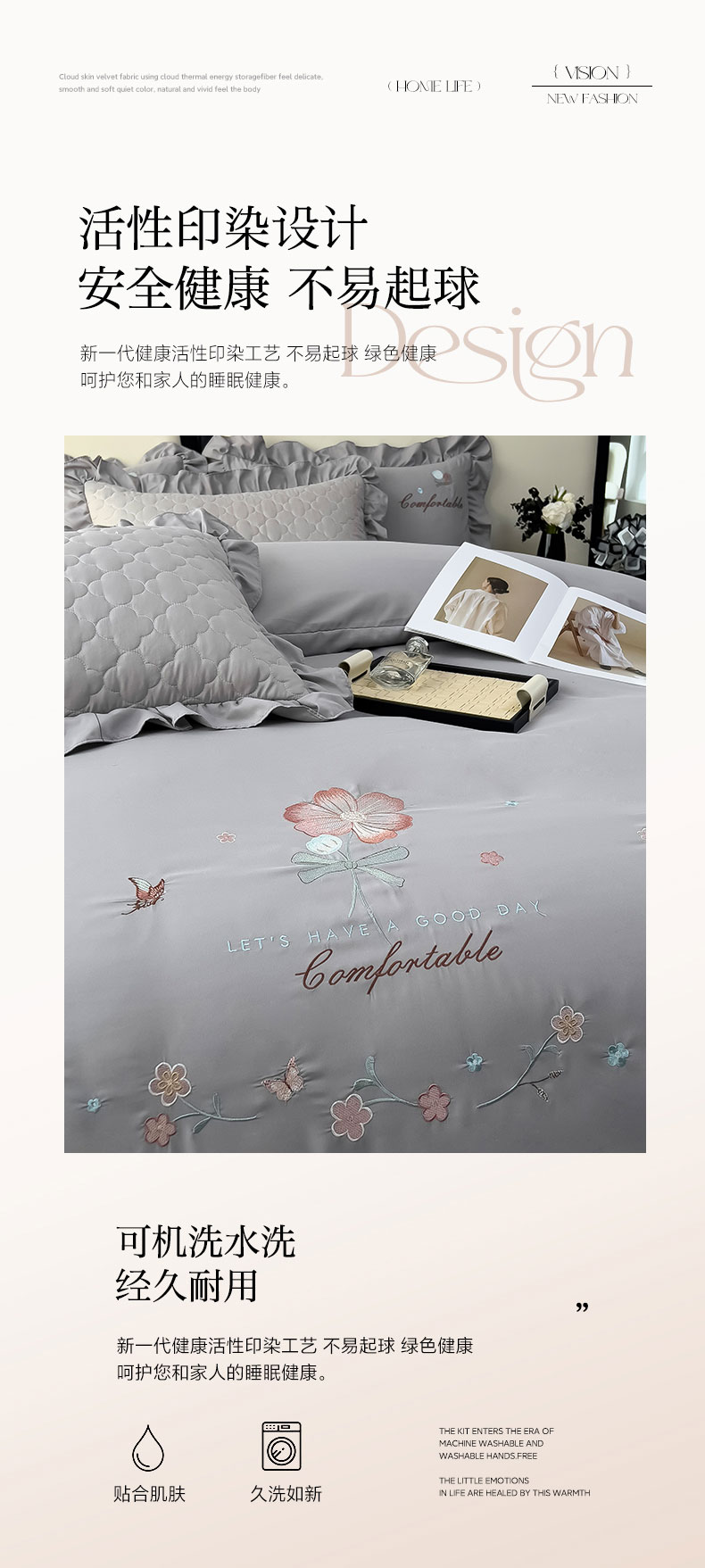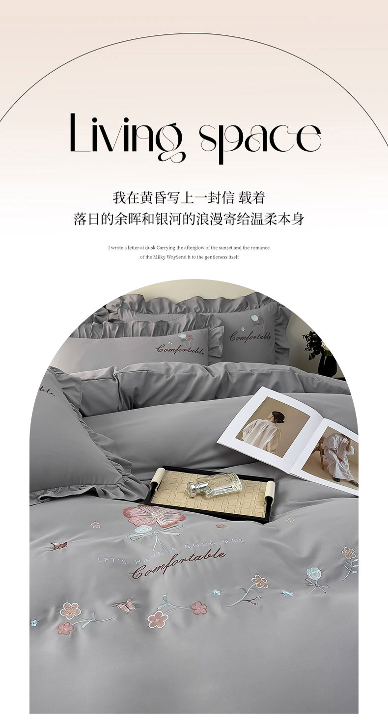 2025新款韩版刺绣花边夹棉床盖蕾丝边四件套 盛若花语-浅灰
