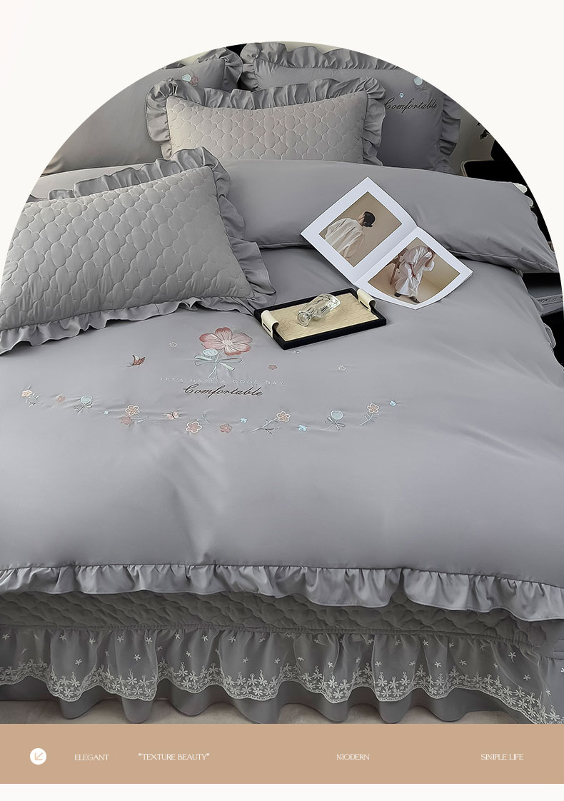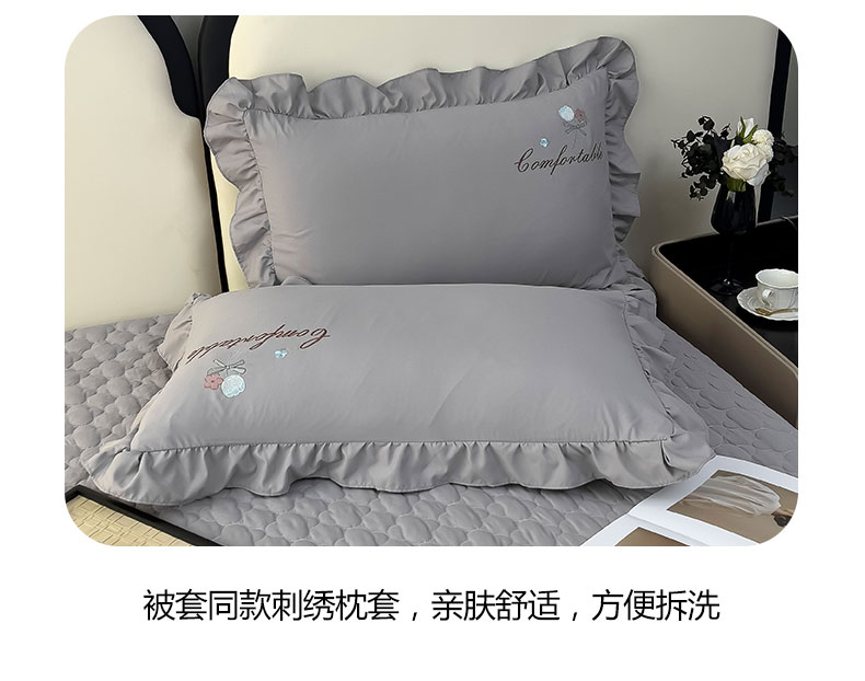 商品名称:2025新款韩版刺绣花边夹棉床盖蕾丝边四件套 盛若花语-浅灰