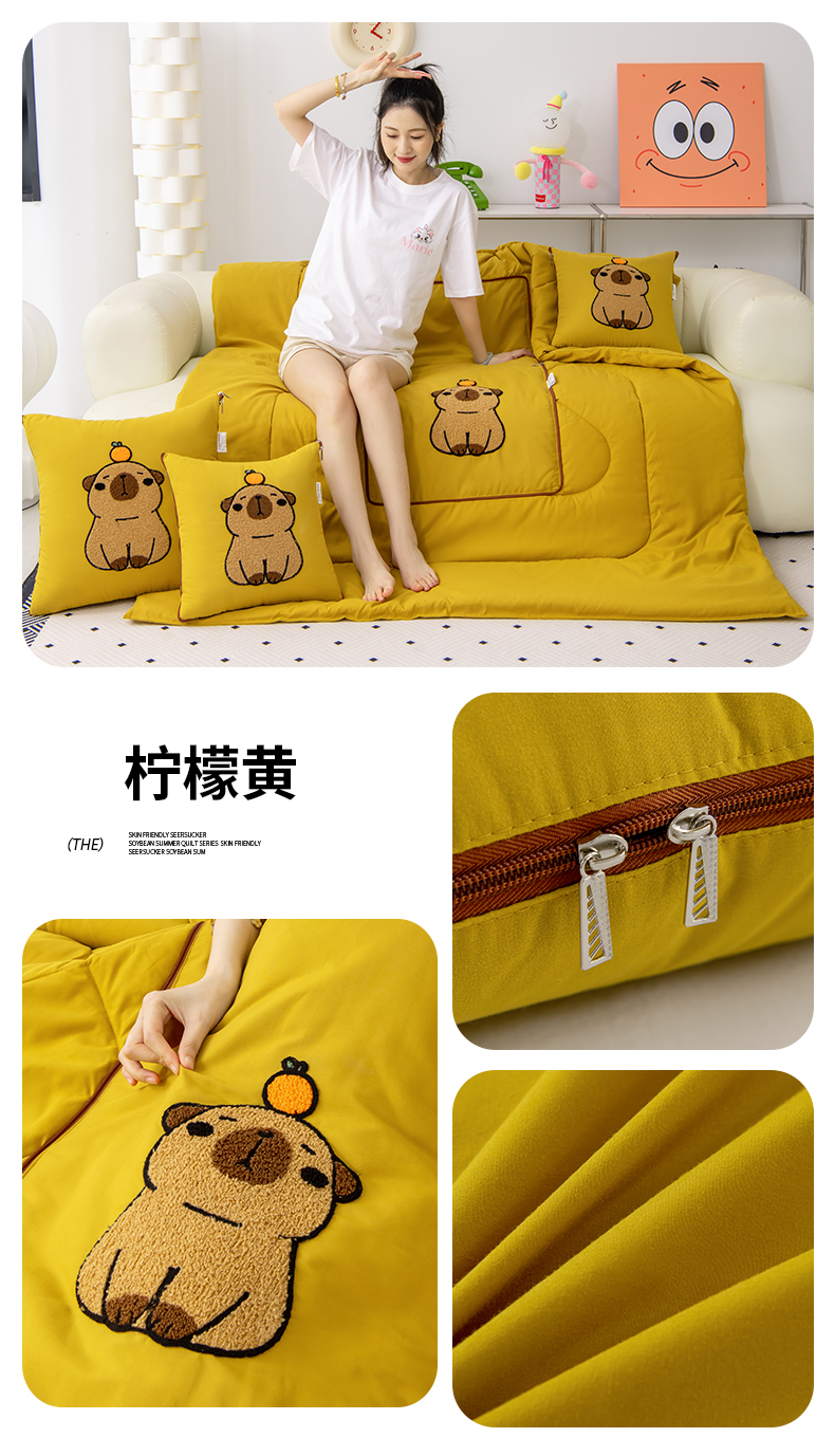 宝马家纺(原梦童画)2025新款卡皮巴拉四季款磨毛毛巾绣抱枕被 柠檬黄