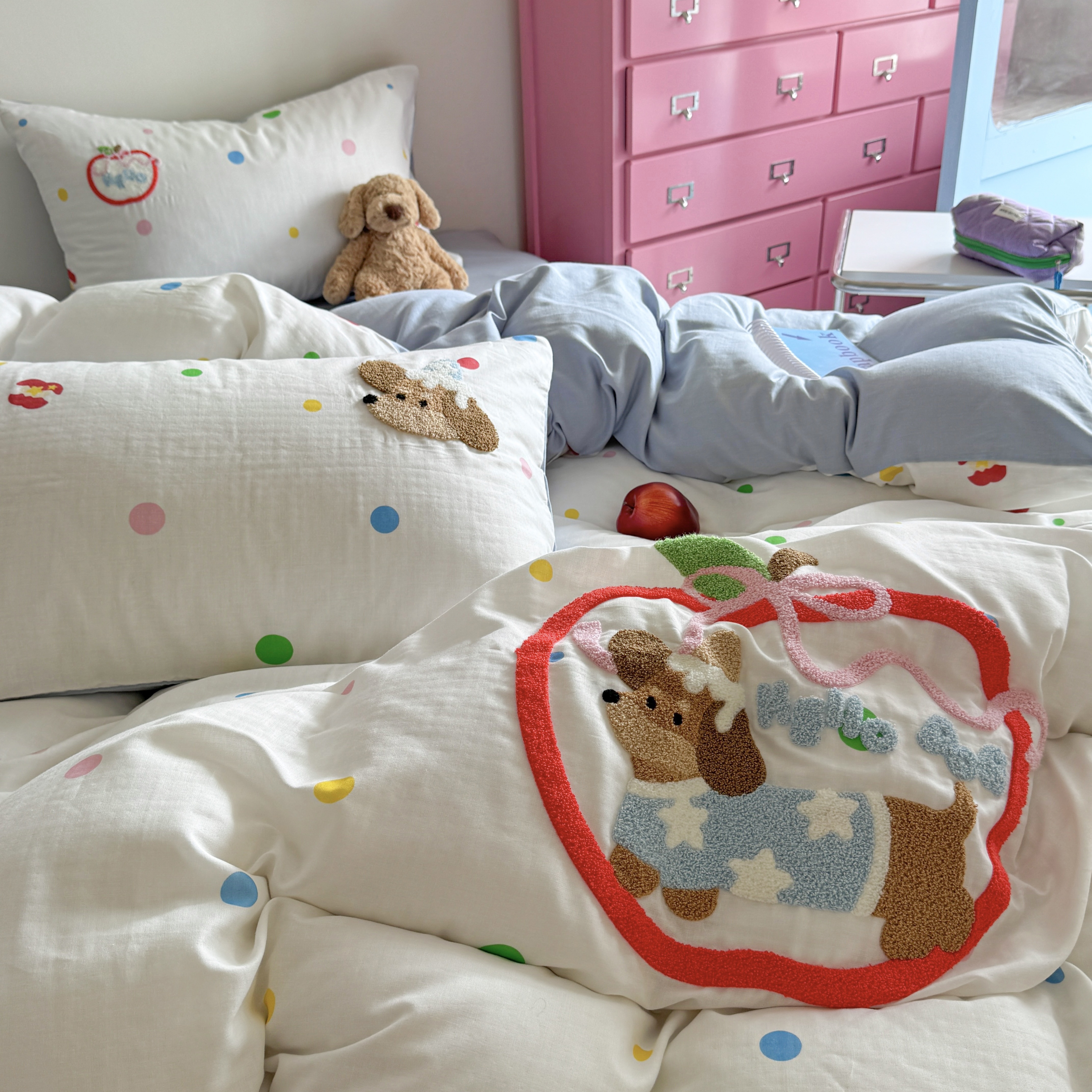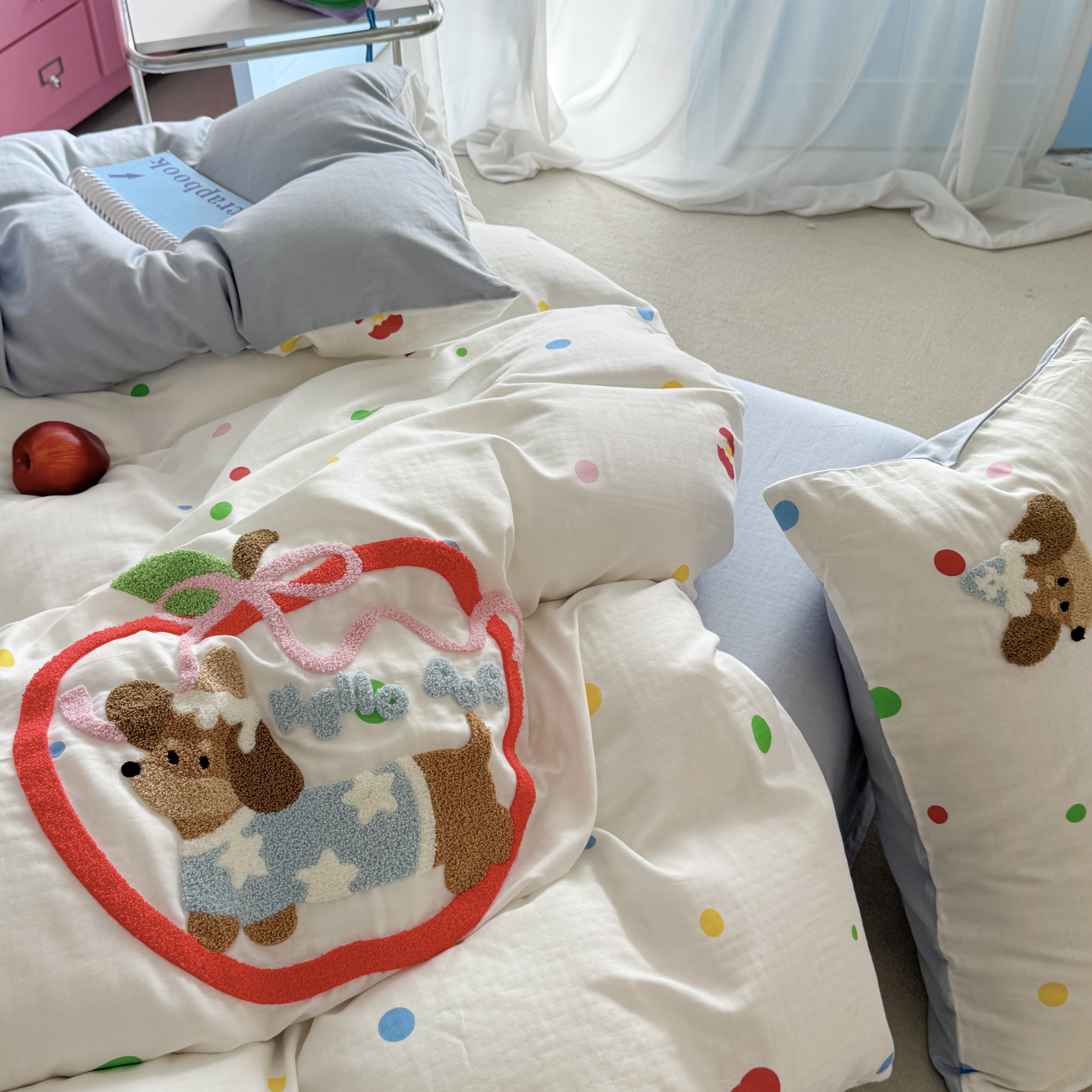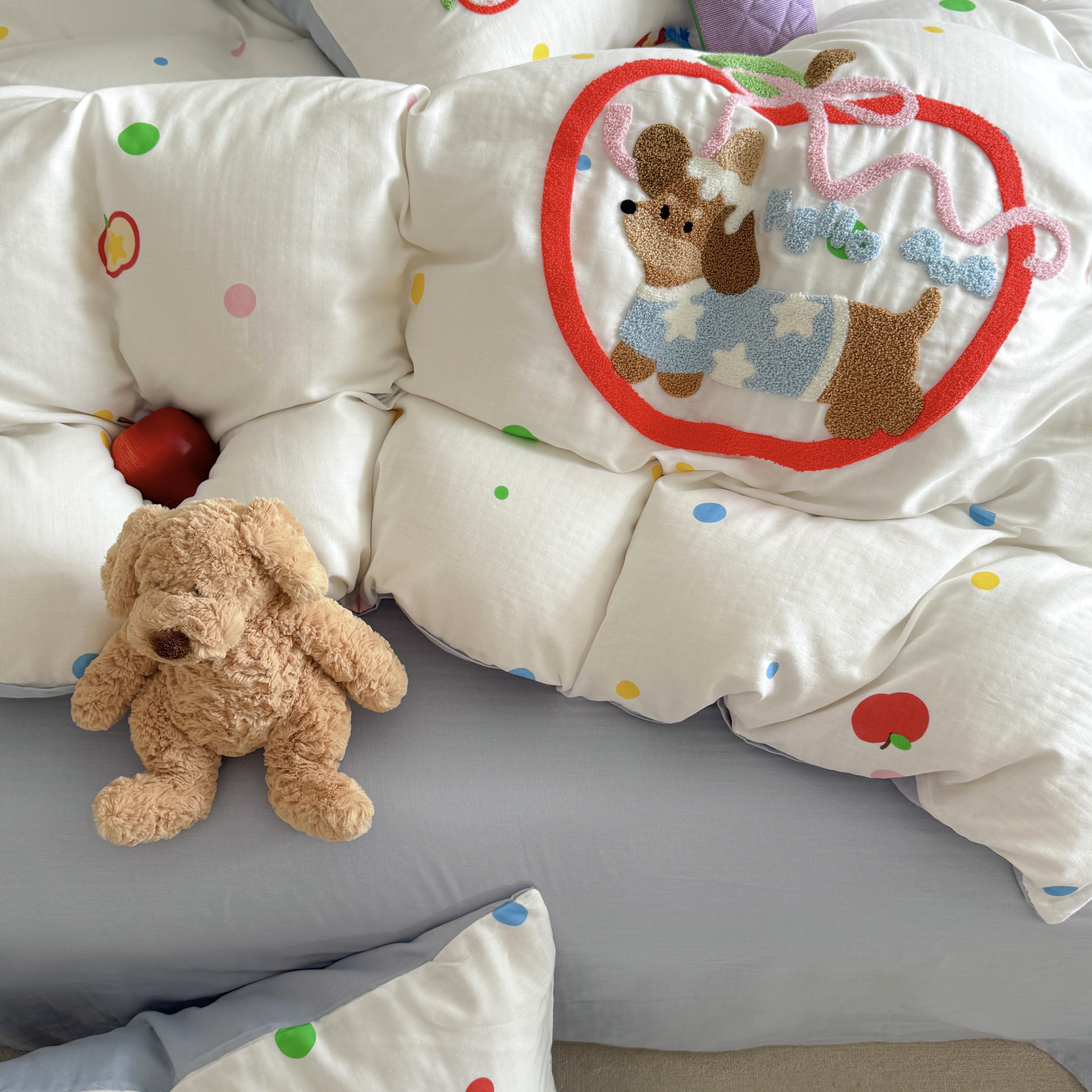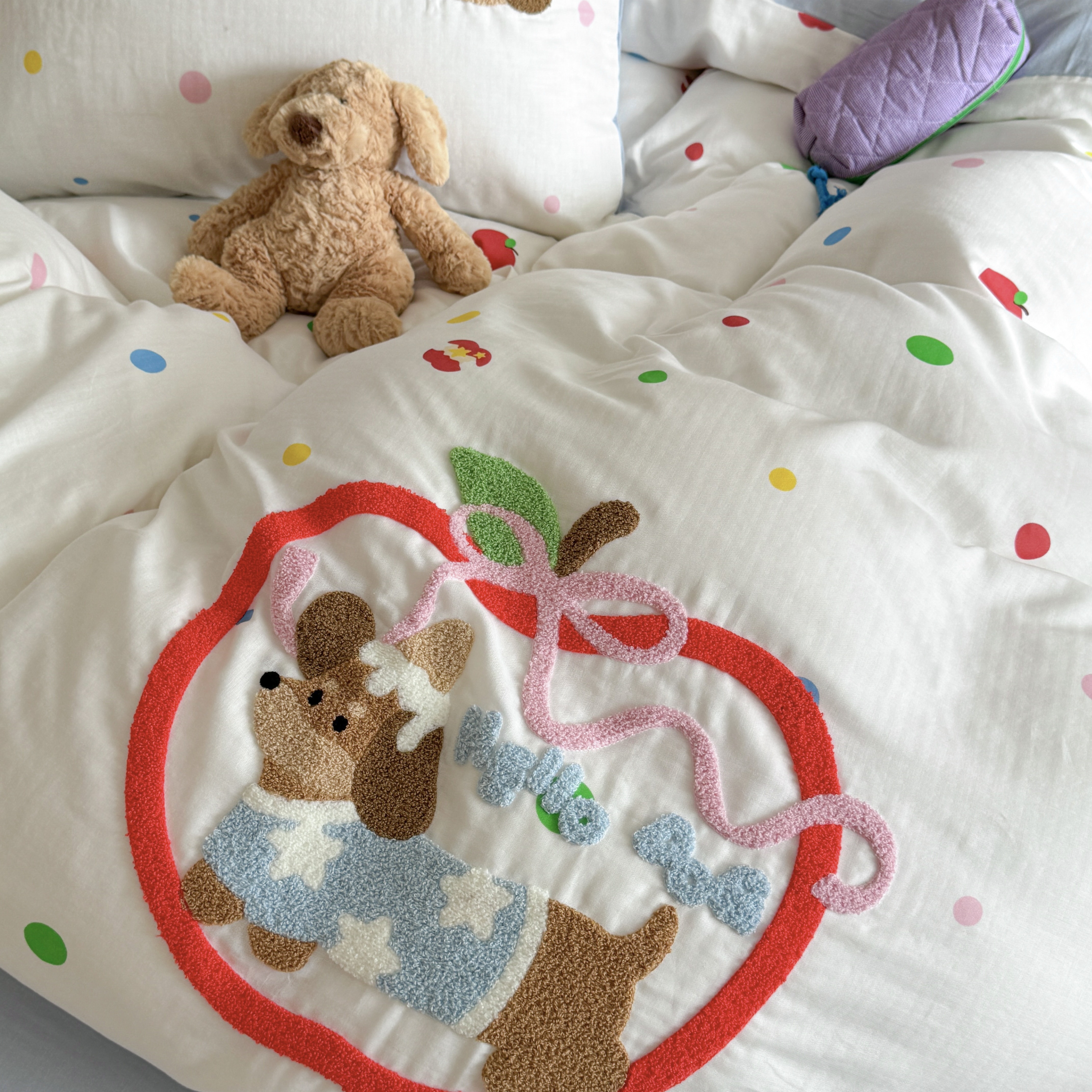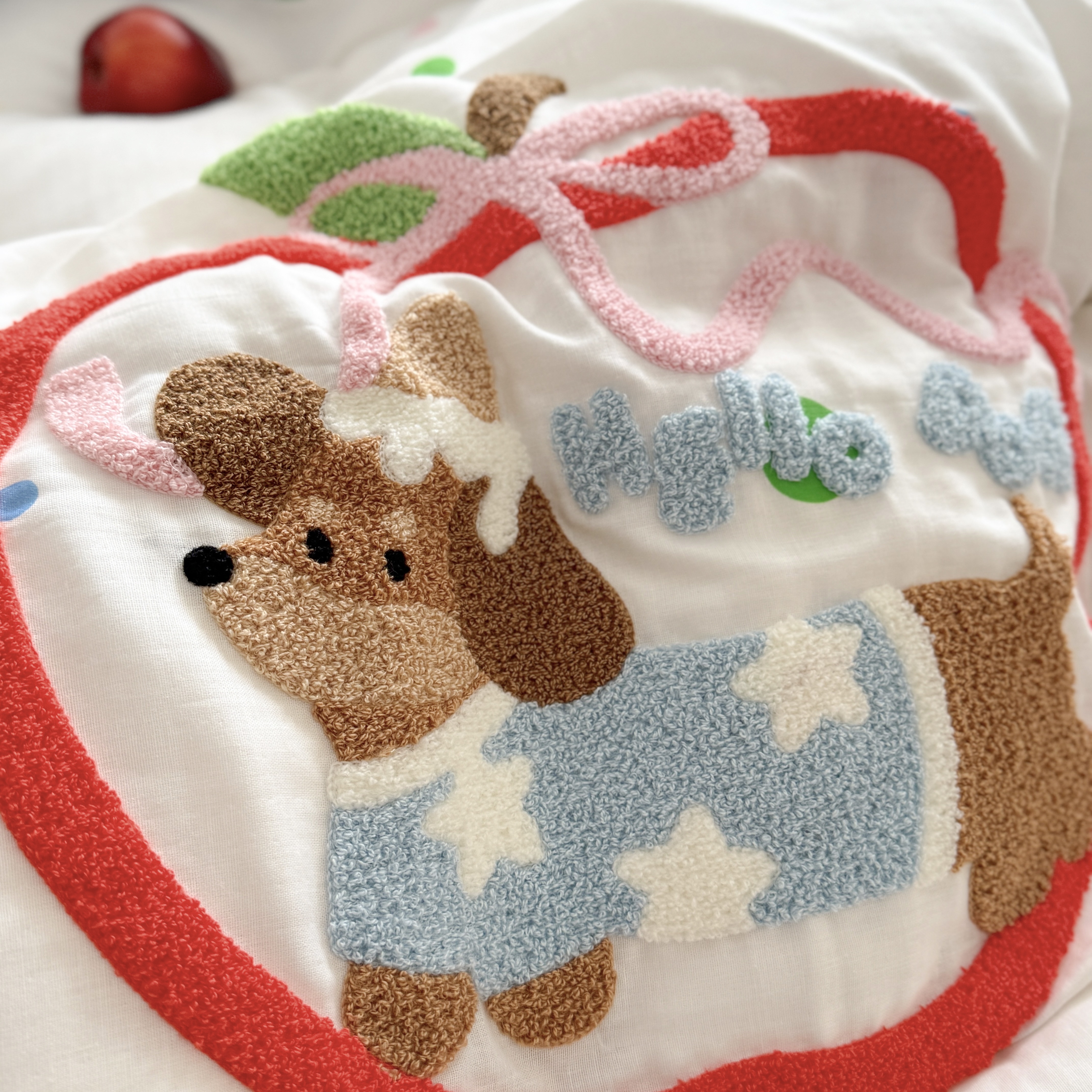 柚子 2025春夏新款全棉纯棉双层纱毛巾绣四件套 苹果狗